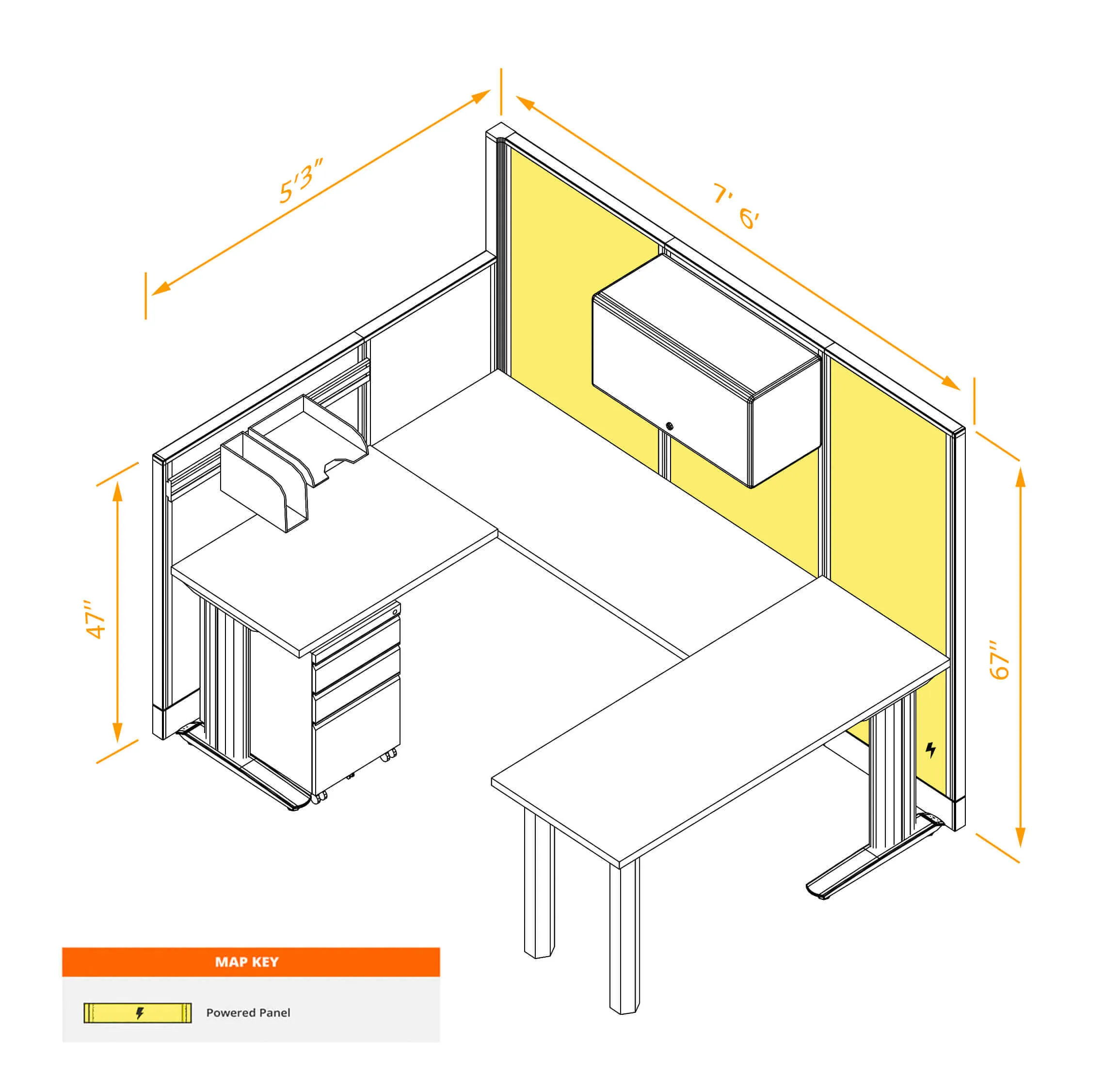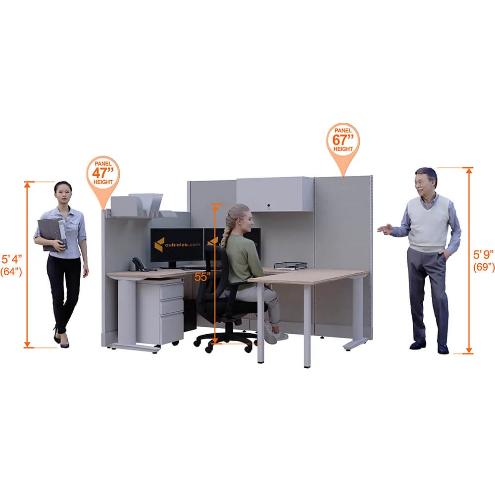 This configuration includes one U-shaped workstation with storage, surrounded by 47'H and 67”H cubicle walls partitions for solitude as indicated.