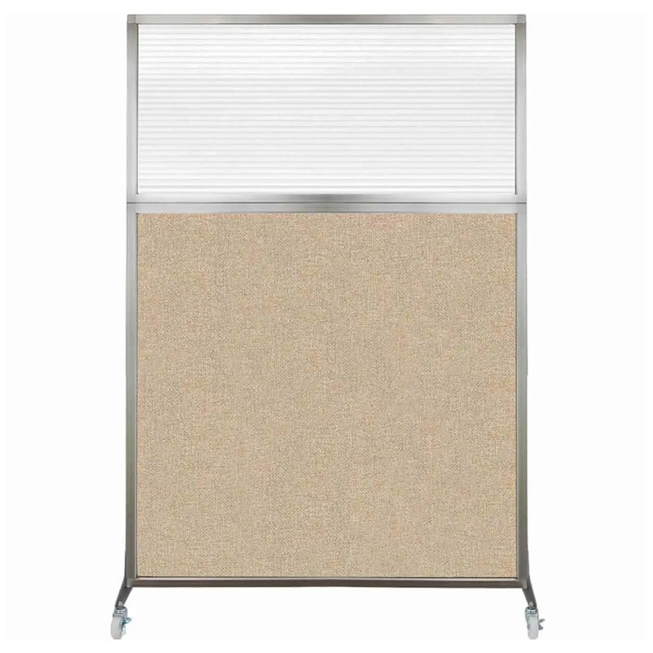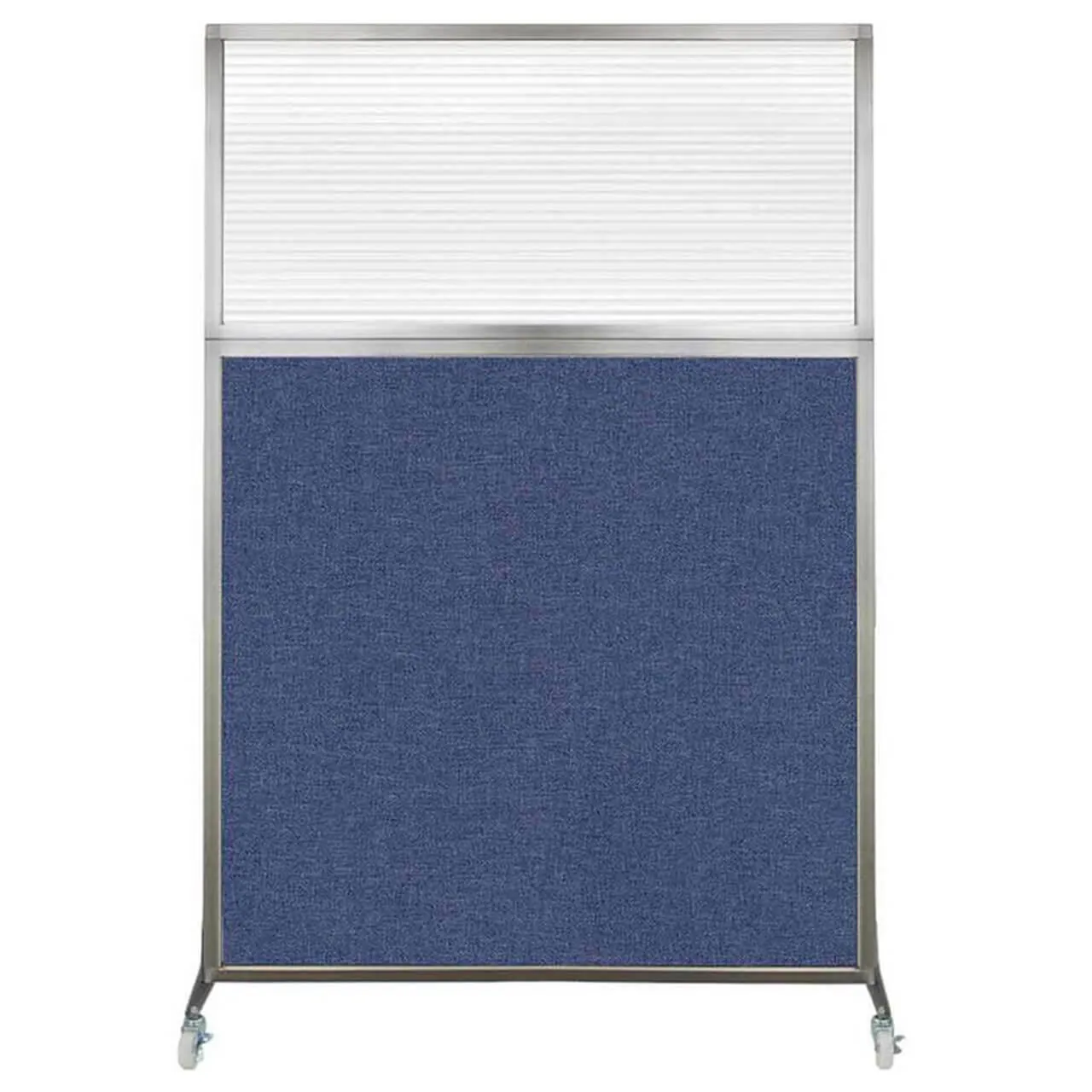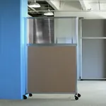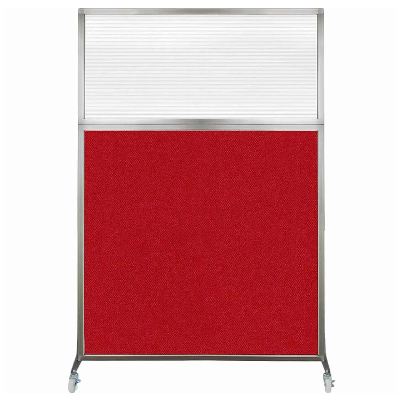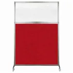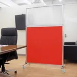 The acoustical fabric of these window room dividers come in the following variants: Beige, Black, Navy Blue, Charcoal Gray, Red, Lime Green and Cerulean. While the core of the panels is of fiberglass to enhance sound-dampening capabilities. The window is of clear fluted polycarbonate and the frame is of anodized aluminum.