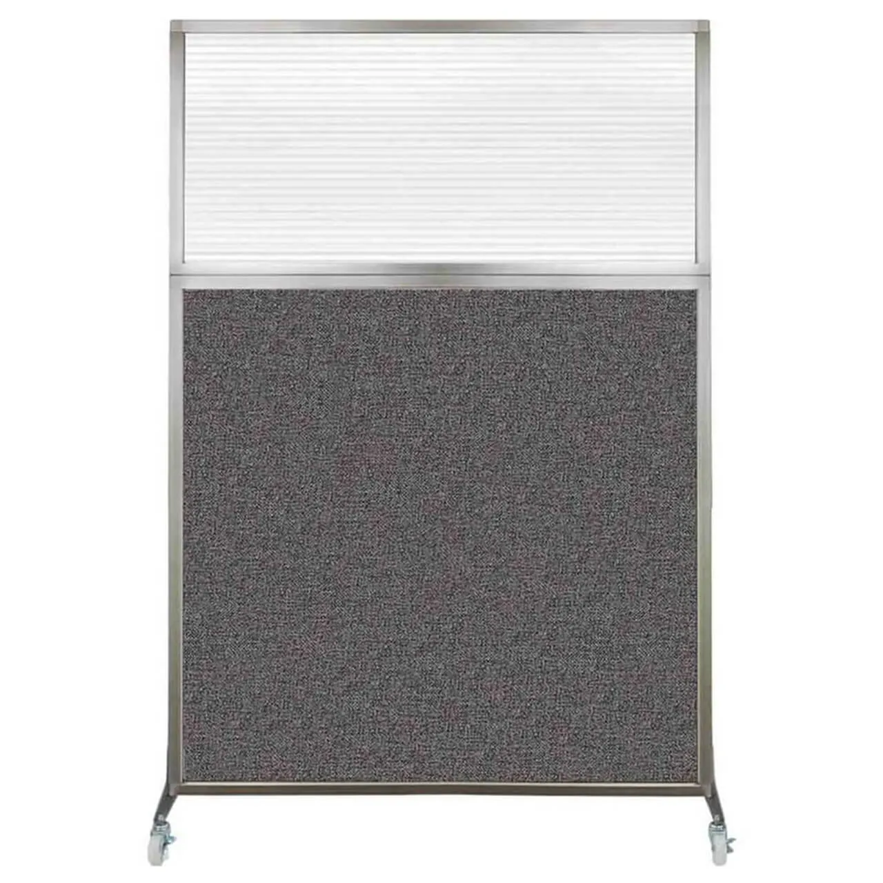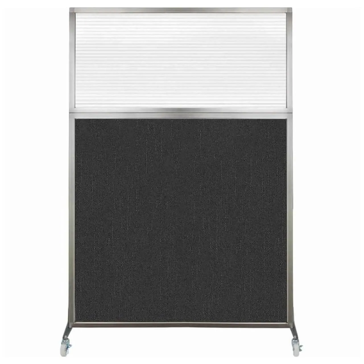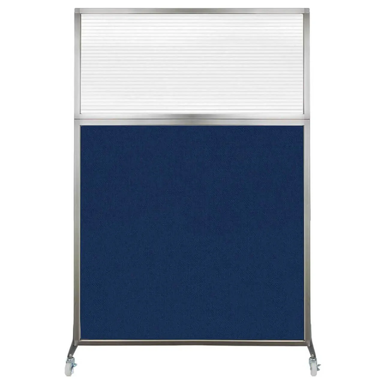 The acoustical fabric of these window room dividers come in the following variants: Beige, Black, Navy Blue, Charcoal Gray, Red, Lime Green and Cerulean. While the core of the panels is of fiberglass to enhance sound-dampening capabilities. The window is of clear fluted polycarbonate and the frame is of anodized aluminum.