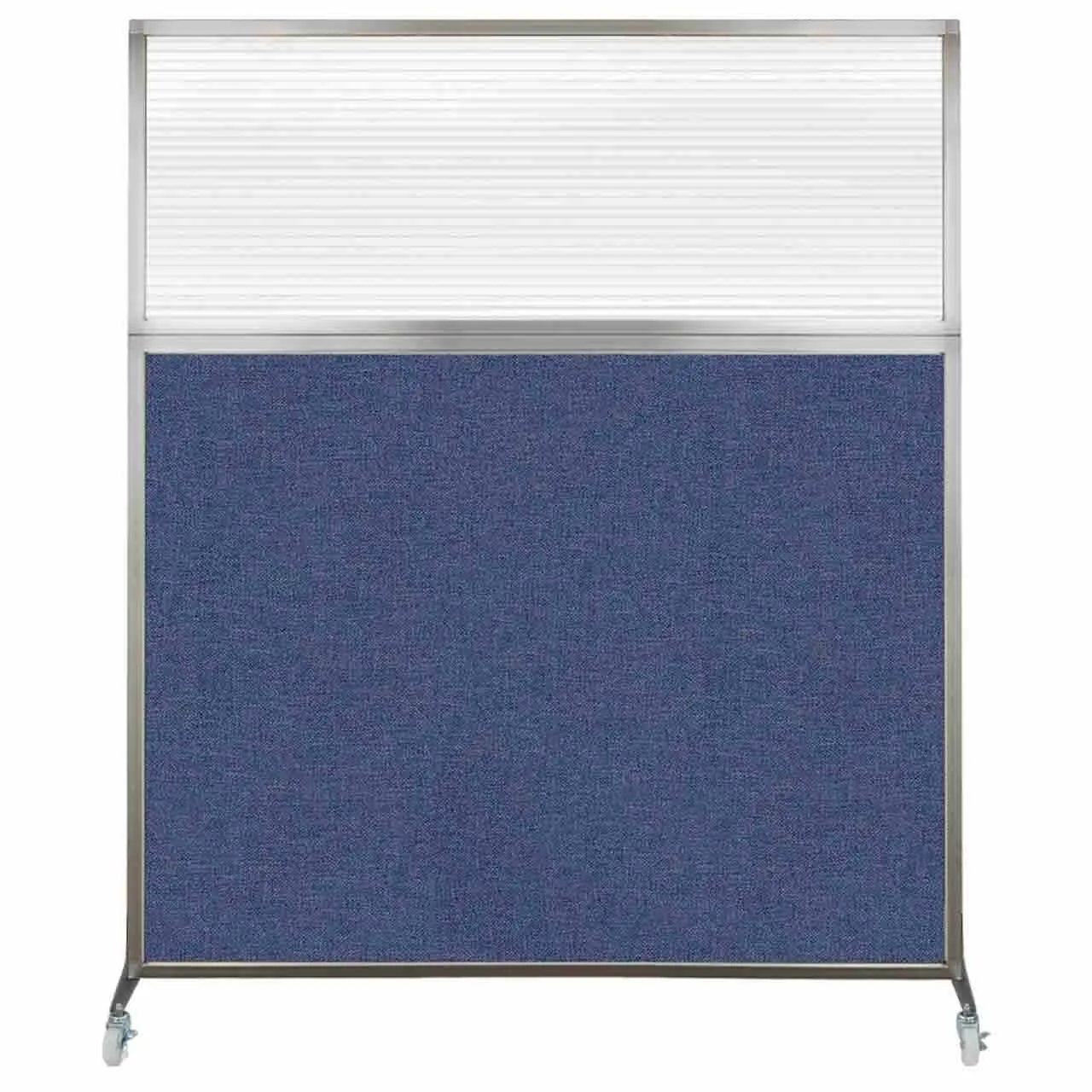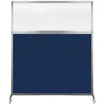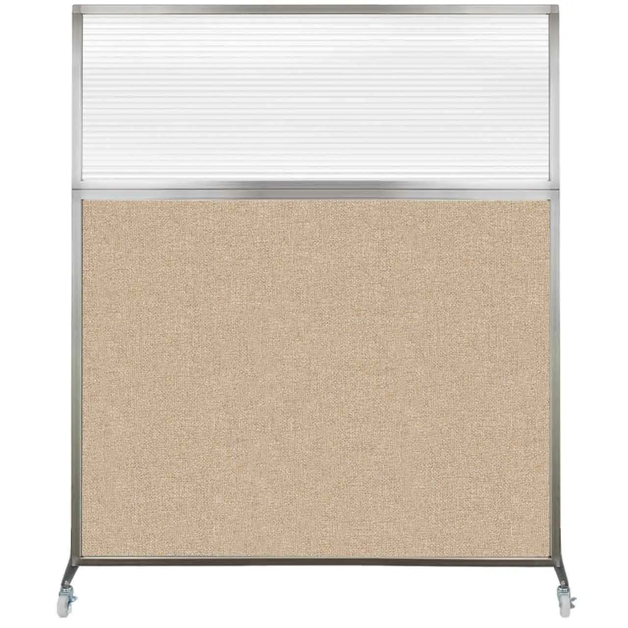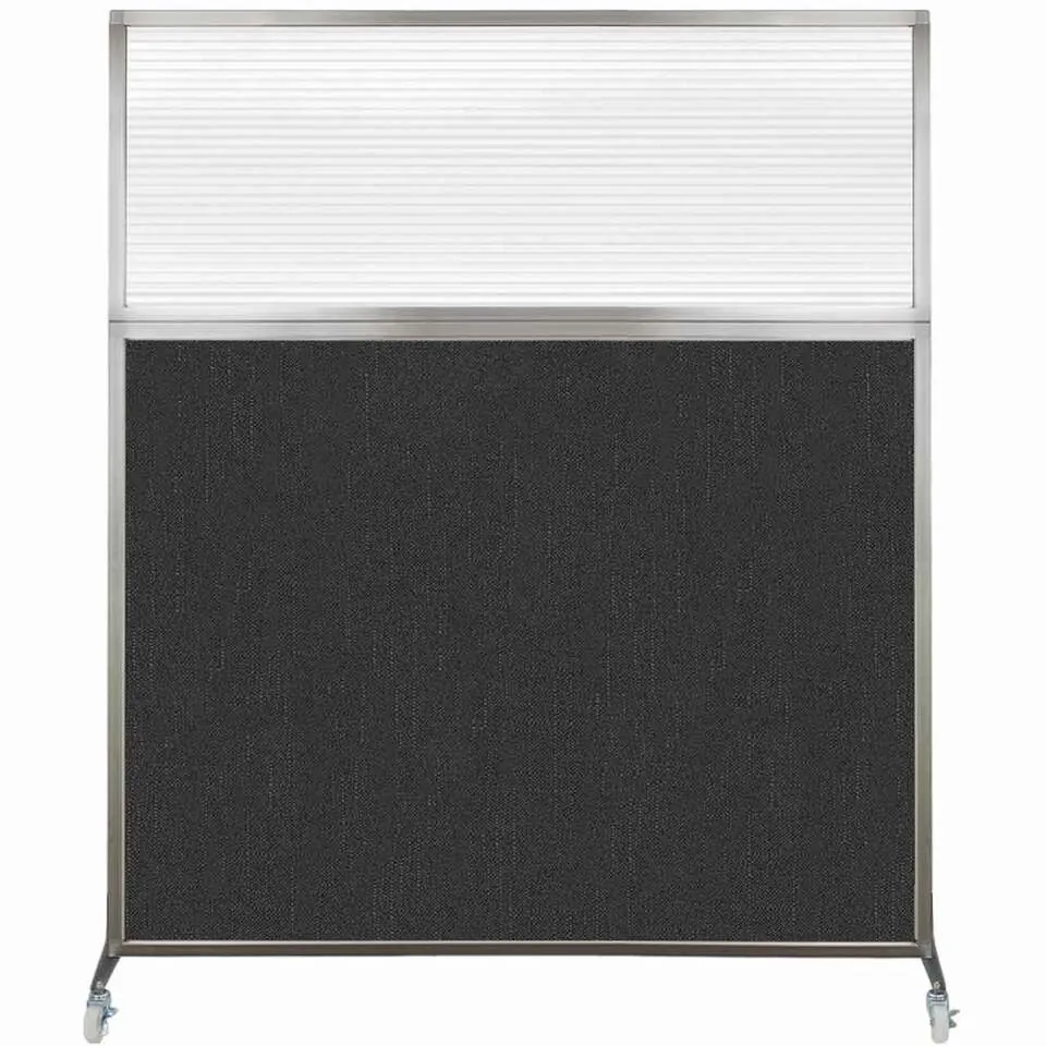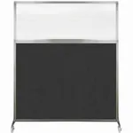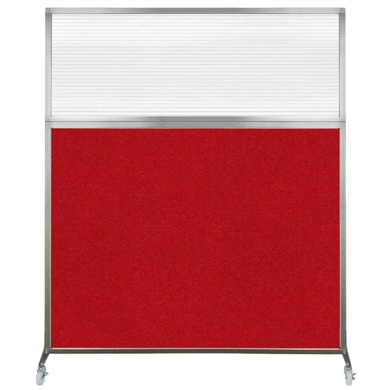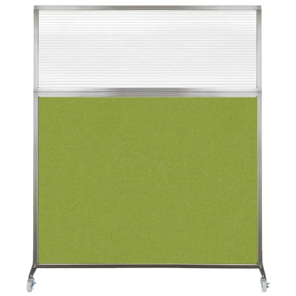 The acoustical fabric of these window room dividers come in the following variants: Beige, Black, Navy Blue, Charcoal Gray, Red, Lime Green and Cerulean. While the core of the panels is of fiberglass to enhance sound-dampening capabilities. The window is of clear fluted polycarbonate and the frame is of anodized aluminum.