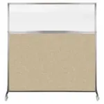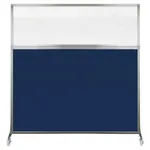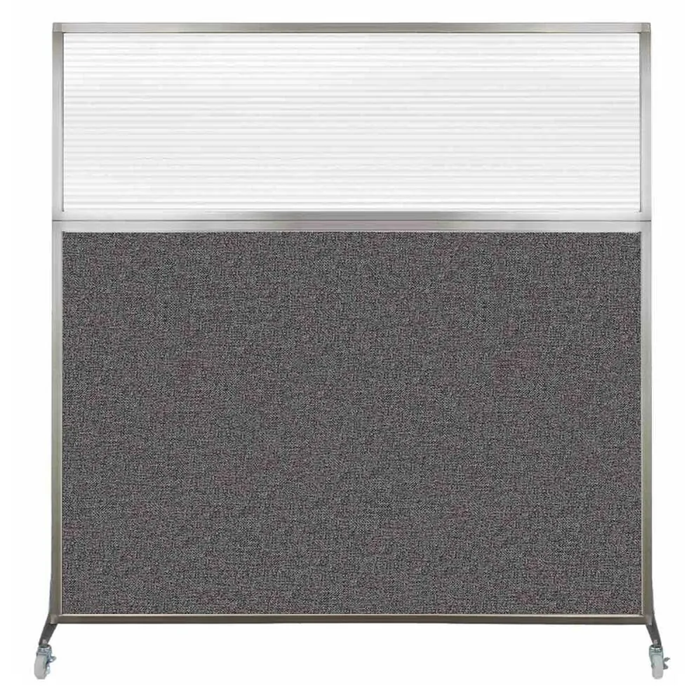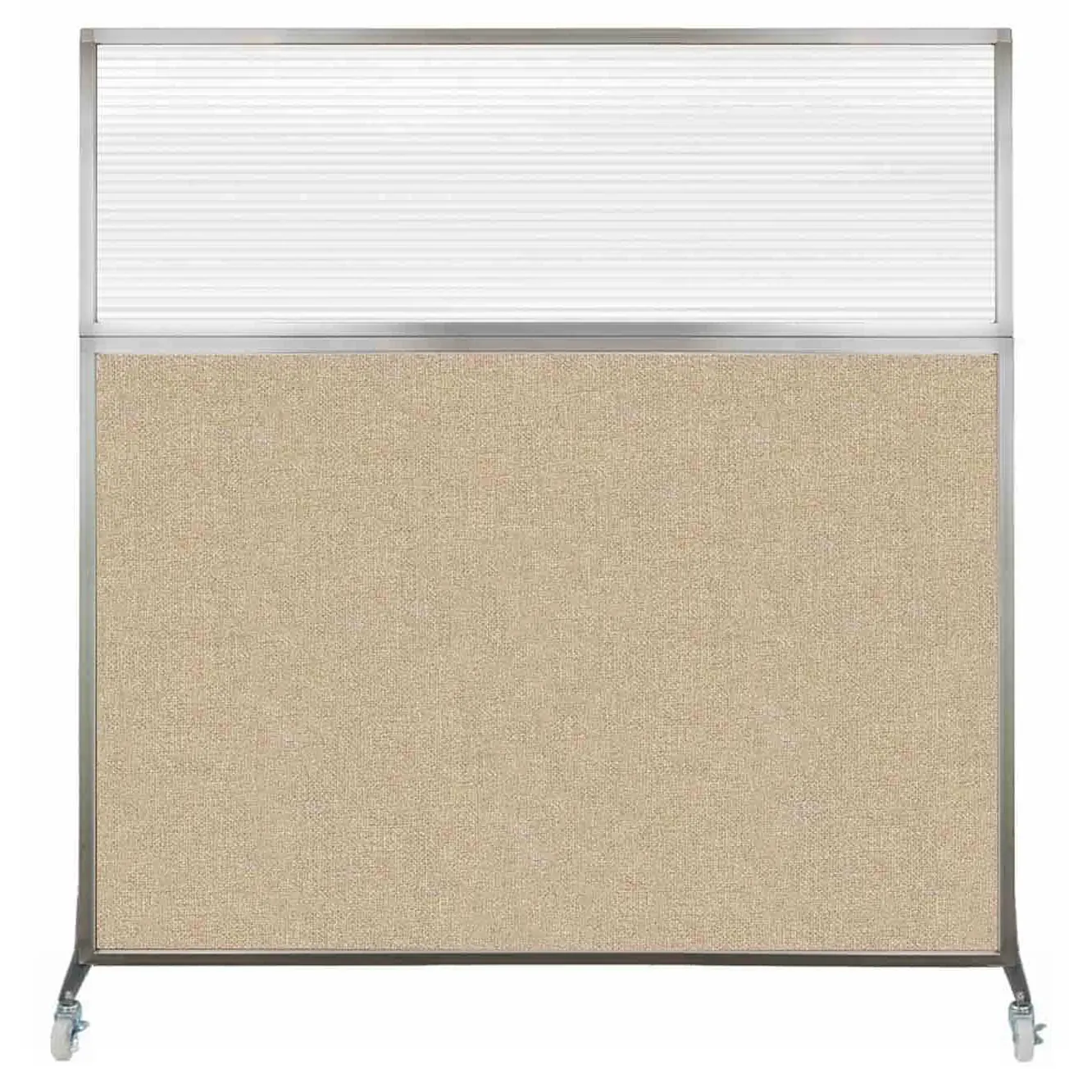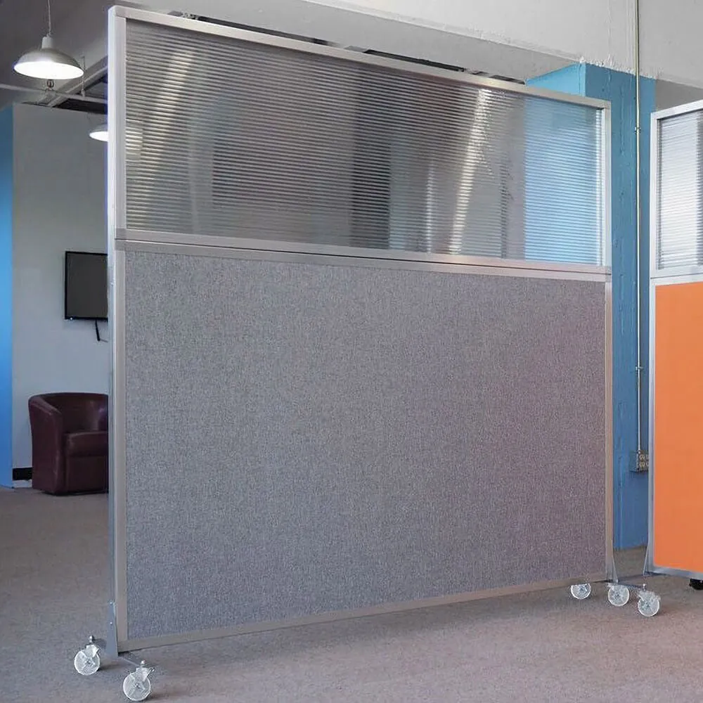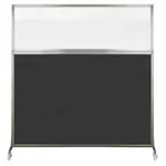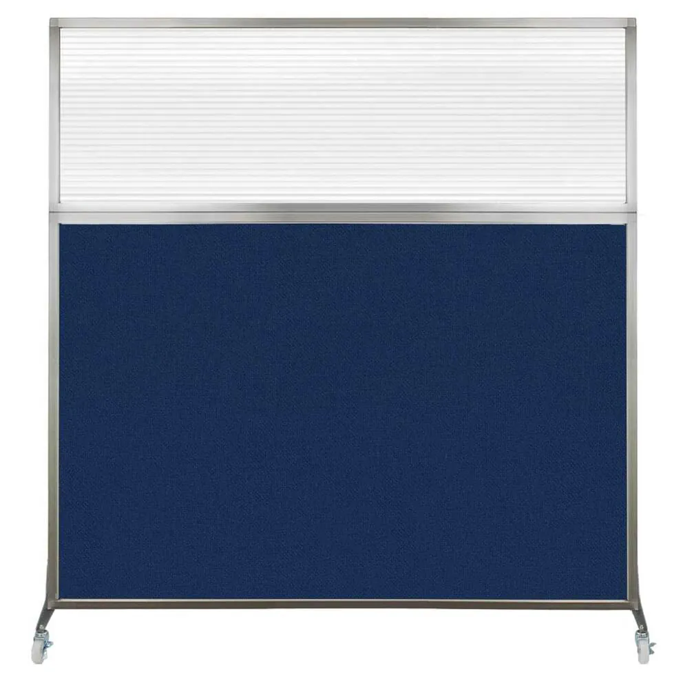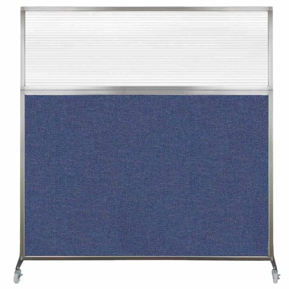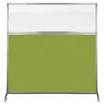 The acoustical fabric of these window room dividers come in the following variants: Beige, Black, Navy Blue, Charcoal Gray, Red, Lime Green and Cerulean. While the core of the panels is of fiberglass to enhance sound-dampening capabilities. The window is of clear fluted polycarbonate and the frame is of anodized aluminum.