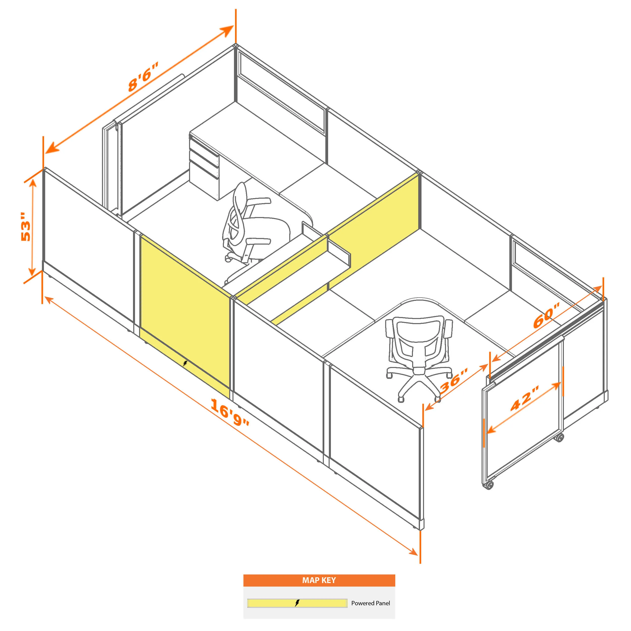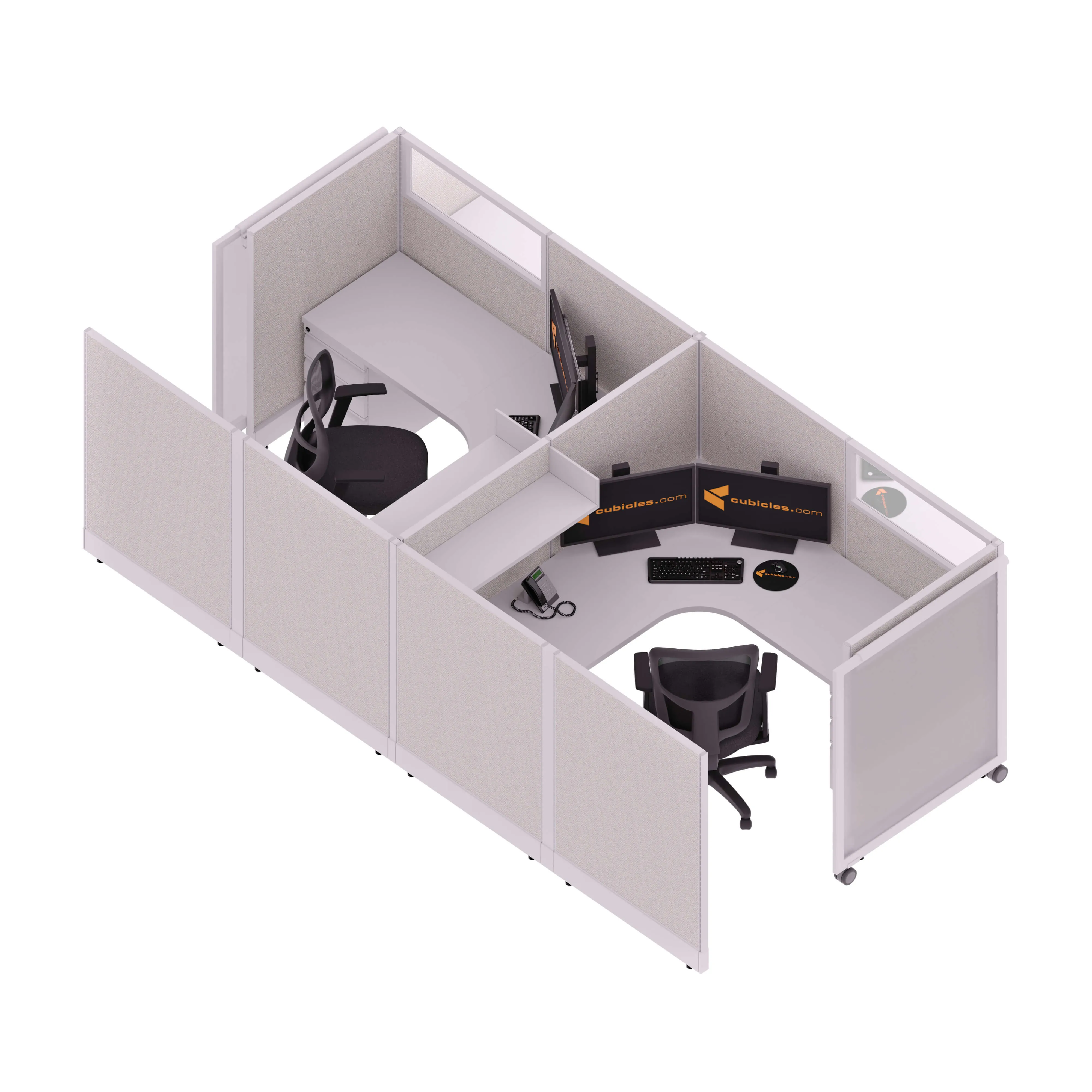 This configuration includes 2 L-shaped workstation with storage in a singular arrangement, enclosed by 53”H cubicle walls and a sliding door partition that grant moderate privacy. Want higher? Go with 67”H.