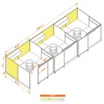 This configuration includes 3 L-shaped workstation with storage in a singular arrangement, enclosed by 67”H cubicle walls and a sliding door partition that grant moderate privacy. Want lower? Go with 53”H.