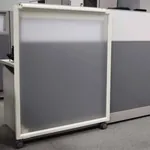 The walls are 2” thick and comprised of a corrugated, honeycombed paperboard interior sandwiched between 1/8” medium-density fiberboards, creating lightweight and sound-absorbent office panels. They are upholstered in Grey/Beige O2™ fabric and possess durable flush-mounted white kick plates.
