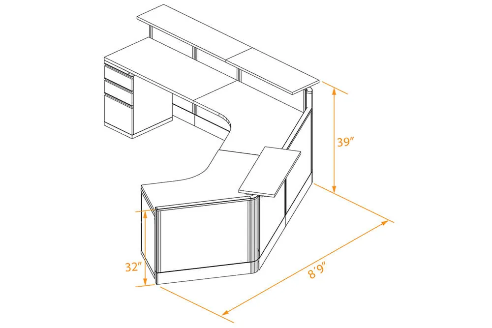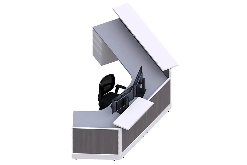 The Angled Reception Desk is a modern and functional solution for offices that need to balance style and accessibility. This desk features a combination of straight and angled worksurfaces, providing a dynamic design that optimizes space and functionality. Its dual-height transaction counters cater to different needs: the taller counter is perfect for standing customers, while the lower counter meets ADA reception desk height requirements, ensuring compliance and providing an inclusive experience for all visitors.