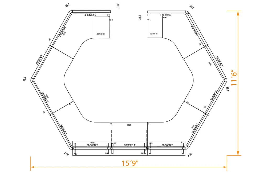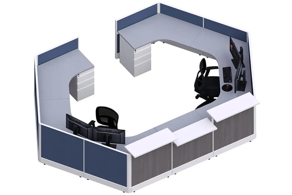 The Full Hexagon Reception Desk for 2 is a bold and functional centerpiece that combines symmetry and style to enhance any office environment. This angled reception desk features a combination of straight and angled worksurfaces, creating a dynamic yet balanced layout. Its central transaction counters include a low ADA-compliant counter for seated visitors and two standing-height counters on either side, ensuring inclusivity and ease of use. This hexagon reception desk is perfectly symmetrical, making it an elegant and professional addition to modern reception spaces.