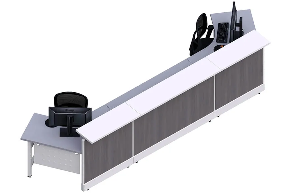 The Long Reception Desk for Two is a modern and functional centerpiece for professional workspaces that prioritize both collaboration and efficiency. Designed as an angled reception desk, it features a sophisticated 120-degree bend on either end where the receptionists are seated, ensuring a comfortable and ergonomic setup for two users. The rectangular transaction counter provides ample space for greeting visitors, processing inquiries, and managing office essentials, creating a welcoming and professional atmosphere.