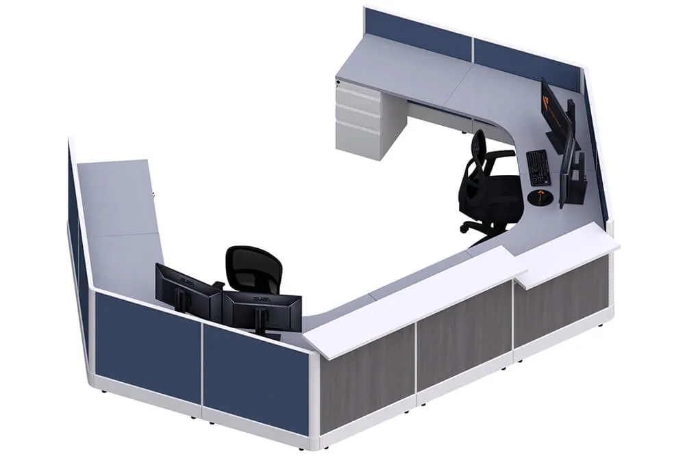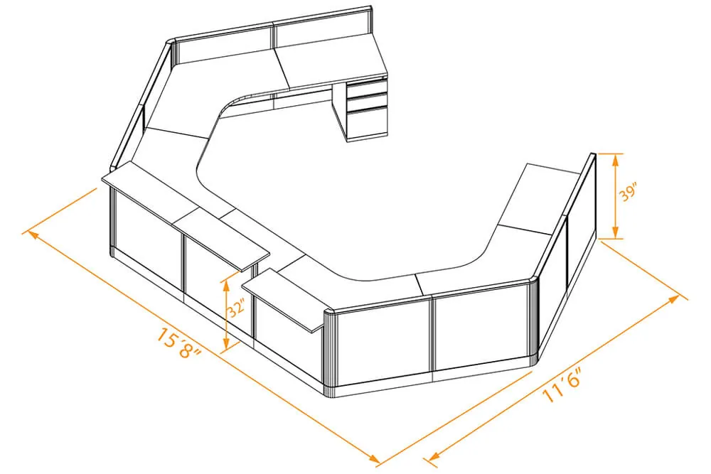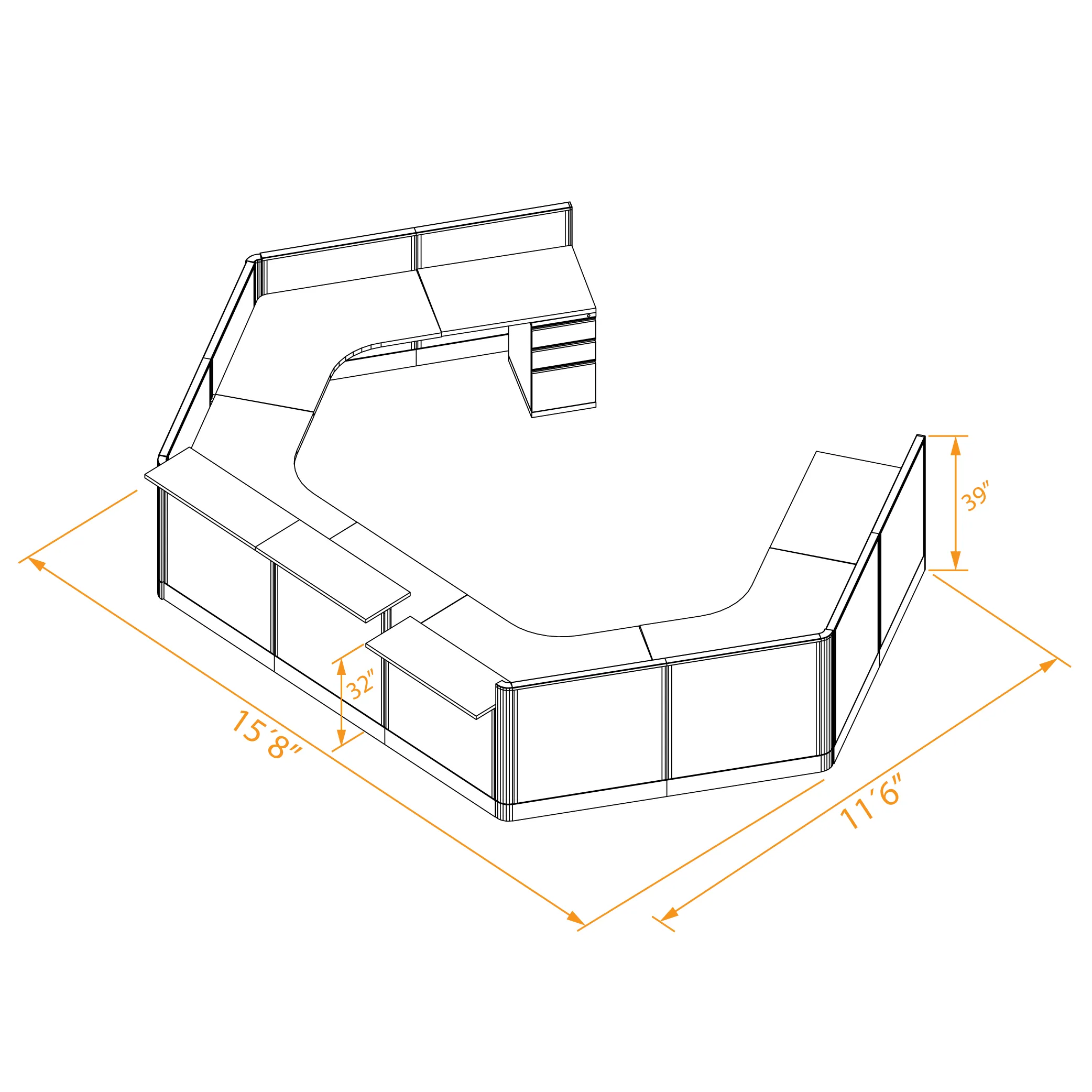 The Open Hexagon Reception Desk combines modern design with functional workspace, offering a distinctive centerpiece for any reception area. This angled reception desk features a unique mix of straight and angled worksurfaces, creating a hexagonal layout with central transaction counters that step in height. The asymmetrical design adds a dynamic visual element while ensuring ergonomic comfort for both visitors and receptionists. Its innovative structure is not only aesthetically appealing but also highly practical for facilitating smooth interactions and maintaining a professional atmosphere.