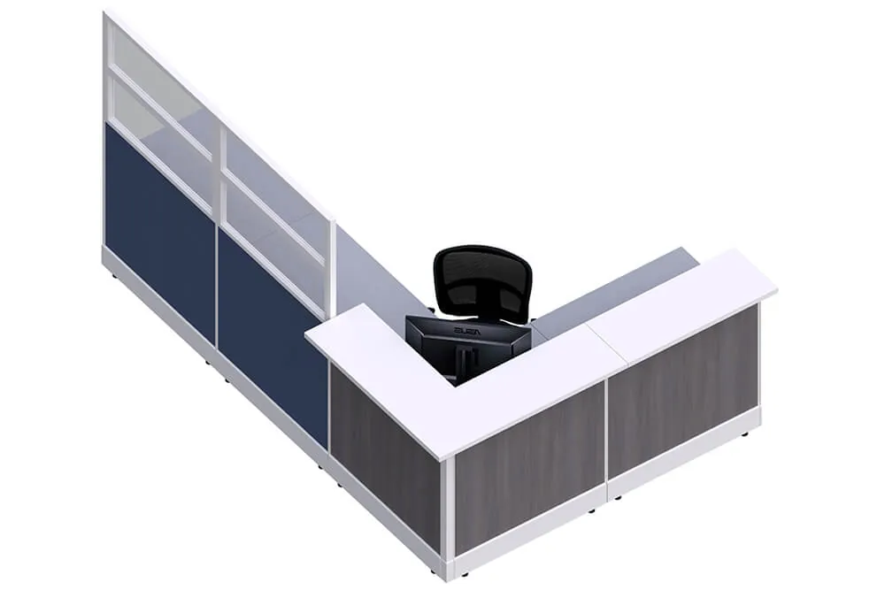 Transform your workspace with the Office Reception Desk L Shape Counter design, a stylish and functional centerpiece for any modern front desk design. This contemporary office reception design configuration combines elegance and utility, featuring a double row of glass cubicle panels on the longer side for privacy while maintaining a professional, open feel.