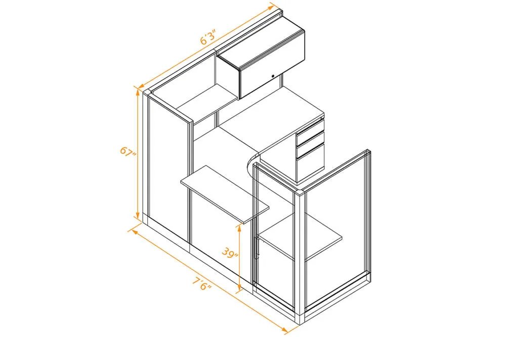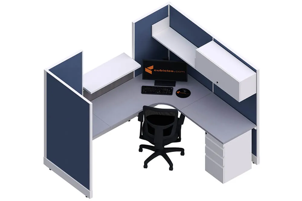 Elevate your front office space with the Compact Reception Desk L Shape design, a functional and stylish workstation designed for smaller reception areas. This cubicle reception desk ensures privacy for the receptionist with tall cubicle panels on both sides, while the thoughtfully placed small transaction counter allows for seamless visitor interaction. The compact design doesn’t compromise on functionality, offering an L Shaped worksurface complete with a storage pedestal, open shelf, and overhead locker for optimal organization and accessibility.