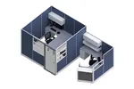 Transparent glass doors and viewing panels maintain visual connection between the two users while preserving privacy, making this setup perfect for collaborative yet independent work environments.