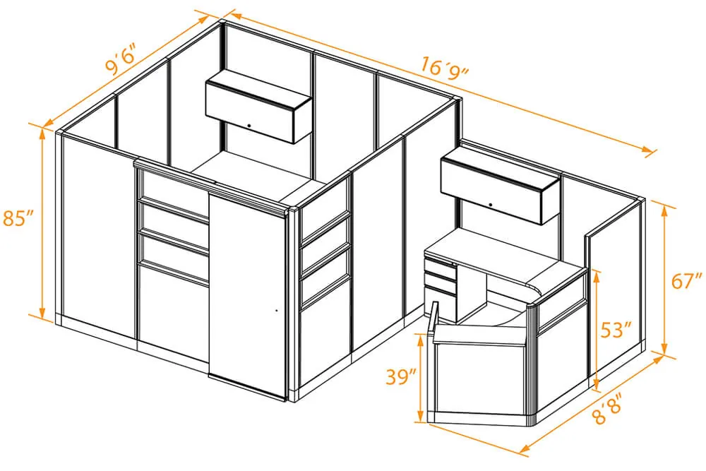 The Private Office with Reception Desk Cubicle is a multifunctional solution designed to streamline productivity and create a professional workspace. This innovative configuration seamlessly combines a Private Office with an attached Reception Desk Cubicle, offering functionality and style in one cohesive design. The private office area features an L-shaped desk, storage pedestal, and overhead storage for efficient organization.
