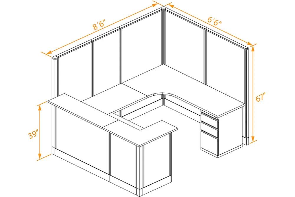The Private U Shaped Reception Desk is the ultimate solution for a functional, stylish, and professional front office space. Designed to enhance reception desk privacy, it features tall cubicle panels on two sides to create a private and focused workspace for the receptionist. The U Shaped worksurface offers ample room for multitasking and organization, while the L shaped counter ensures seamless interaction with visitors, maintaining a welcoming yet professional demeanor. With an integrated storage pedestal, this desk offers a perfect blend of practicality and aesthetic appeal.