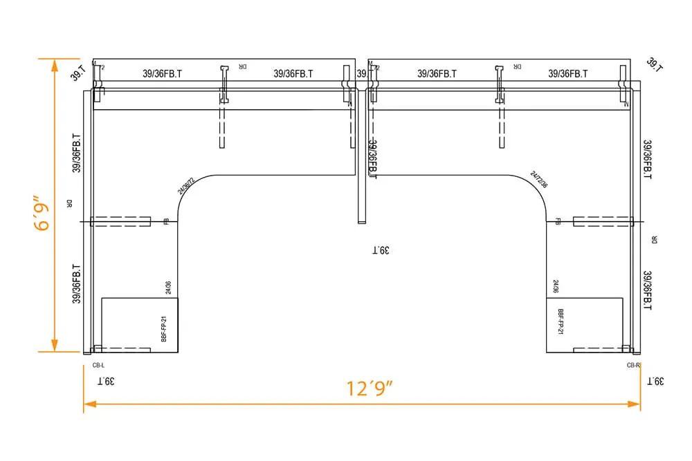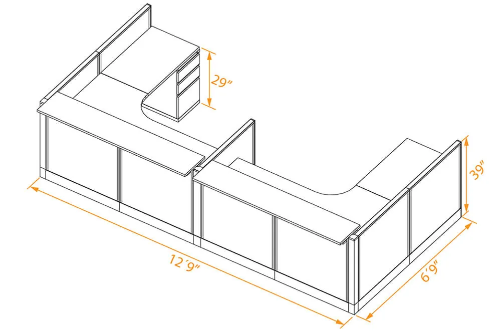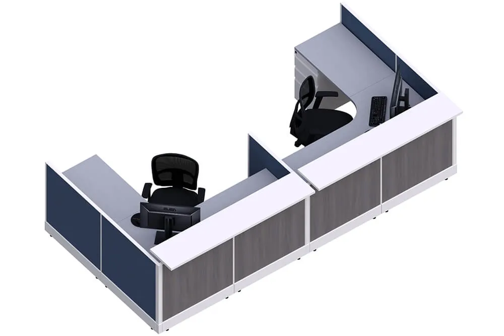 The 2 Person Reception Desk U Shaped design is a functional and stylish solution for busy office environments requiring two receptionists. This symmetrical setup features a central dividing panel that separates the workspaces, ensuring privacy and efficiency. Each workstation is equipped with an L-shaped worksurface and a rectangular transaction counter, offering a comfortable layout for handling daily tasks and welcoming visitors. The counters are designed to meet the standard reception desk height, accommodating both seated and standing interactions for an inclusive experience.