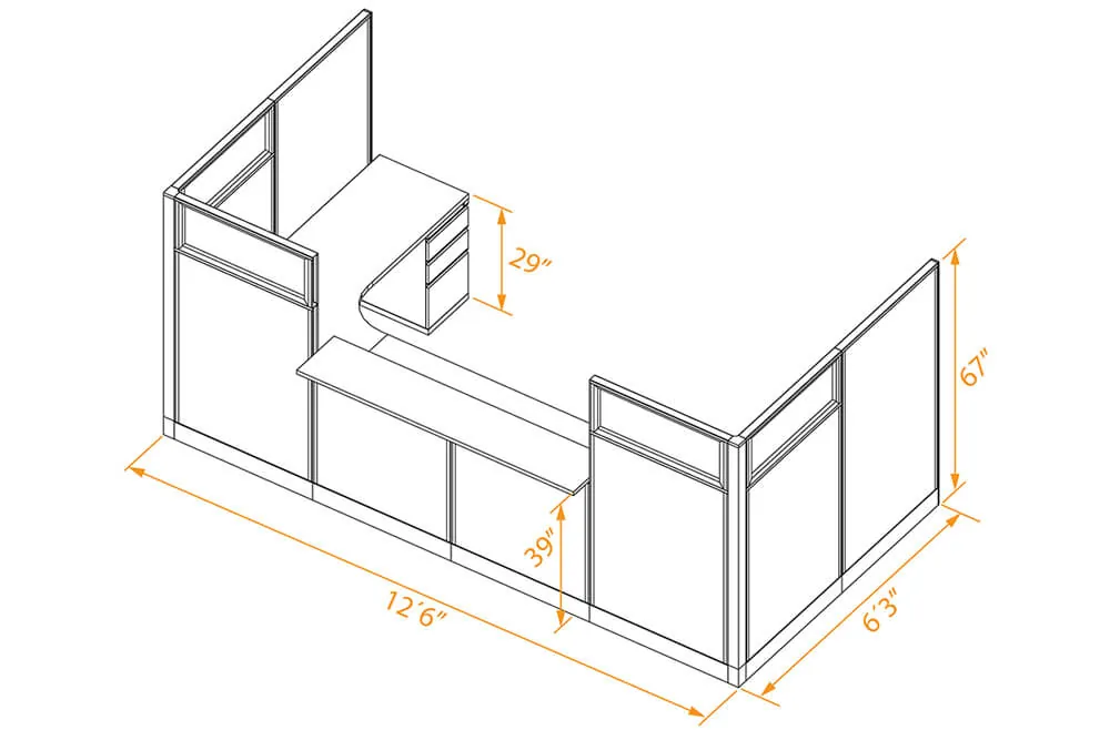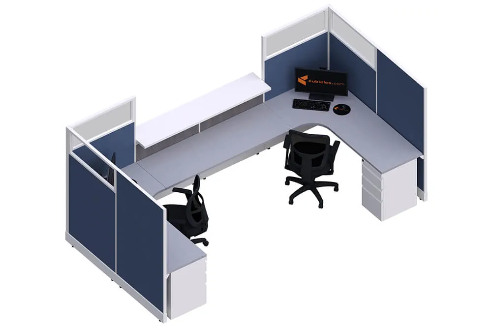 The U Shaped Reception Desk for 2 is a stylish and functional workstation designed to accommodate two receptionists. Featuring a shared office reception counter with sleek reception desk glass top corner panels, this symmetrical design offers both privacy and accessibility. Tall cubicle panels on either side enhance focus and professionalism while the rectangular transaction counter ensures smooth visitor interaction. The U Shaped worksurface provides ample workspace for multitasking, complemented by two storage pedestals on either side for organized functionality.