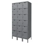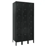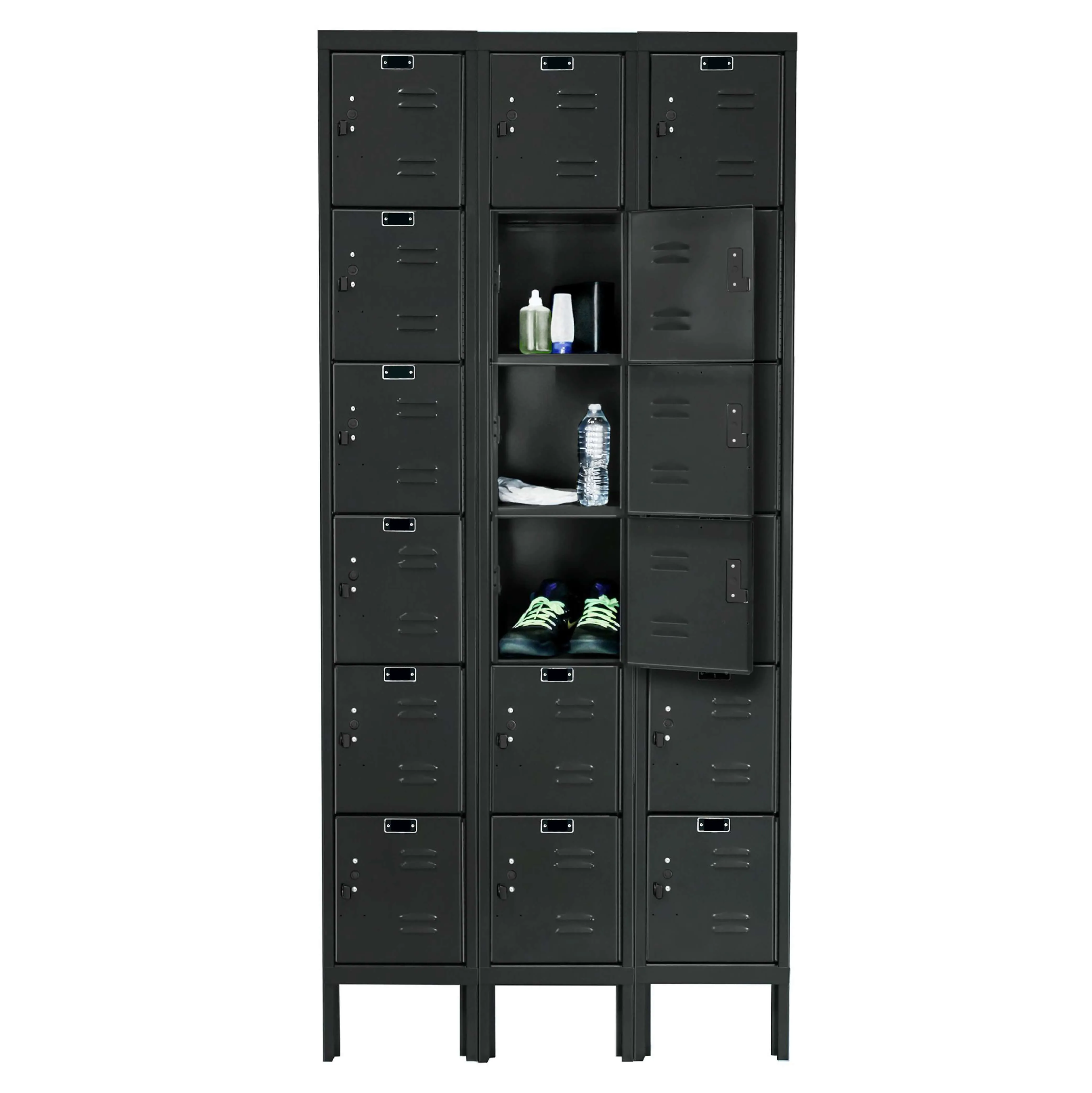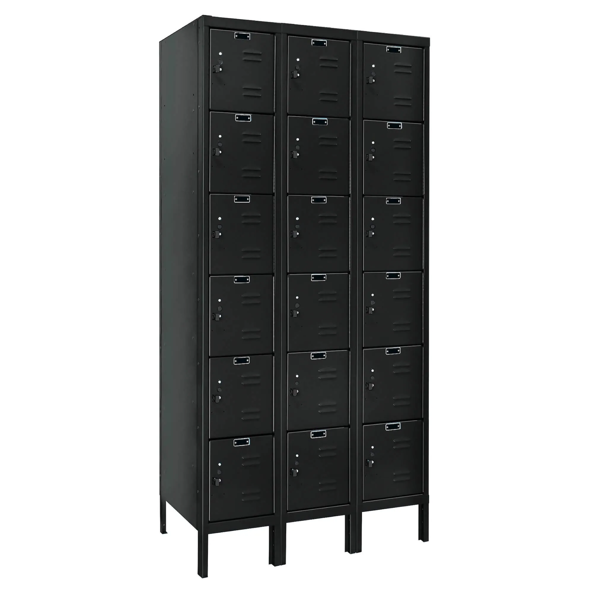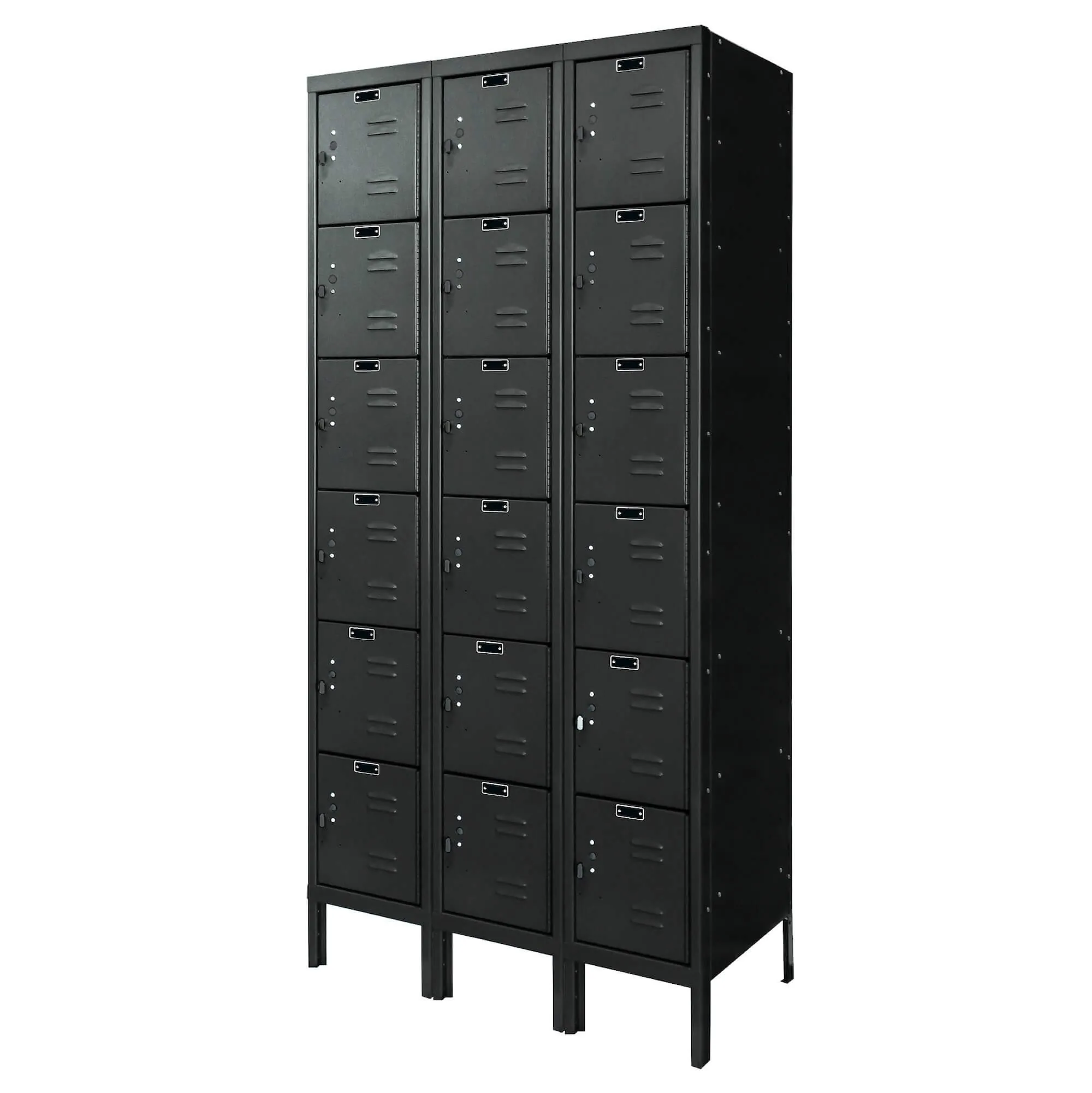 These three wide / six tier box lockers house clothing, accessories, and individual items. They are frequently used in homes, offices, gyms, and schools so that people may store their belongings securely. A popular choice for various settings due to their durability, security, and versatility. Great for storing smaller items in environments where space is limited.