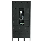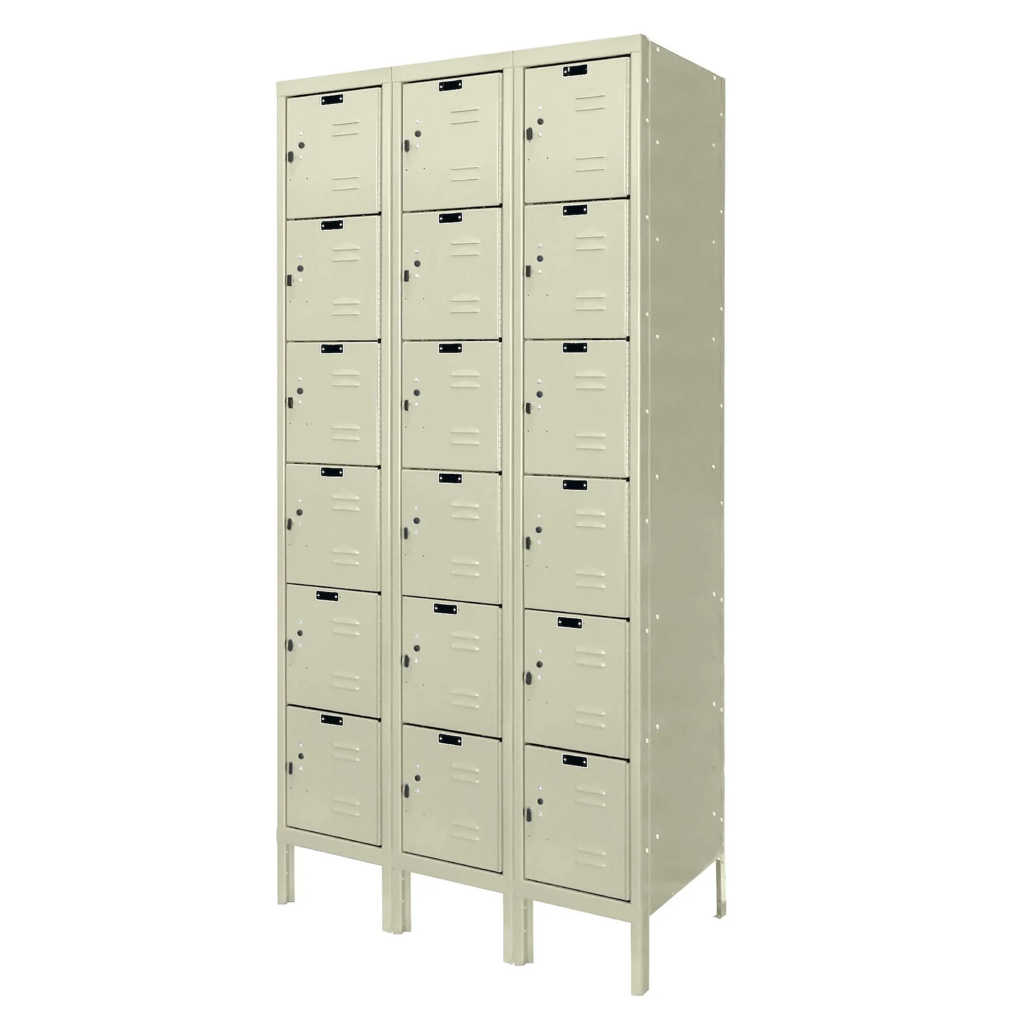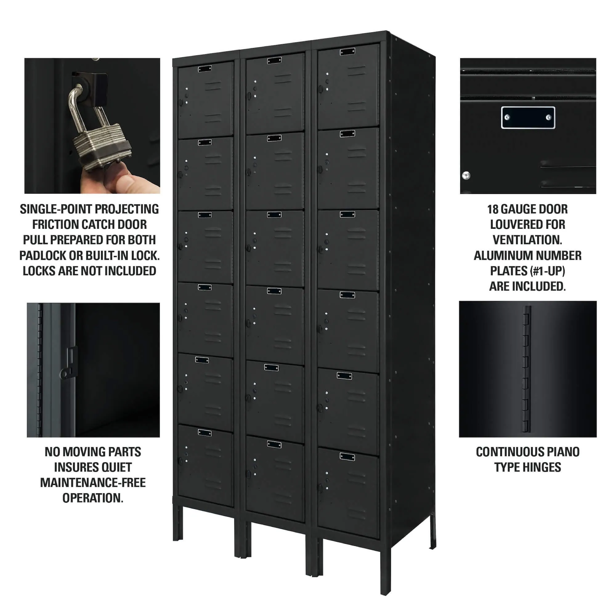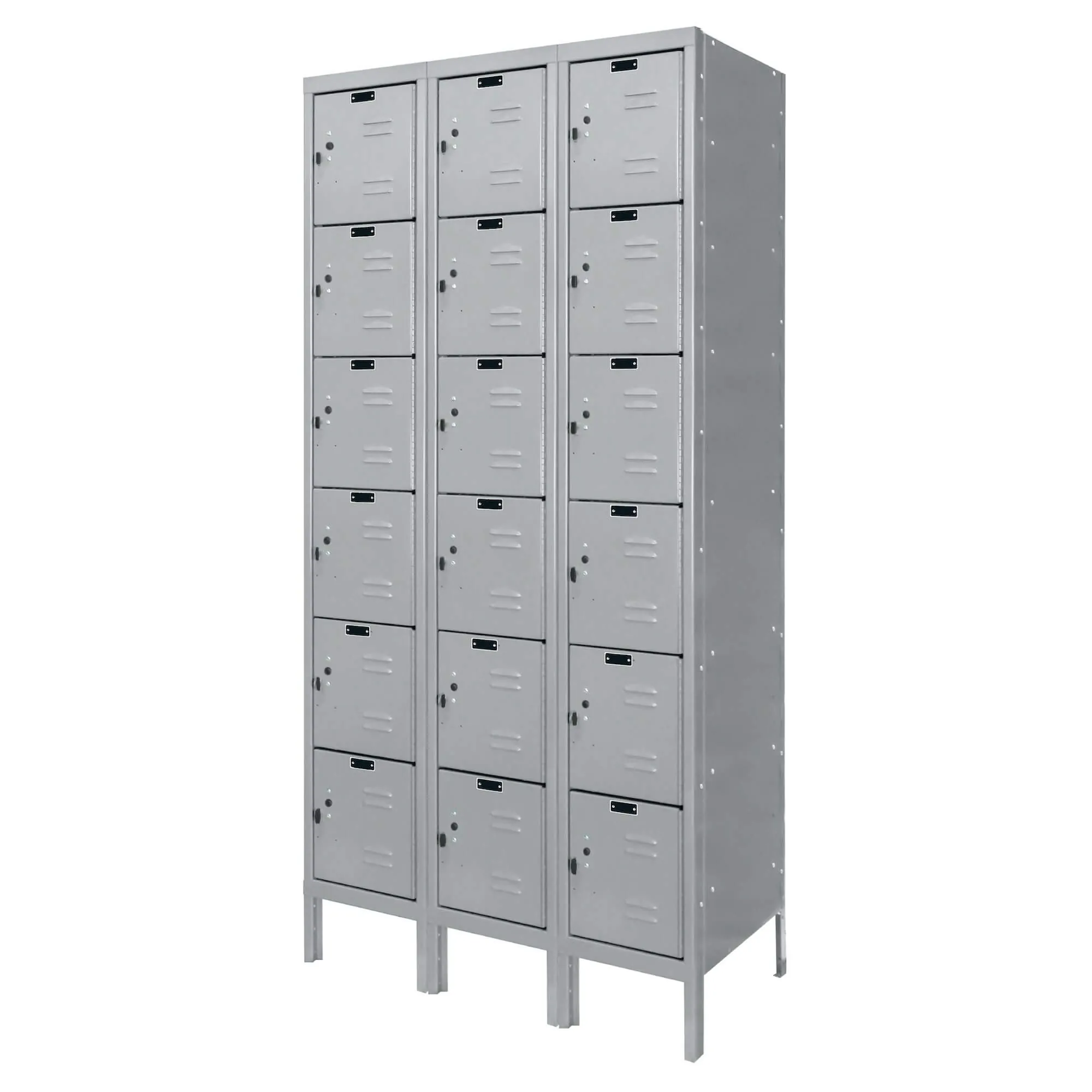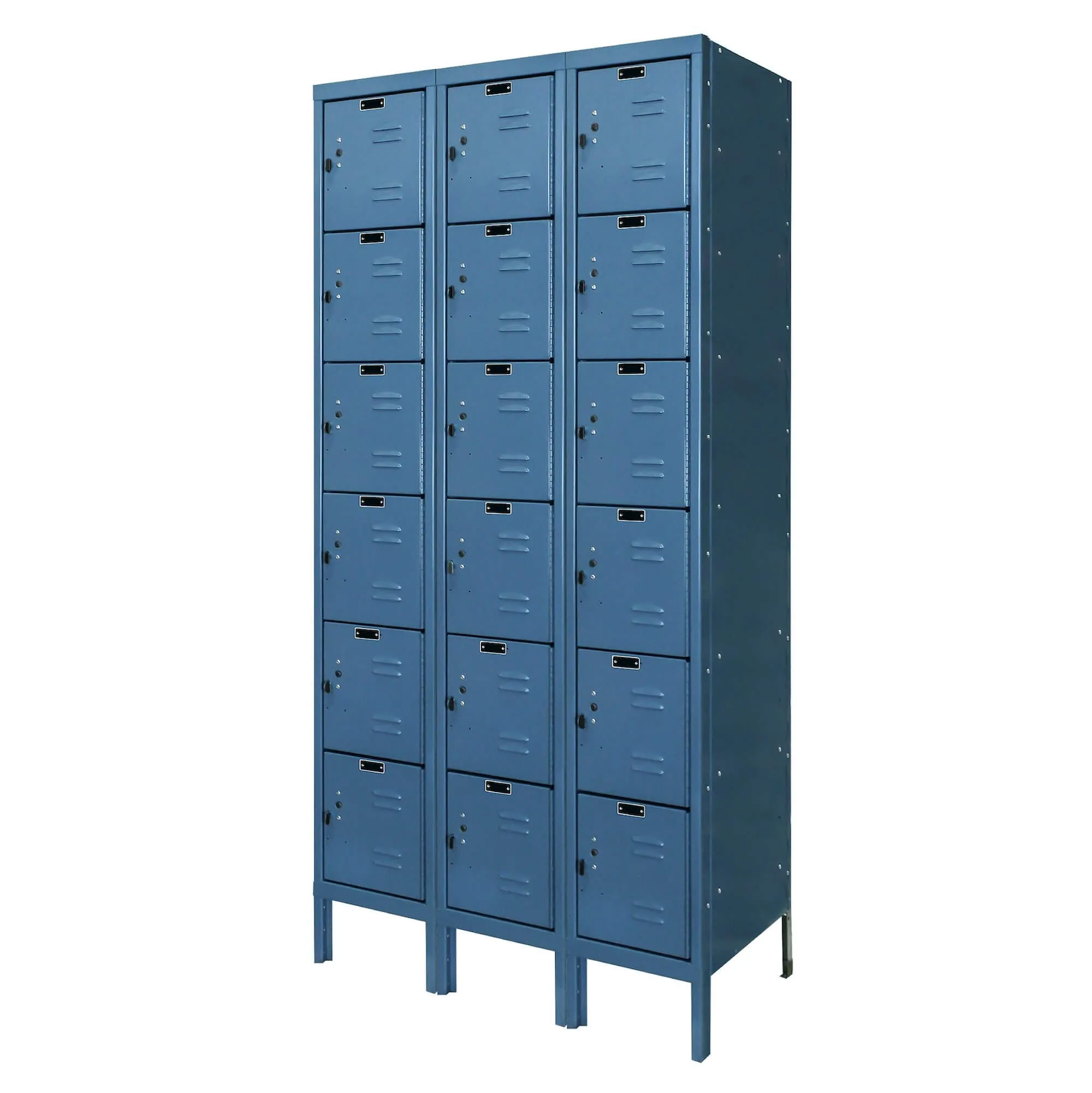These three wide / six tier box lockers house clothing, accessories, and individual items. They are frequently used in homes, offices, gyms, and schools so that people may store their belongings securely. A popular choice for various settings due to their durability, security, and versatility. Great for storing smaller items in environments where space is limited.