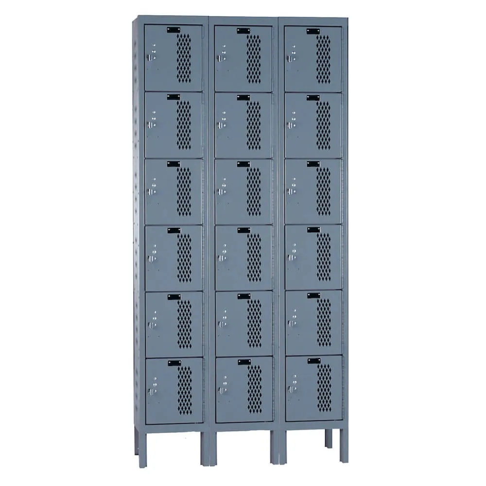 These three wide / six tall ventilated lockers allow air to circulate and inhibit the growth of damp, smells, or mildew, being perfect for spaces where equipment, clothing, or shoes are kept. These lockers are frequently utilized in schools, offices, gyms, sports facilities, and industrial environments where personal items may need to be let air out after use.