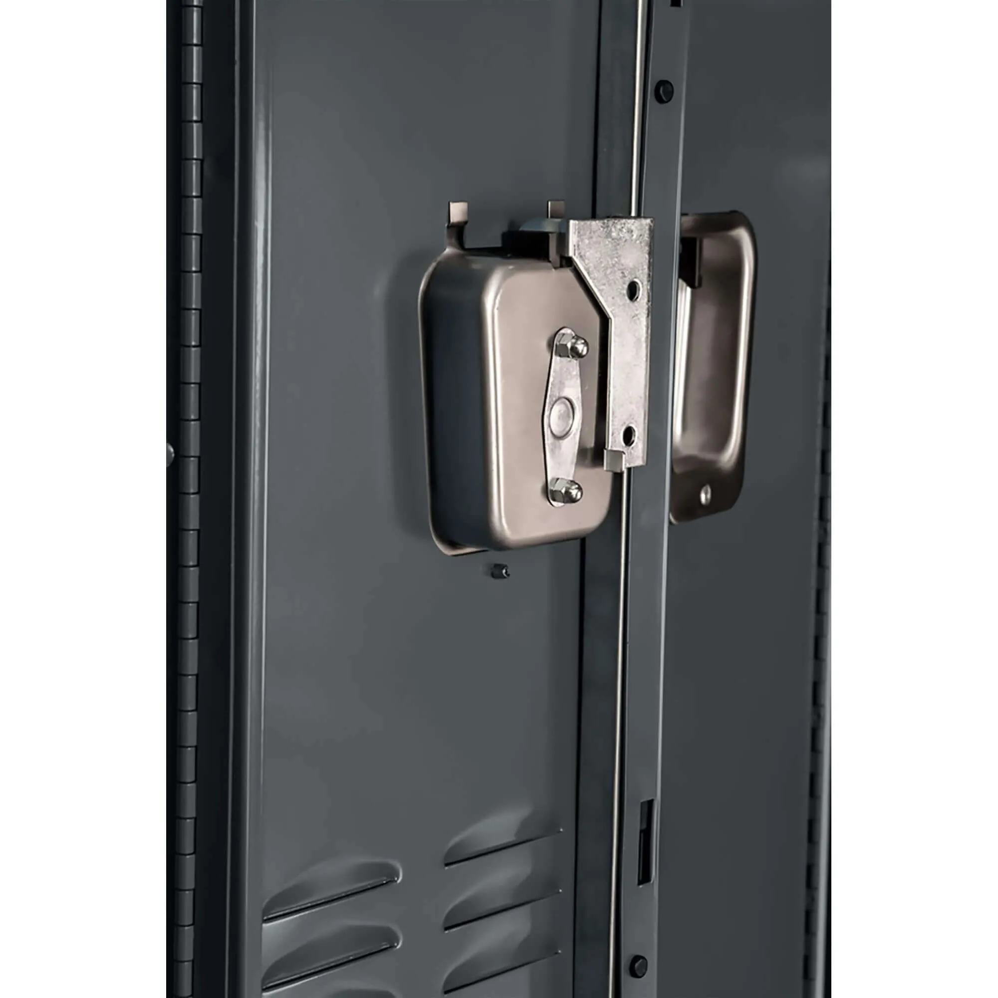 The stainless steel handle features with multi-point gravity lift-type latching for a modern look and added safety. Recessed handle design prevents paint finish from being damaged by padlock.