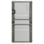 This portable folding table has gray powder coated locking legs. It is waterproof, impact and has stain resistant top. It comes in granite white color.