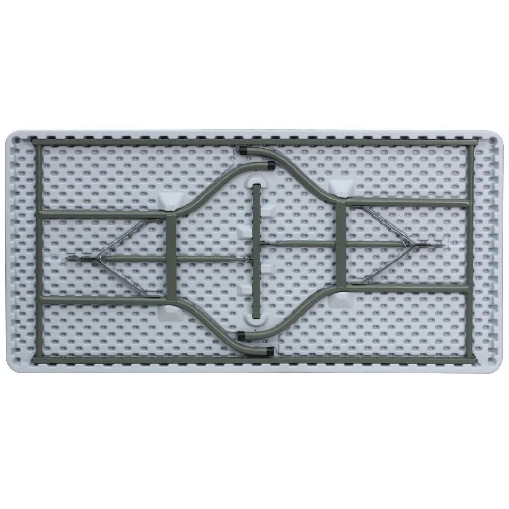 This portable folding table has gray powder coated locking legs. It is waterproof, impact and has stain resistant top. It comes in granite white color.