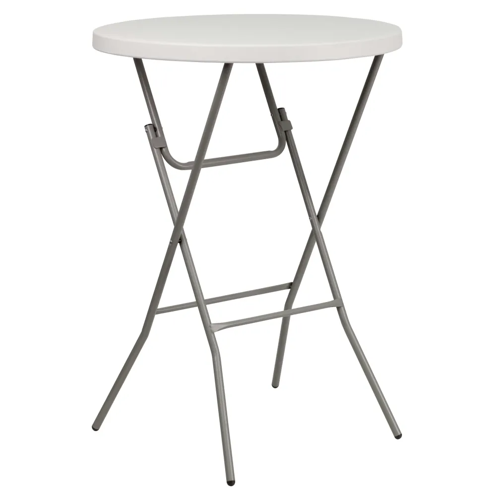 This portable folding table has bar height gray powder coated locking legs. It is waterproof, impact and has stain resistant top. It comes in granite white color.