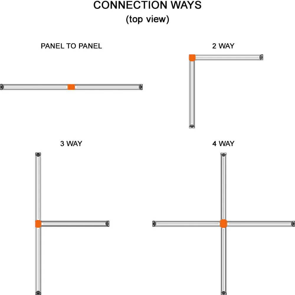 The panel connector that you need to order correlates directly to the shape of wall configuration (seen from a top view) you desire to build with the panels. Always in 90° angles, you can choose from four connection ways: