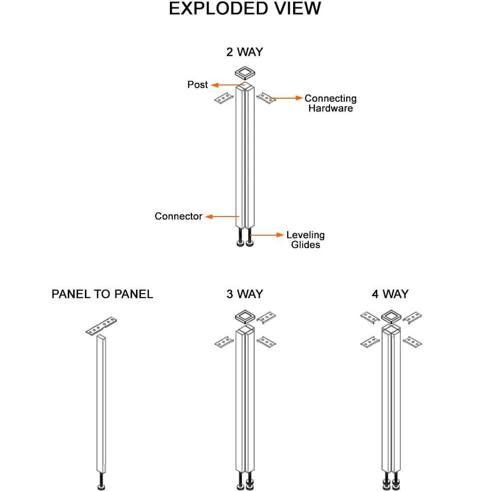 4 Way: one post, four connectors with leveling glides and connecting hardware.