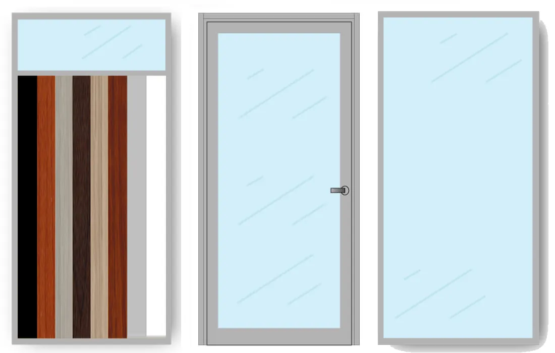 This glass door entrance feature 1/4" clear tempered glass and high pressure laminate, framed in an Anodized Silver finish aluminum frame. The laminate surfaces are available in: White, Black, Wooden Gray, Mahogany, Light Gray, Chocolate, Cherry and Cappuccino.
