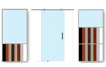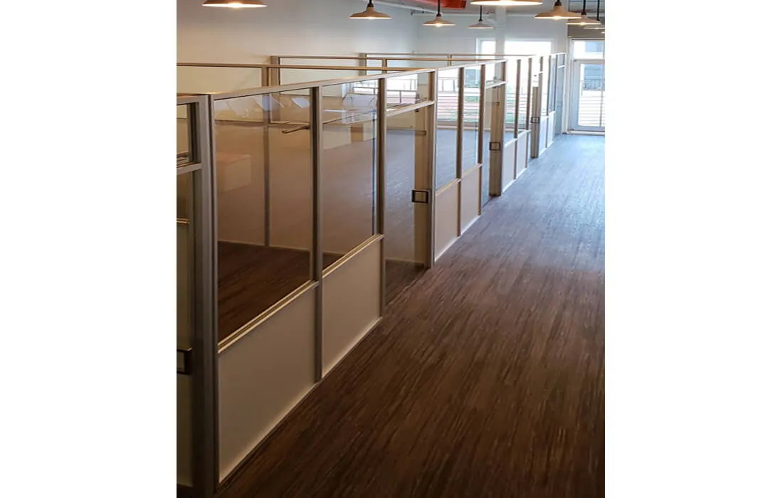 The U-Shaped configuration shown consists of laminate/glass panels and sliding glass barn doors. The glass wall system used is highly adaptable and can be reconfigured according to your needs. CONTACT US for more information.