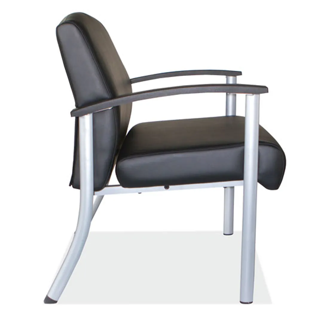 This bariatric guest chair is upholstered in black bonded leather, which is easy to clean with a simple wipe-down. It features a durable metal frame and base, with metal and nylon arm pads for added comfort. The seat cushion is made of high-density foam, and both the seat and back are covered in PU leather, providing a sleek and professional appearance.