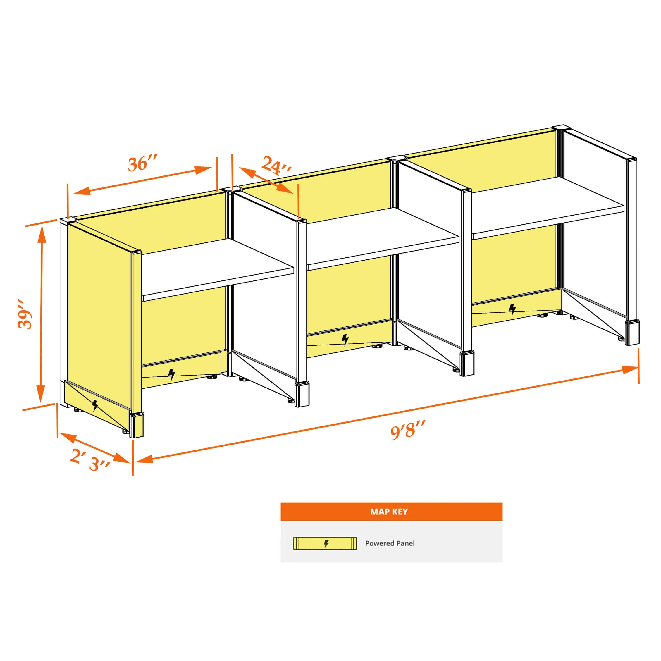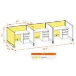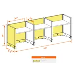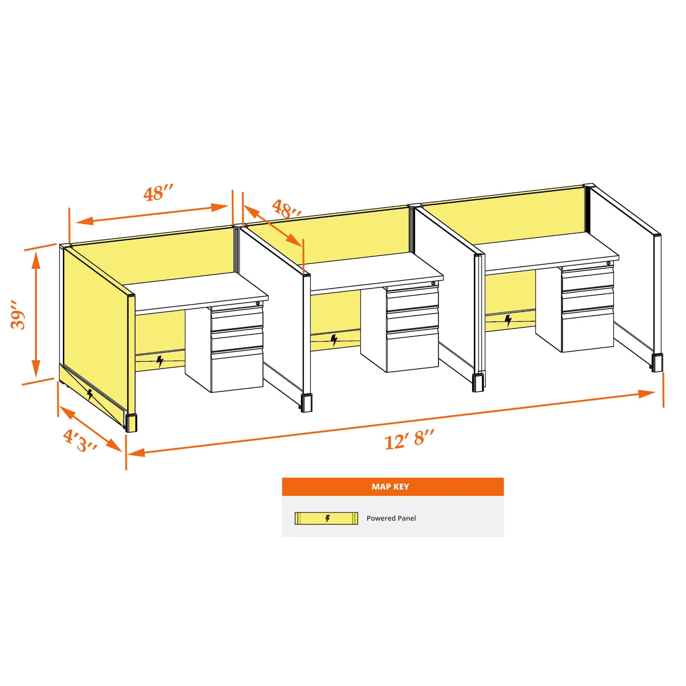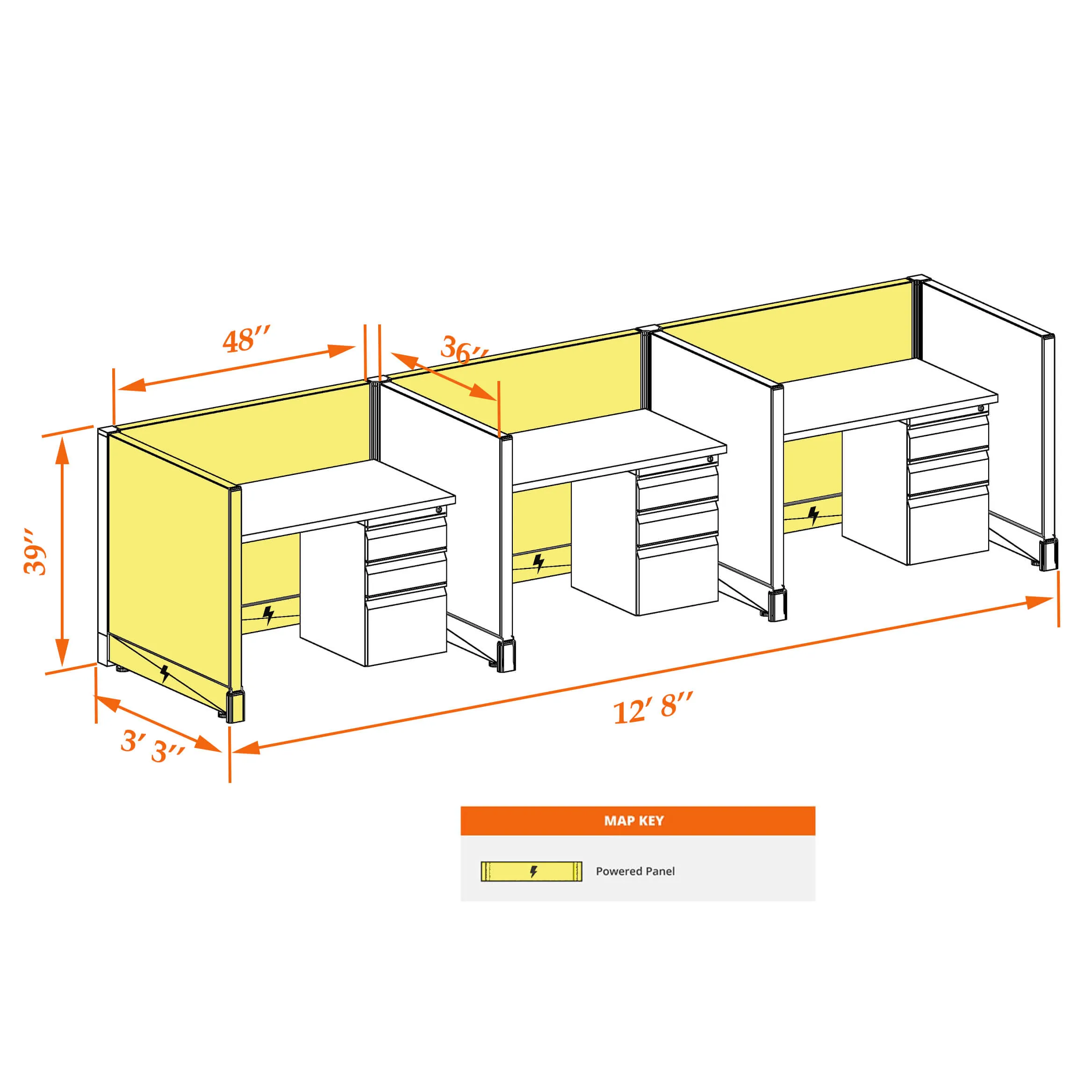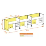 This particular configuration includes 3 cubicles (in a row) with 39 inch panel height. For workspace area you can choose 4’W desks with 2, 3, or 4’D side panels, depending on the size of your office space. For very small offices that need to fit as many people as possible, we also offer 3’W desks with 2’D side panels. These cubicles are powered, so you can plug your electronic devices directly into the panel power sockets.
