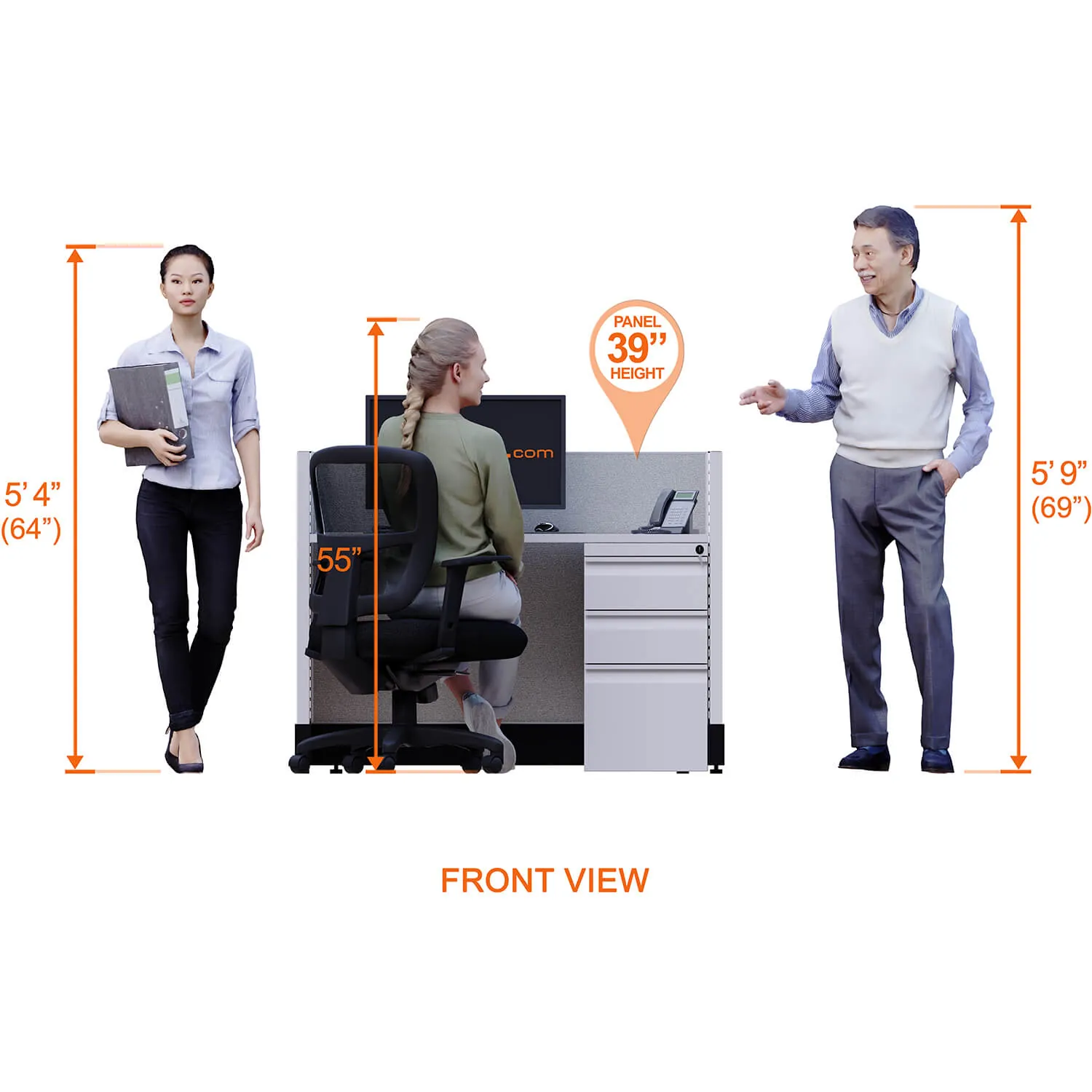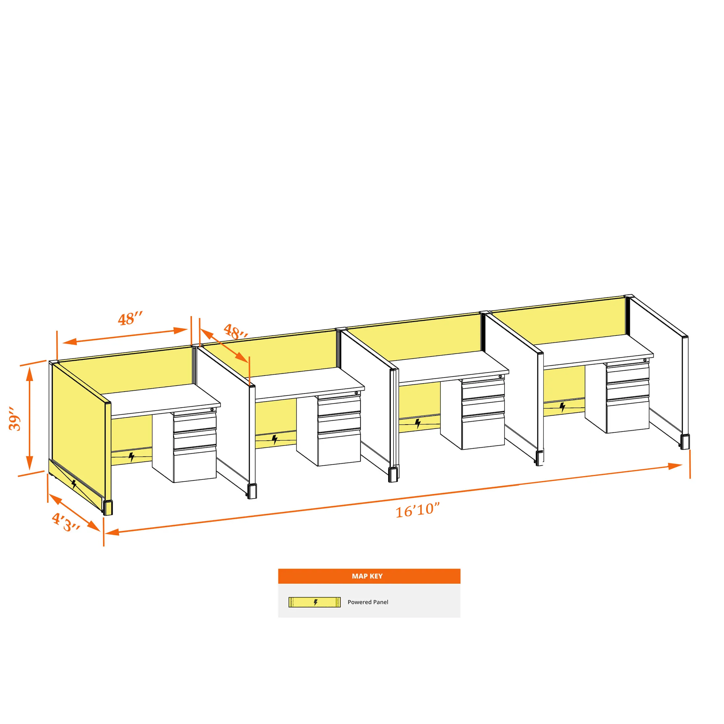 This particular configuration includes 4 cubicles (in a row) with 39 inch panel height. For workspace area you can choose 4’W desks with 2, 3, or 4’D side panels, depending on the size of your office space. For very small offices that need to fit as many people as possible, we also offer 3’W desks with 2’D side panels. These cubicles are powered, so you can plug your electronic devices directly into the panel power sockets.