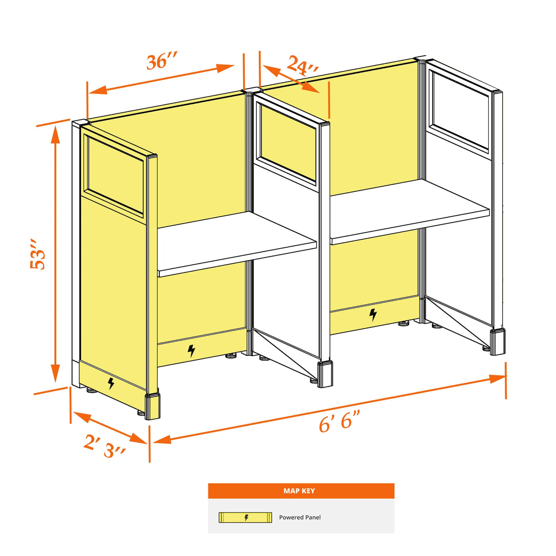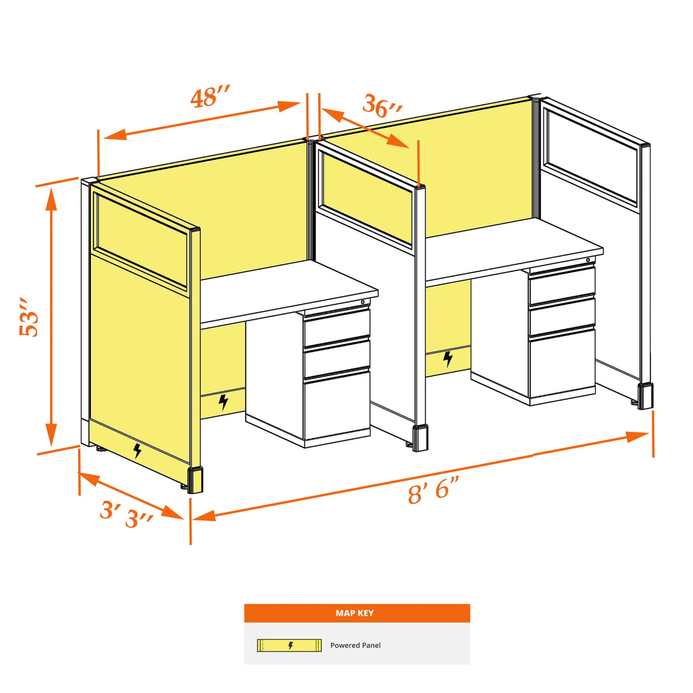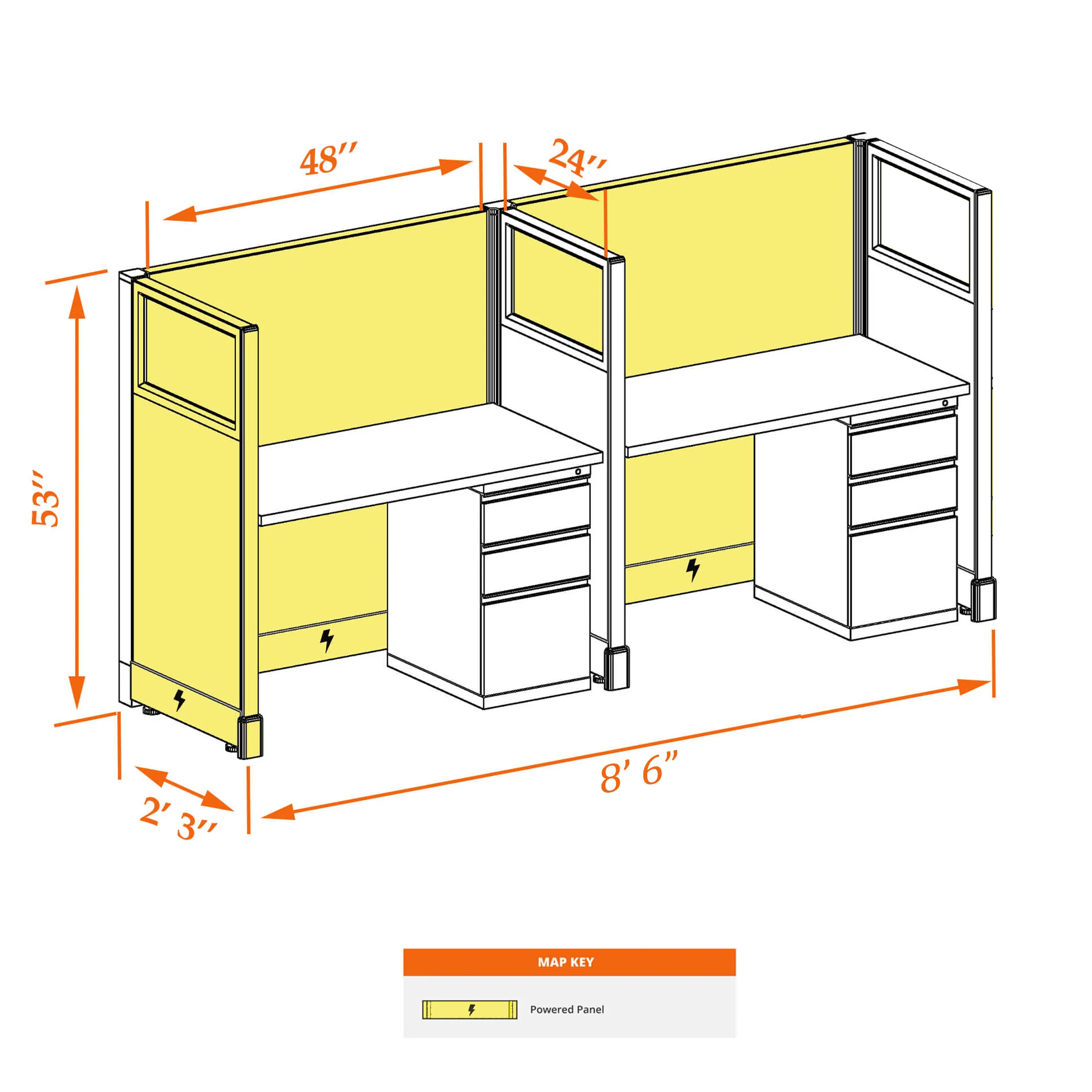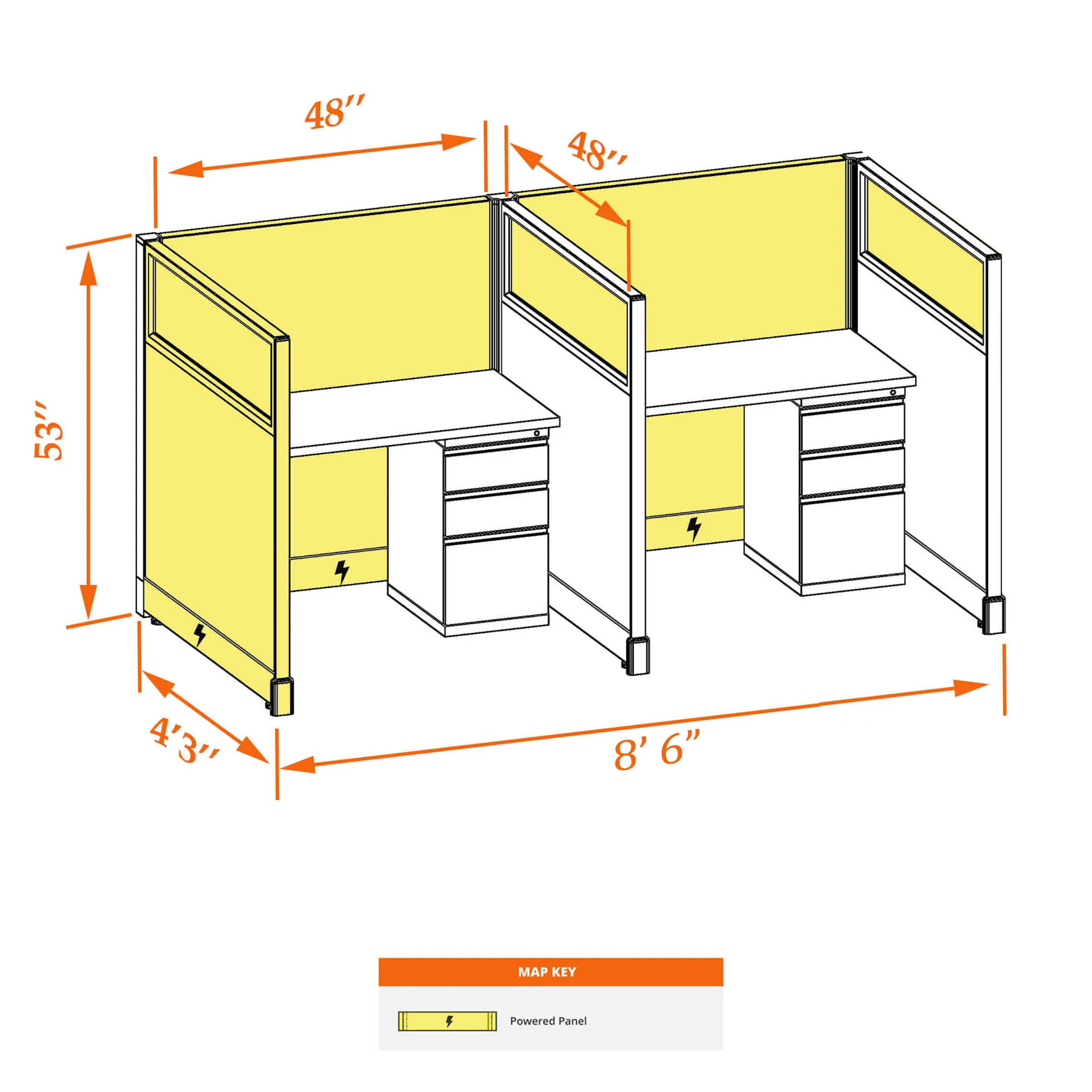 This particular configuration includes 2 cubicle with 53 inch panel height. For workspace area you can choose 2’x4’, 2’x3’, 3’x4’ or 4’x4’ depending on available space. These cubicles are powered, so you can plug your electronic devices directly into the panel power sockets.