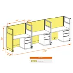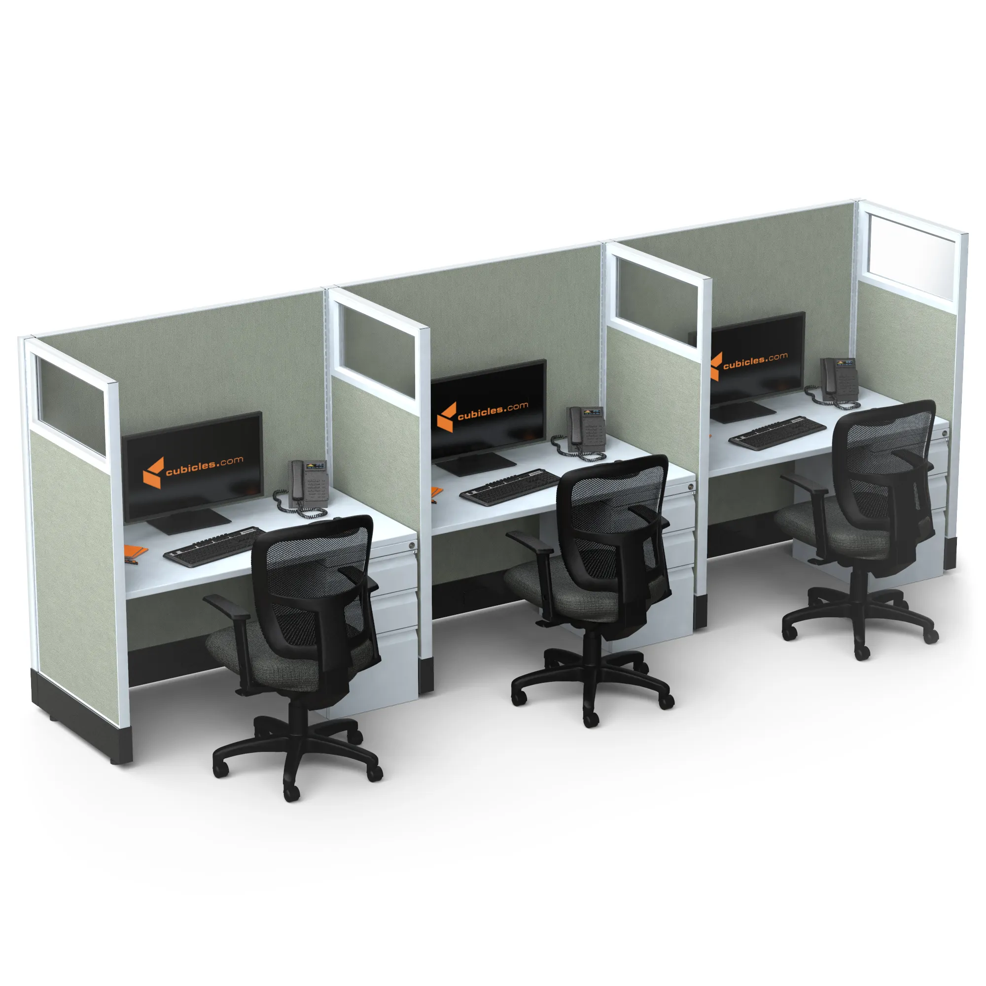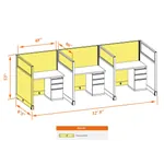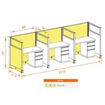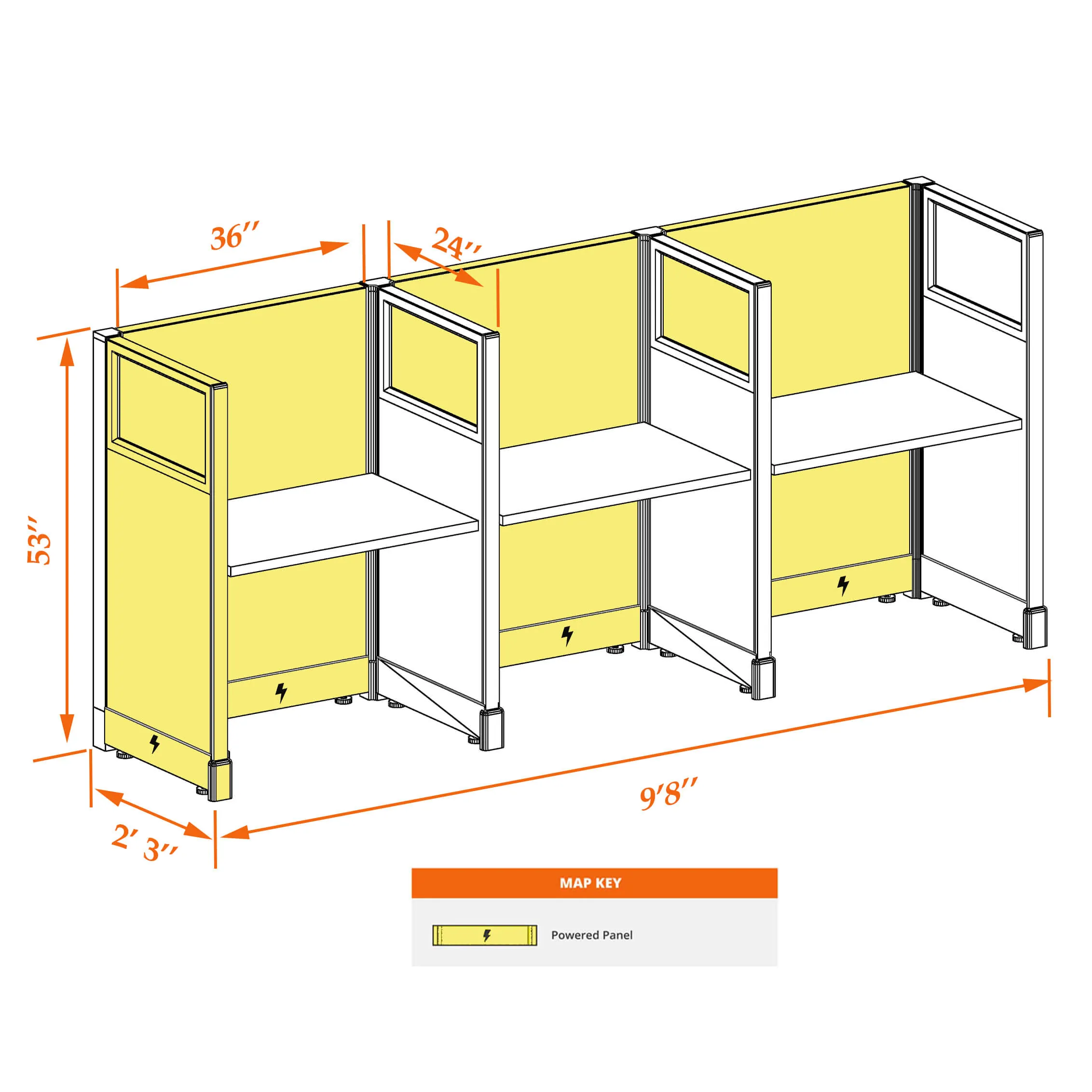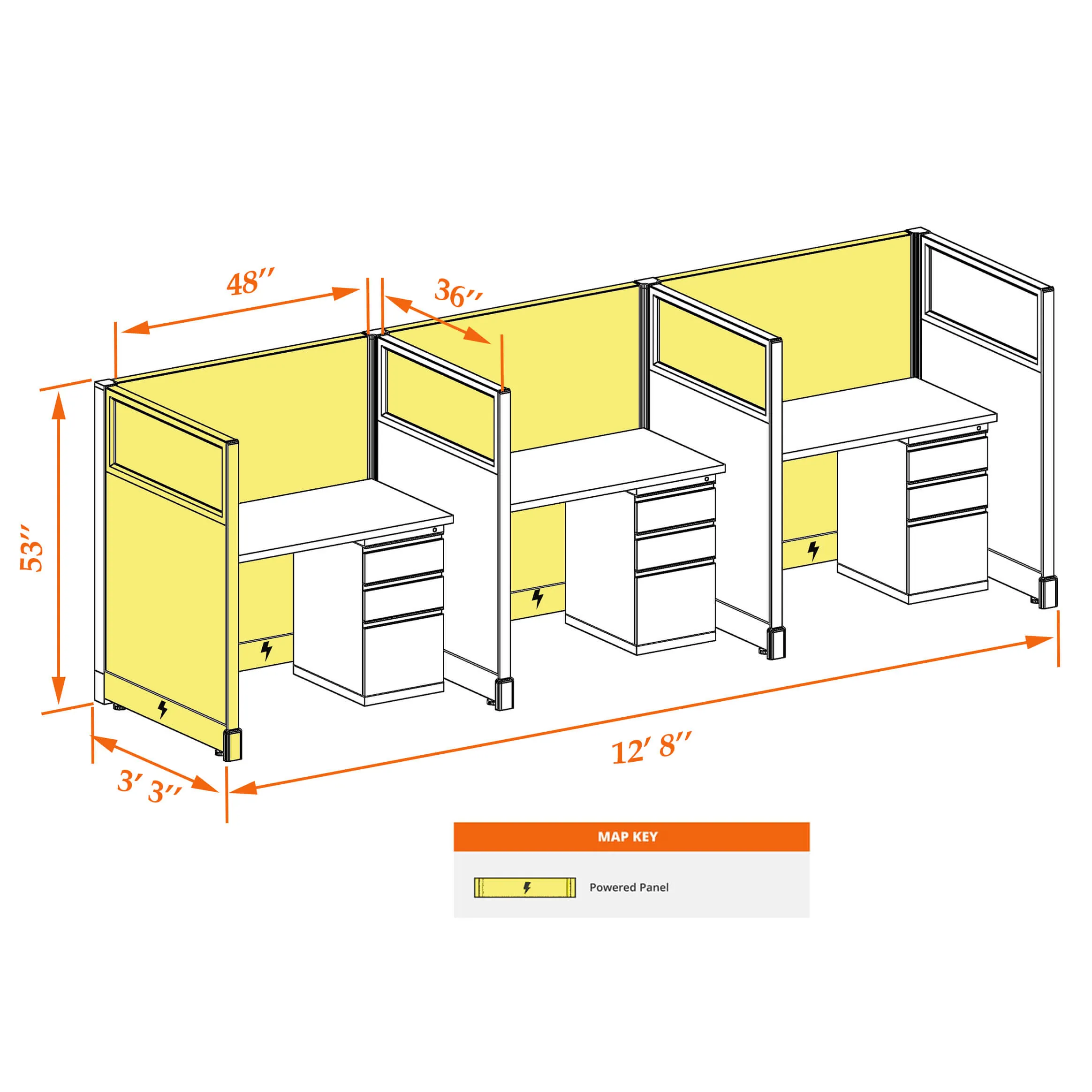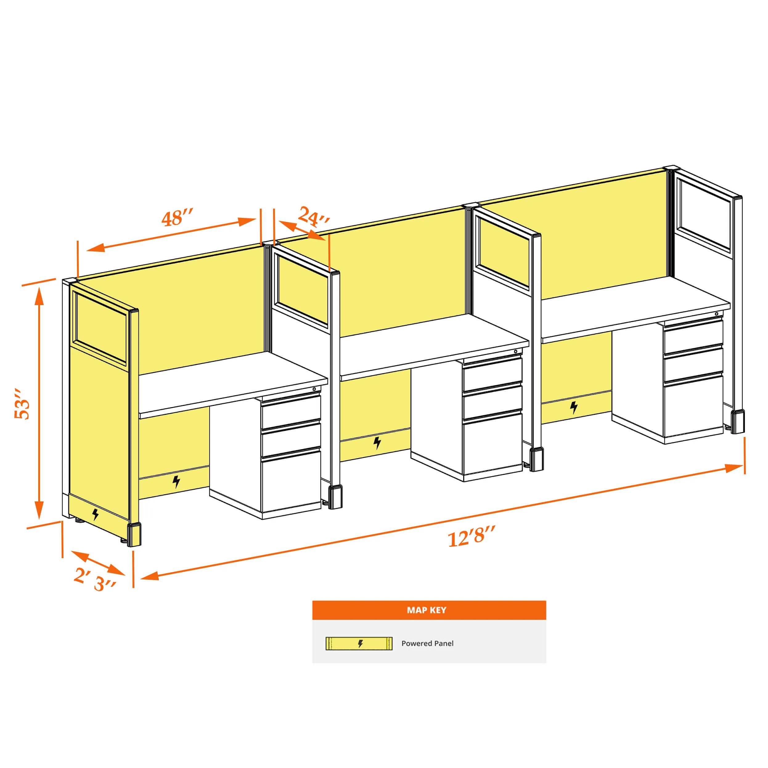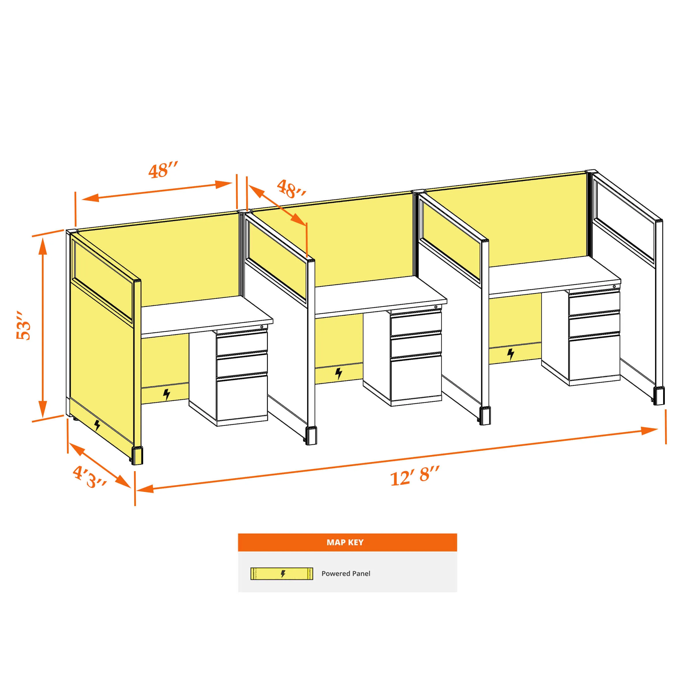 This particular configuration includes 3 cubicle with 53 inch panel height. For workspace area you can choose 2’x4’, 2’x3’, 3’x4’ or 4’x4’ depending on available space. These cubicles are powered, so you can plug your electronic devices directly into the panel power sockets.
