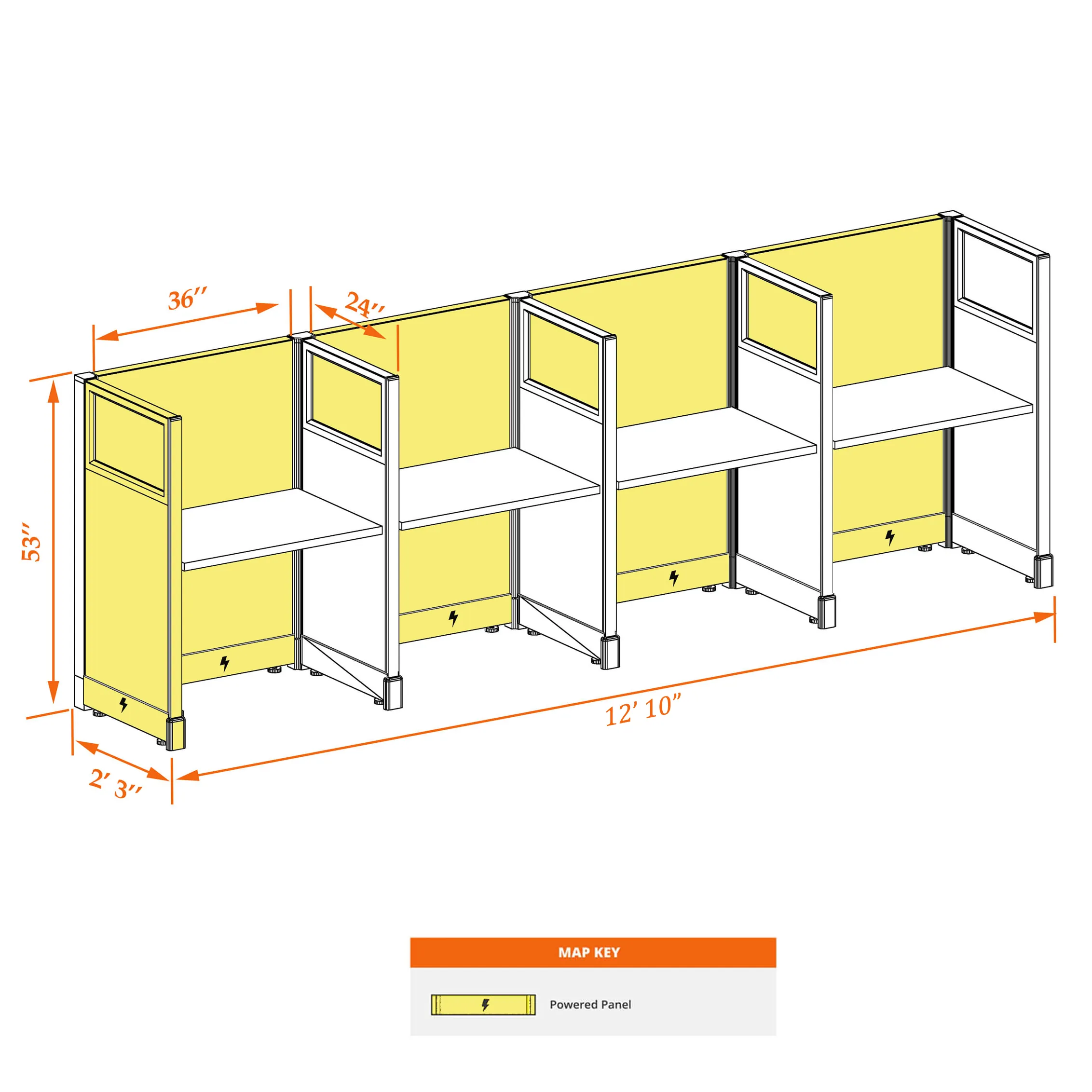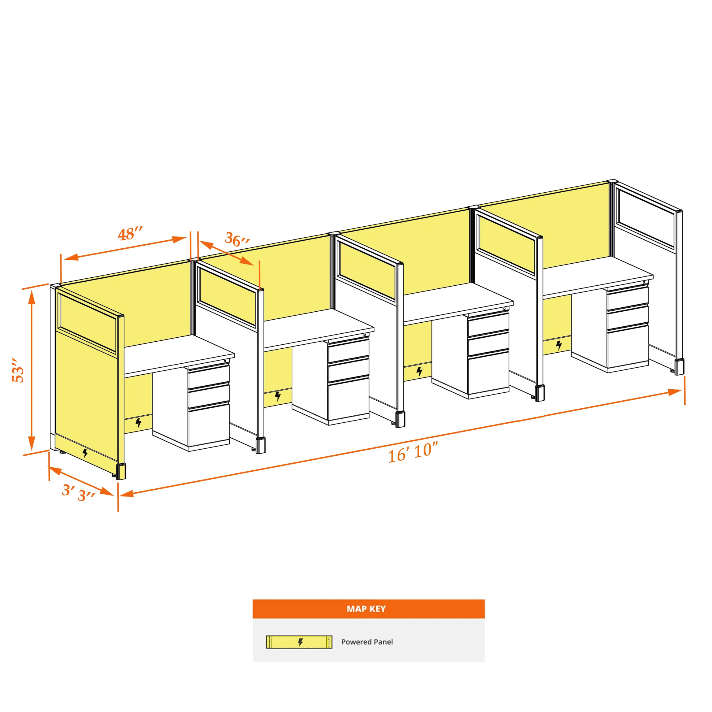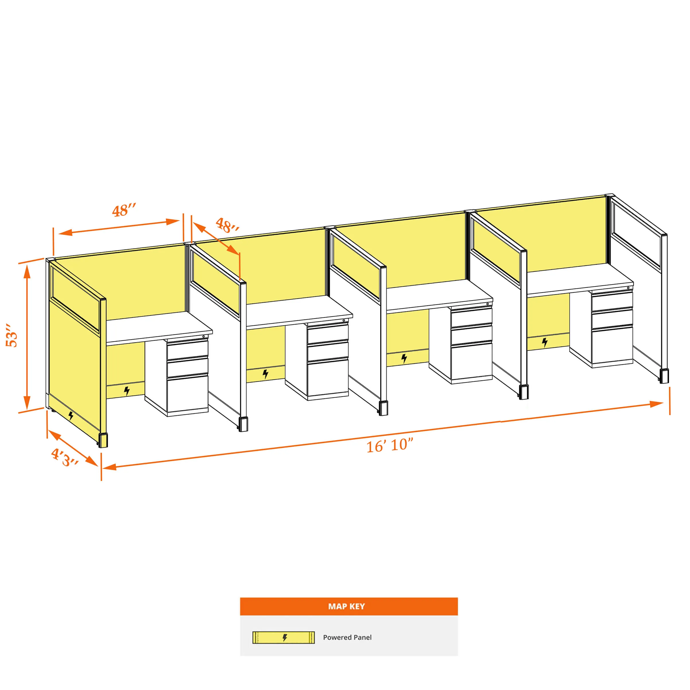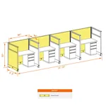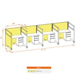 This particular configuration includes 4 cubicle with 53 inch panel height. For workspace area you can choose 2’x4’, 2’x3’, 3’x4’ or 4’x4’ depending on available space. These cubicles are powered, so you can plug your electronic devices directly into the panel power sockets.