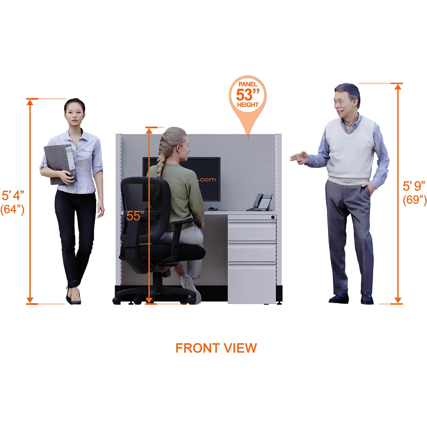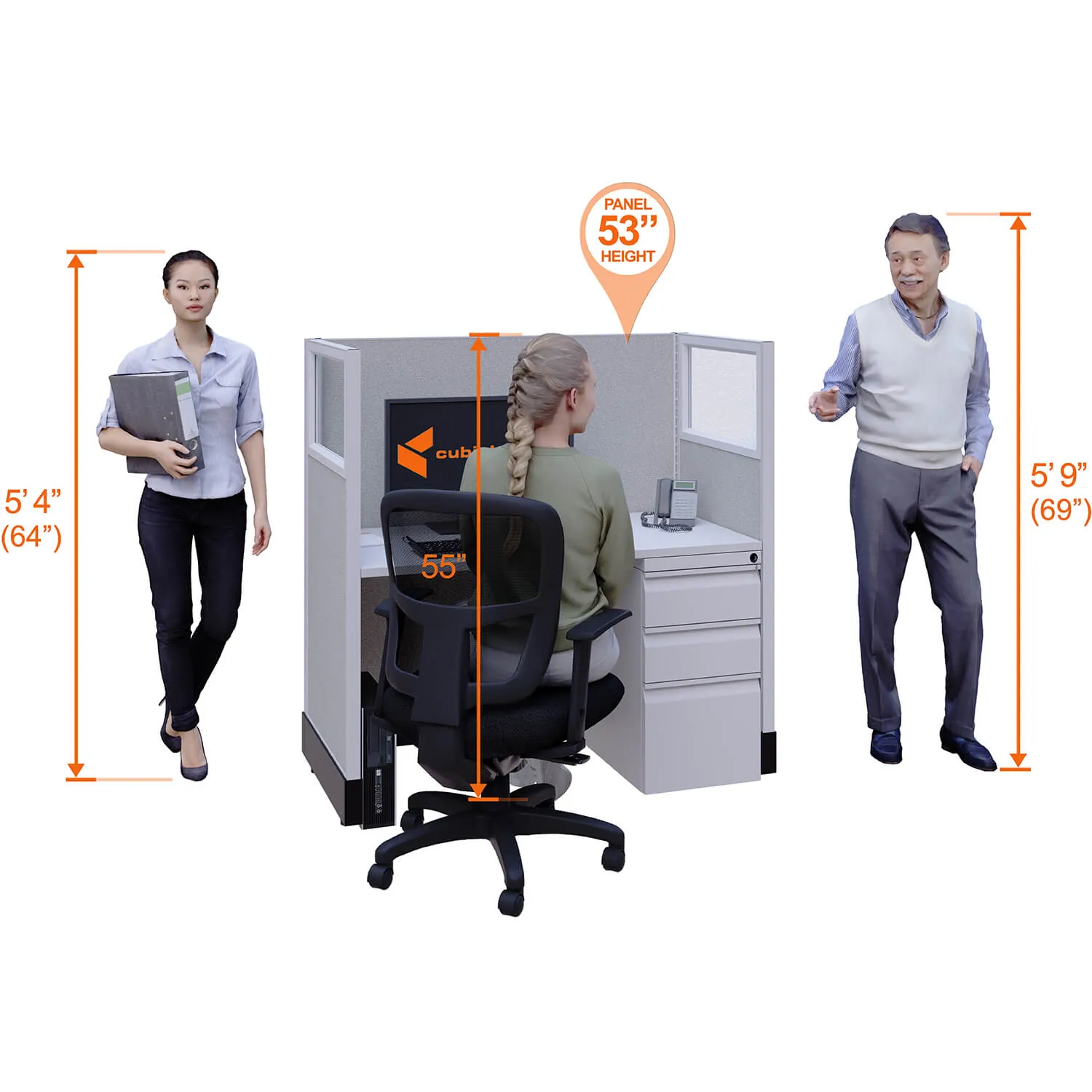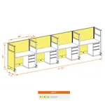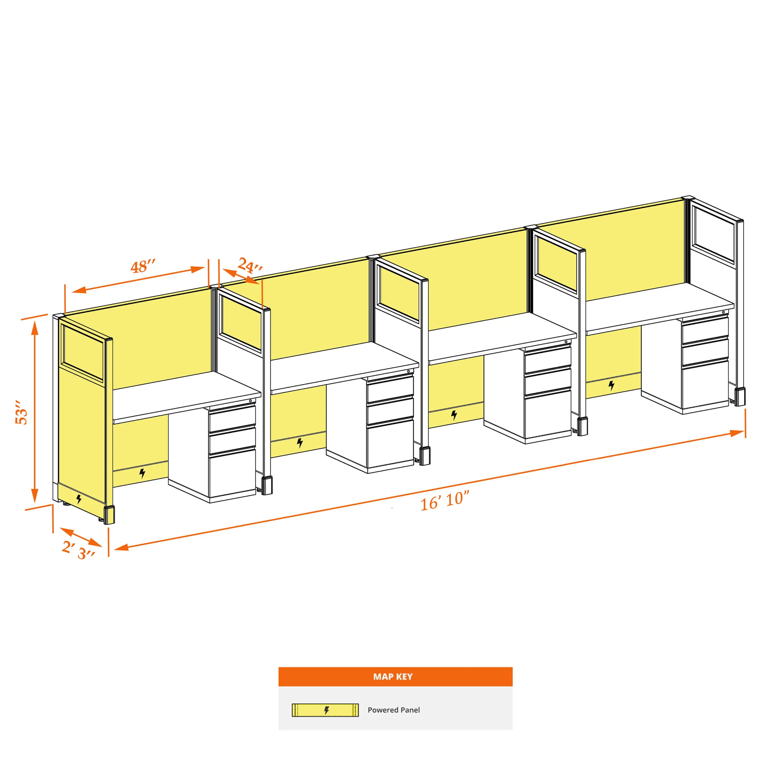 This particular configuration includes 4 cubicle with 53 inch panel height. For workspace area you can choose 2’x4’, 2’x3’, 3’x4’ or 4’x4’ depending on available space. These cubicles are powered, so you can plug your electronic devices directly into the panel power sockets.