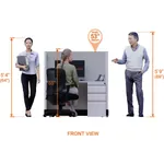 This hot desk has panels upholstered in Drift fabric (grey/beige), durable flush-mounted black resin kick plates, metal components powder coated in either White or Silver, and laminate work surfaces available in three colors: White, Medium Tone and Dark Tone. All panel frames and raceways, filing pedestals, overheads and shelves are made from 100% recyclable steel. Configurations that include glass-top panels feature real glass and metal frames.