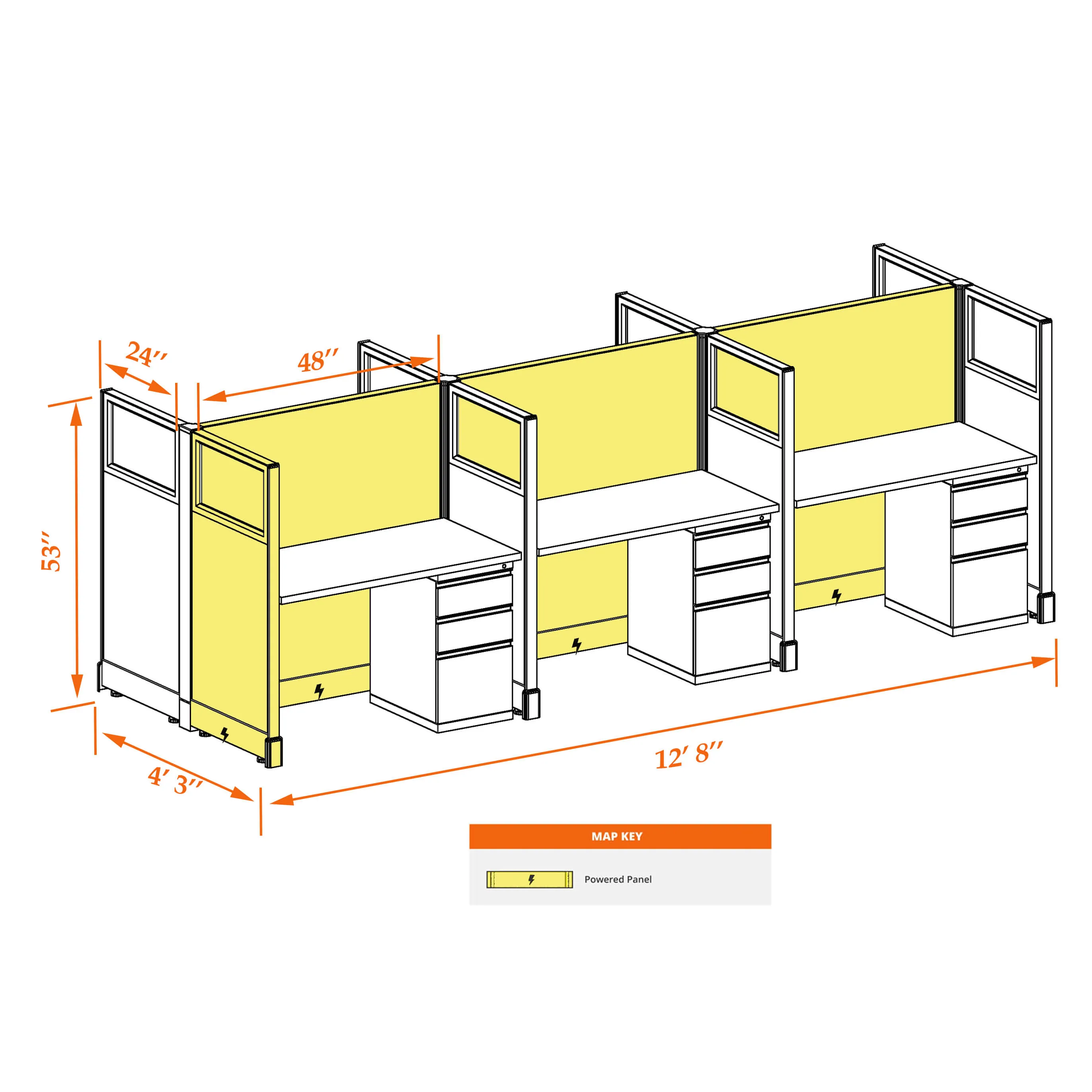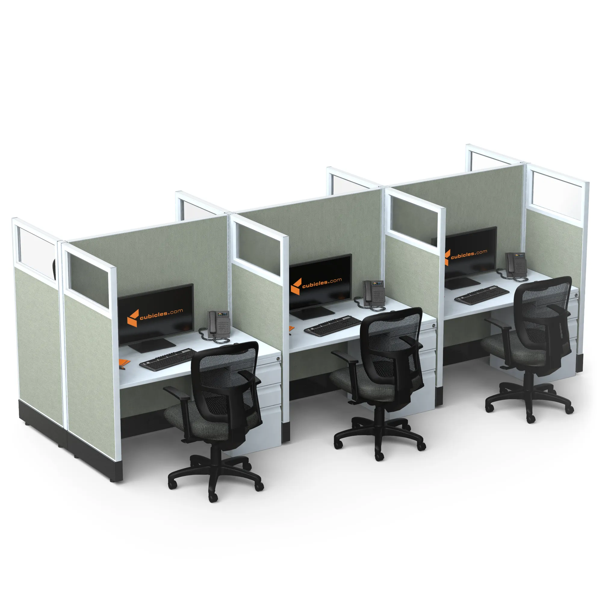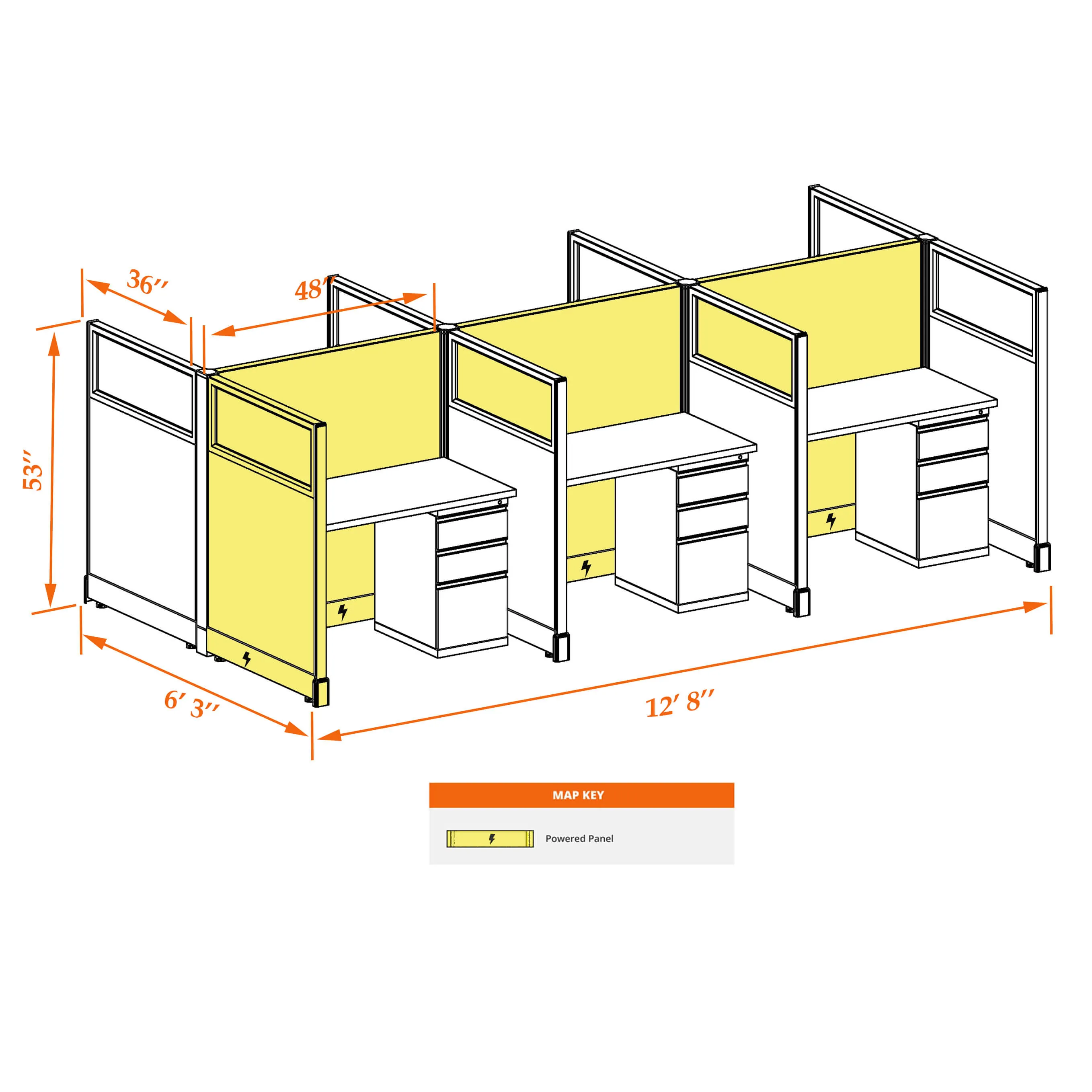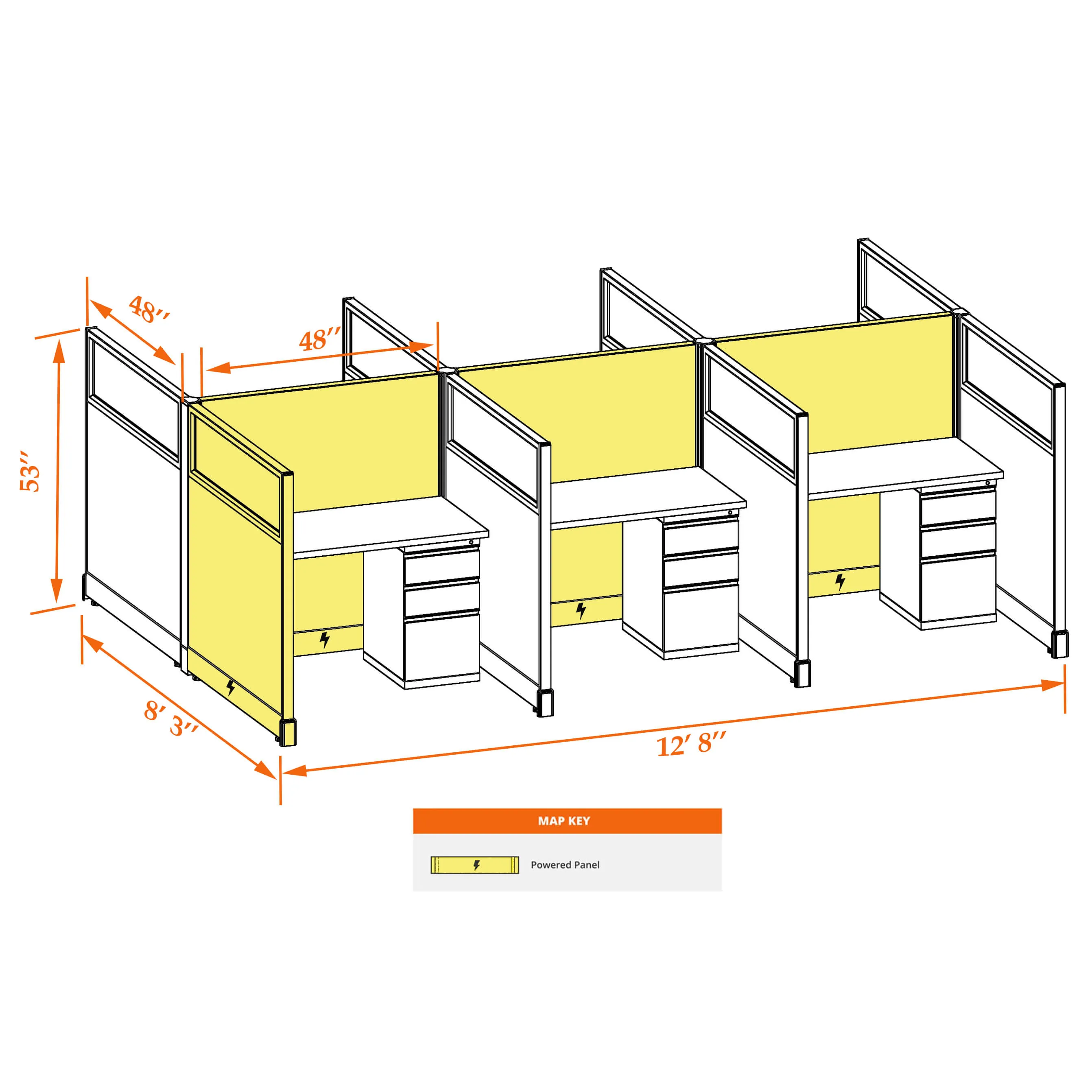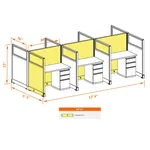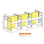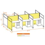 This particular configuration includes 6 cubicle with 53 inch panel height. For workspace area you can choose 2’x4’, 2’x3’, 3’x4’ or 4’x4’ depending on available space. These cubicles are powered, so you can plug your electronic devices directly into the panel power sockets.