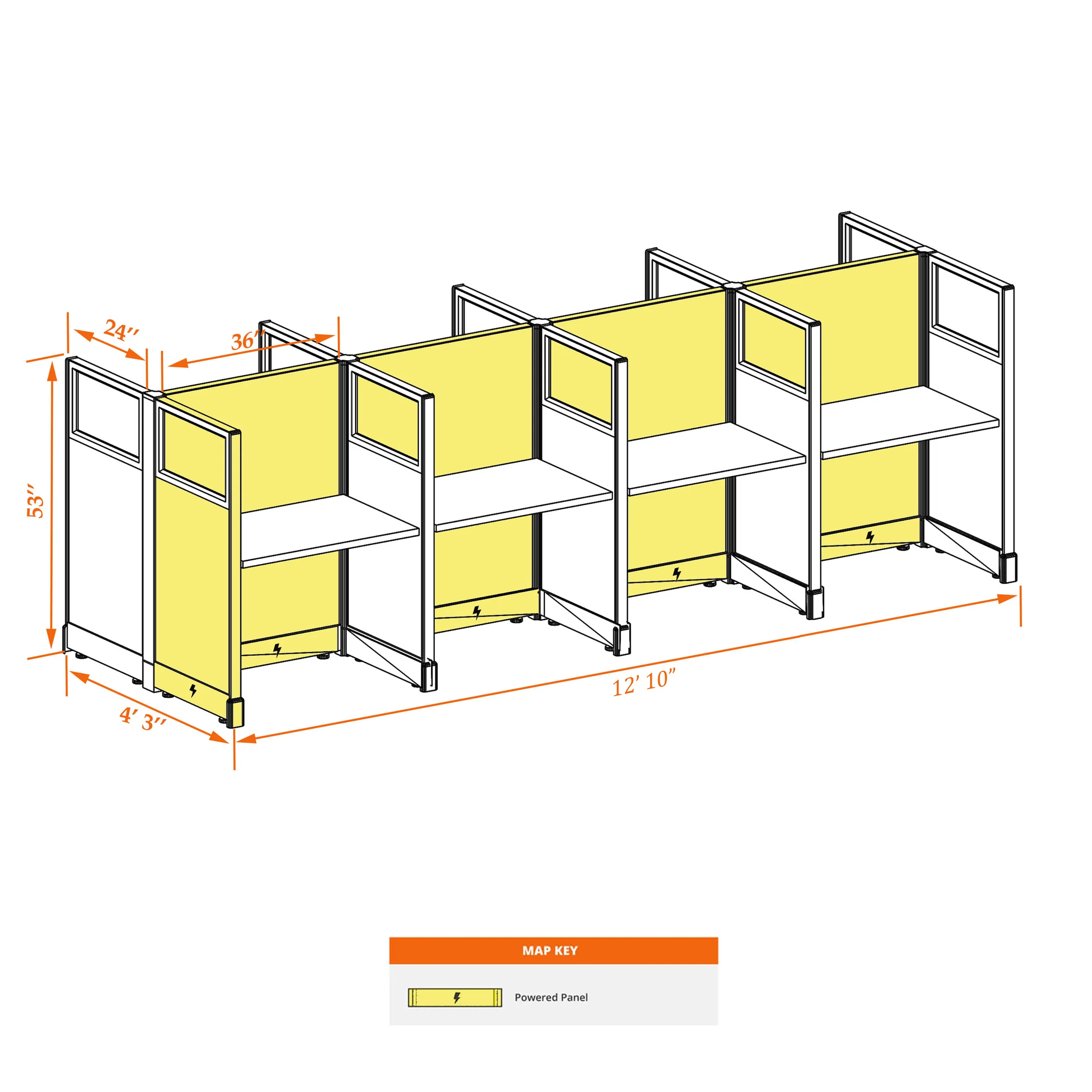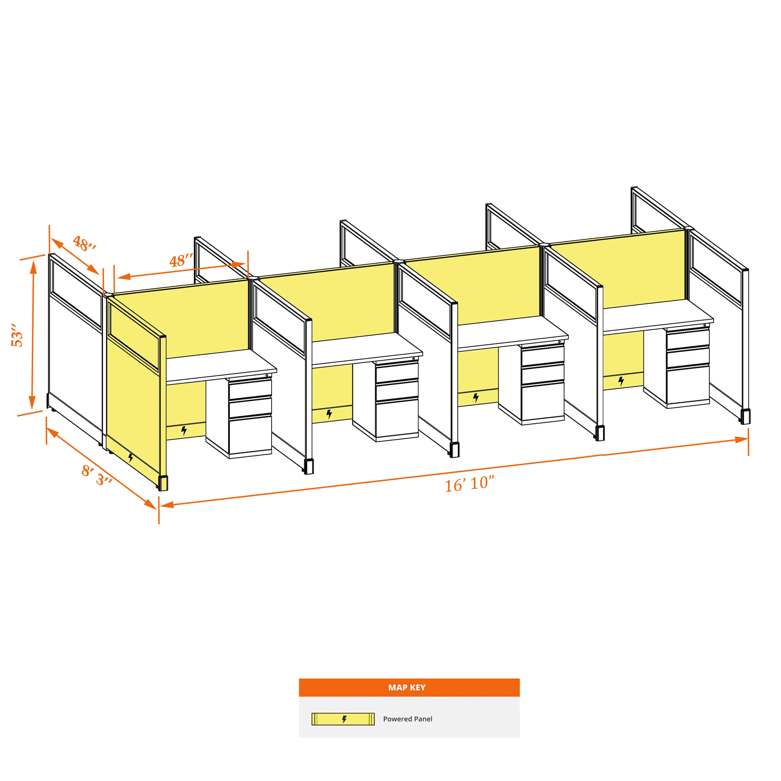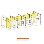This particular configuration includes 8 cubicle with 53 inch panel height. For workspace area you can choose 2’x4’, 2’x3’, 3’x4’ or 4’x4’ depending on available space. These cubicles are powered, so you can plug your electronic devices directly into the panel power sockets.