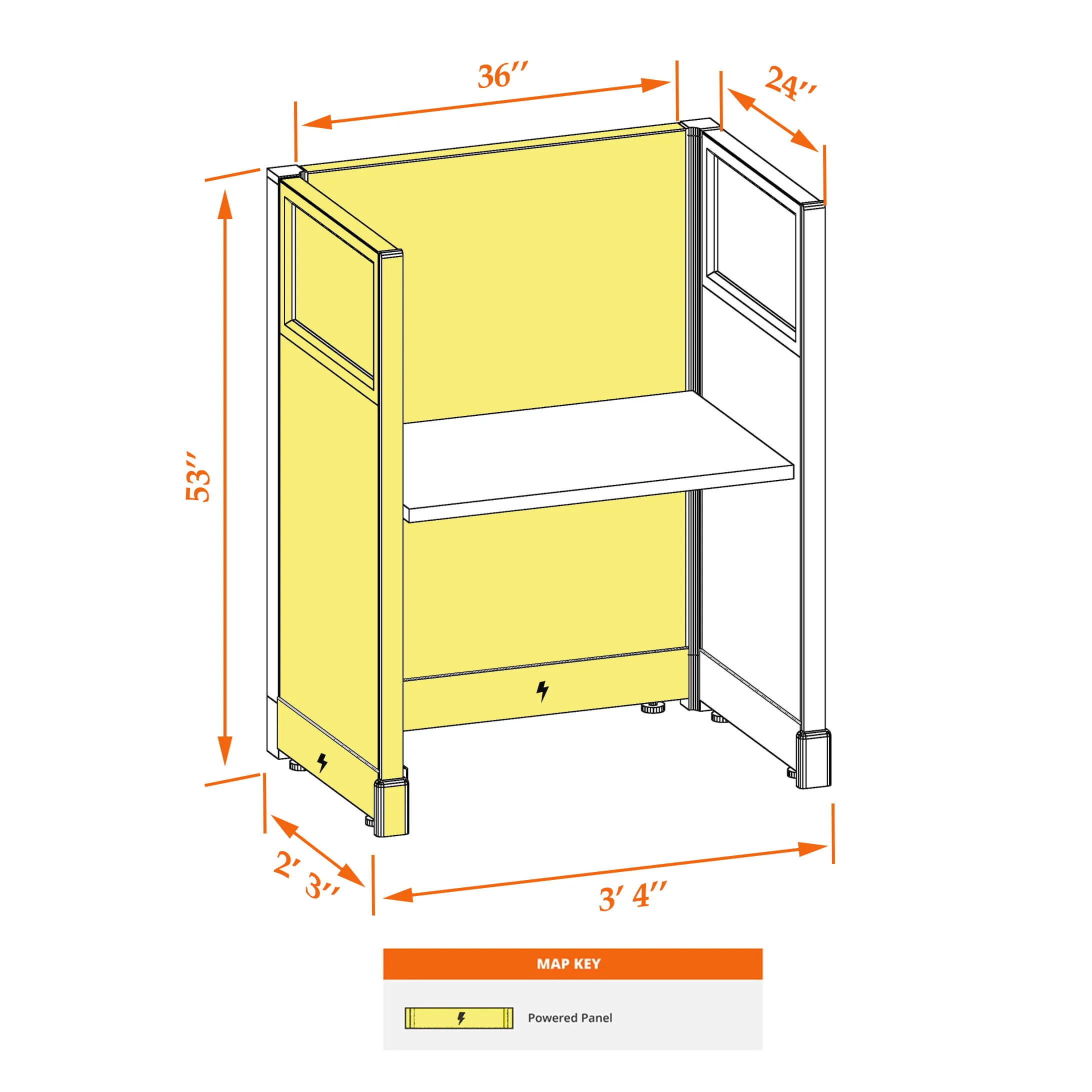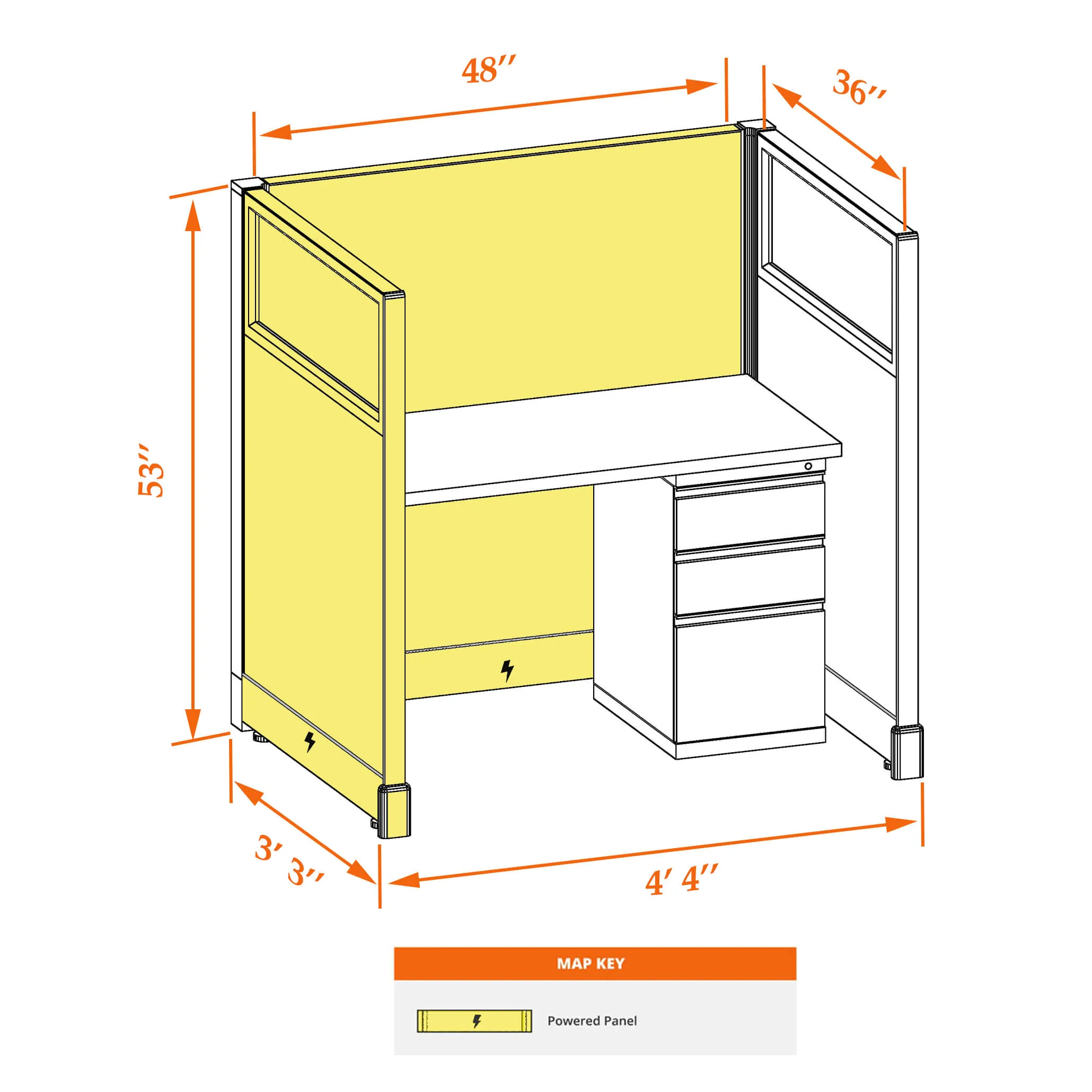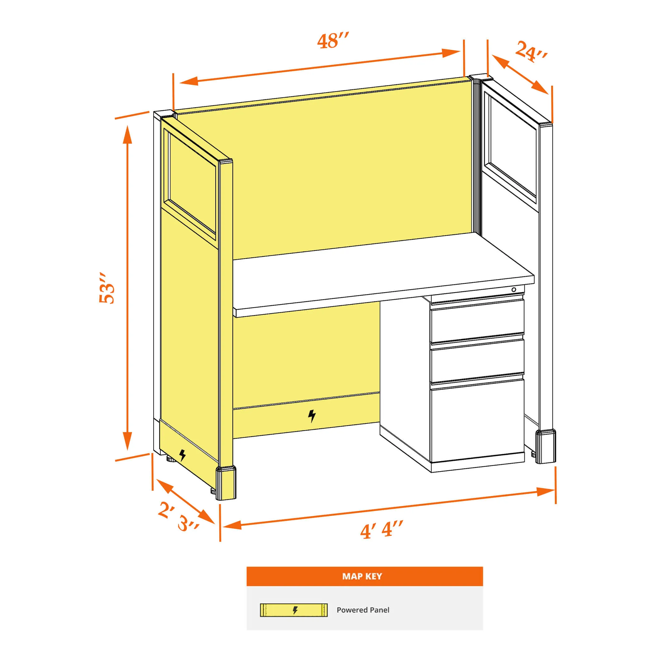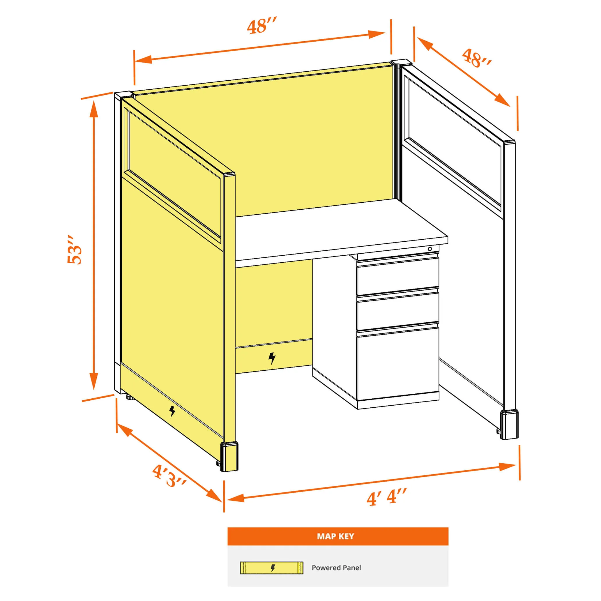 This particular configuration includes 1 cubicle with 53 inch panel height. For workspace area you can choose 2’x4’, 2’x3’, 3’x4’ or 4’x4’ depending on available space. These cubicles are powered, so you can plug your electronic devices directly into the panel power sockets.