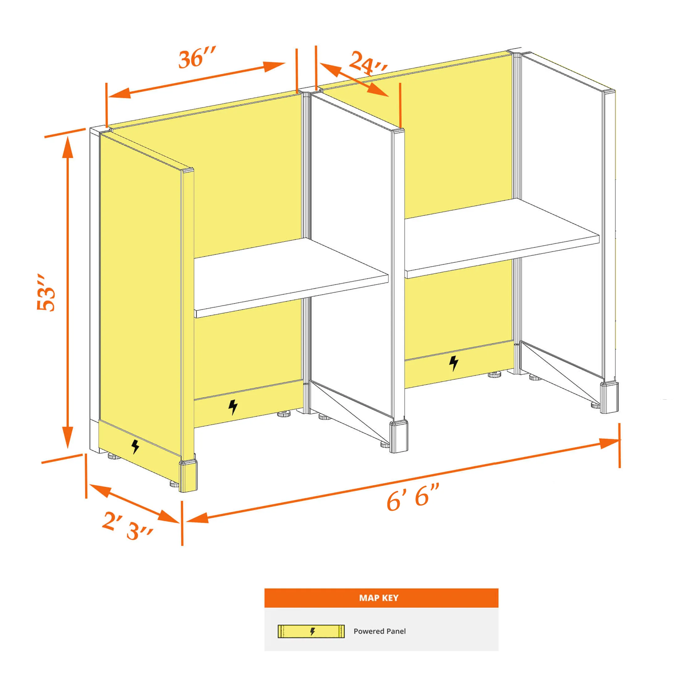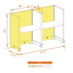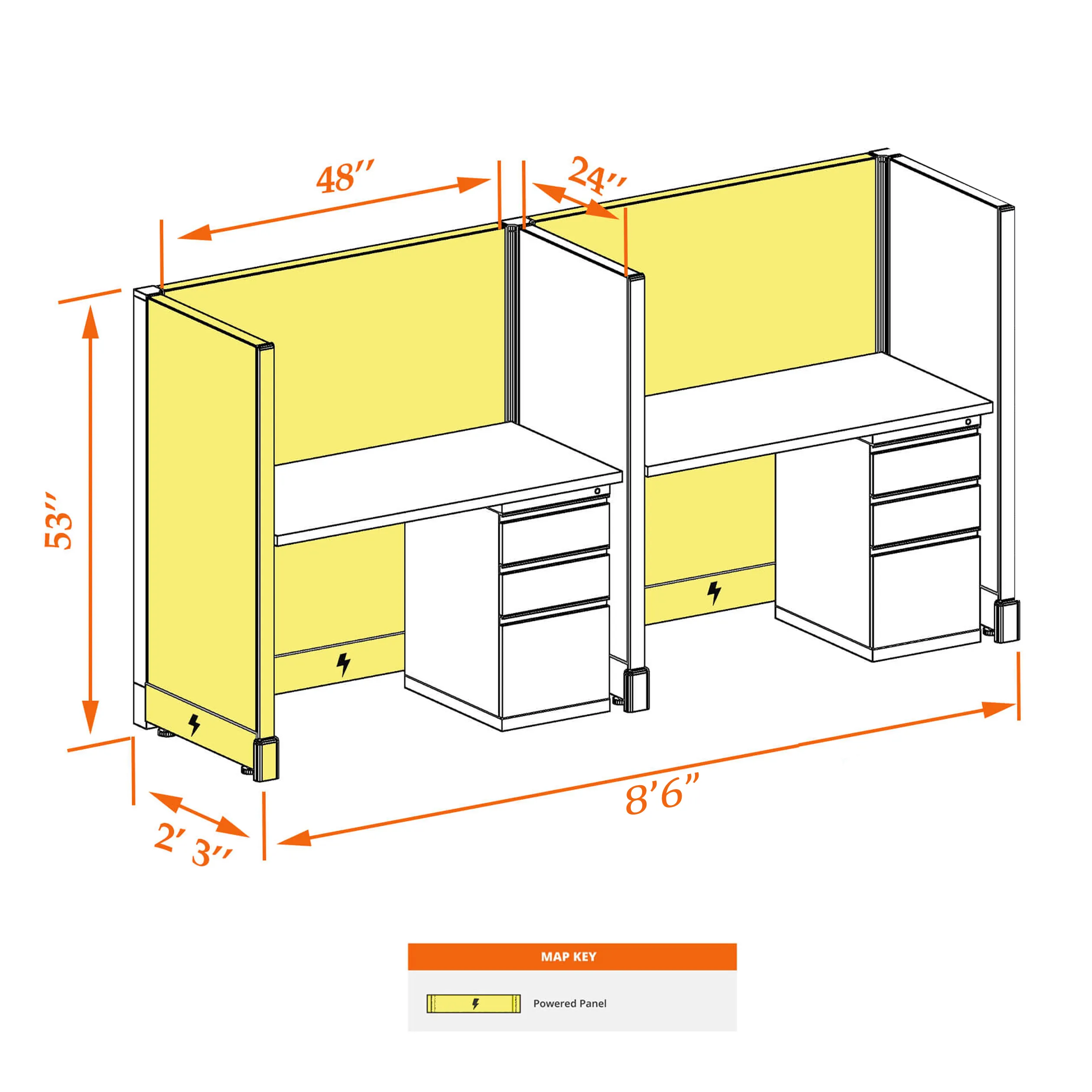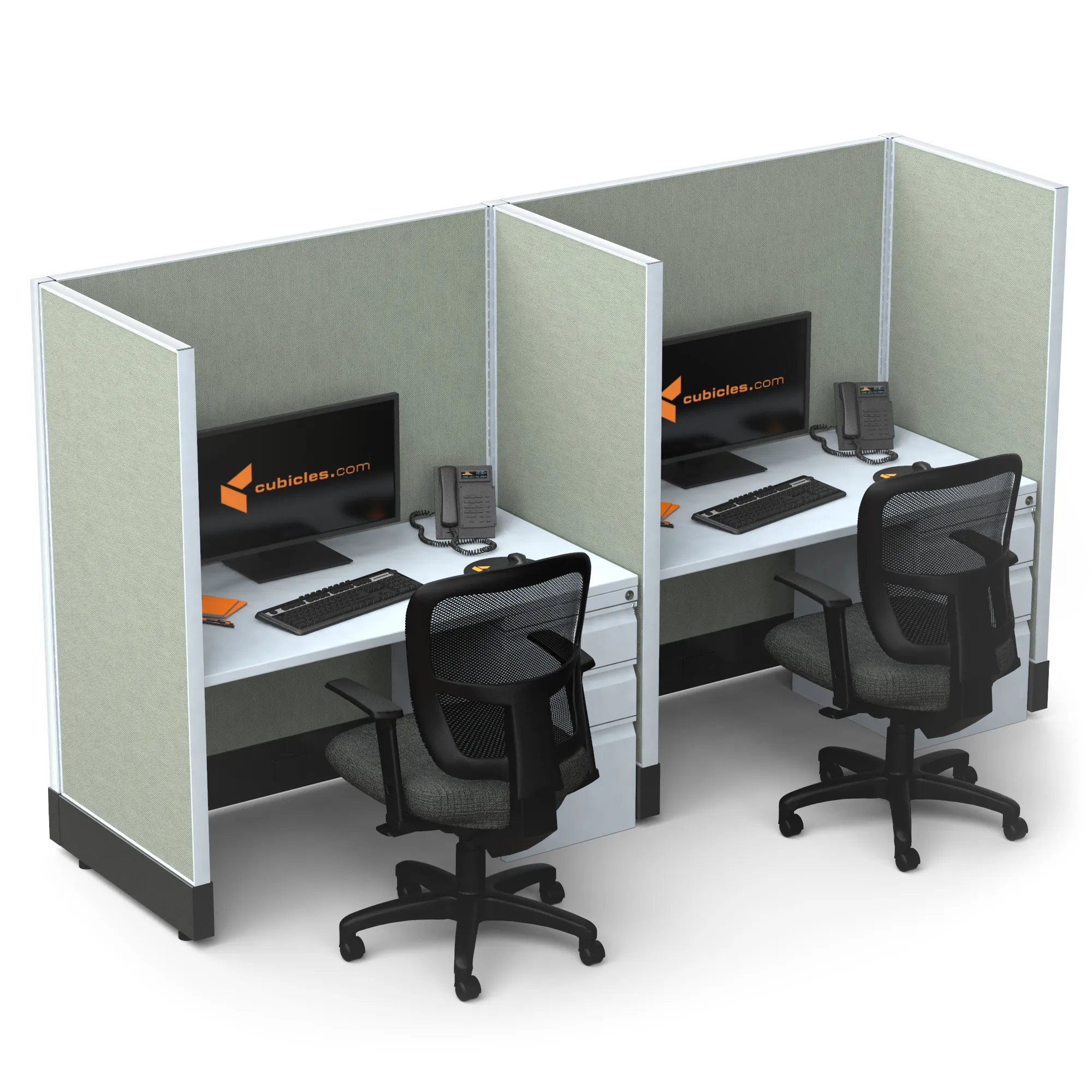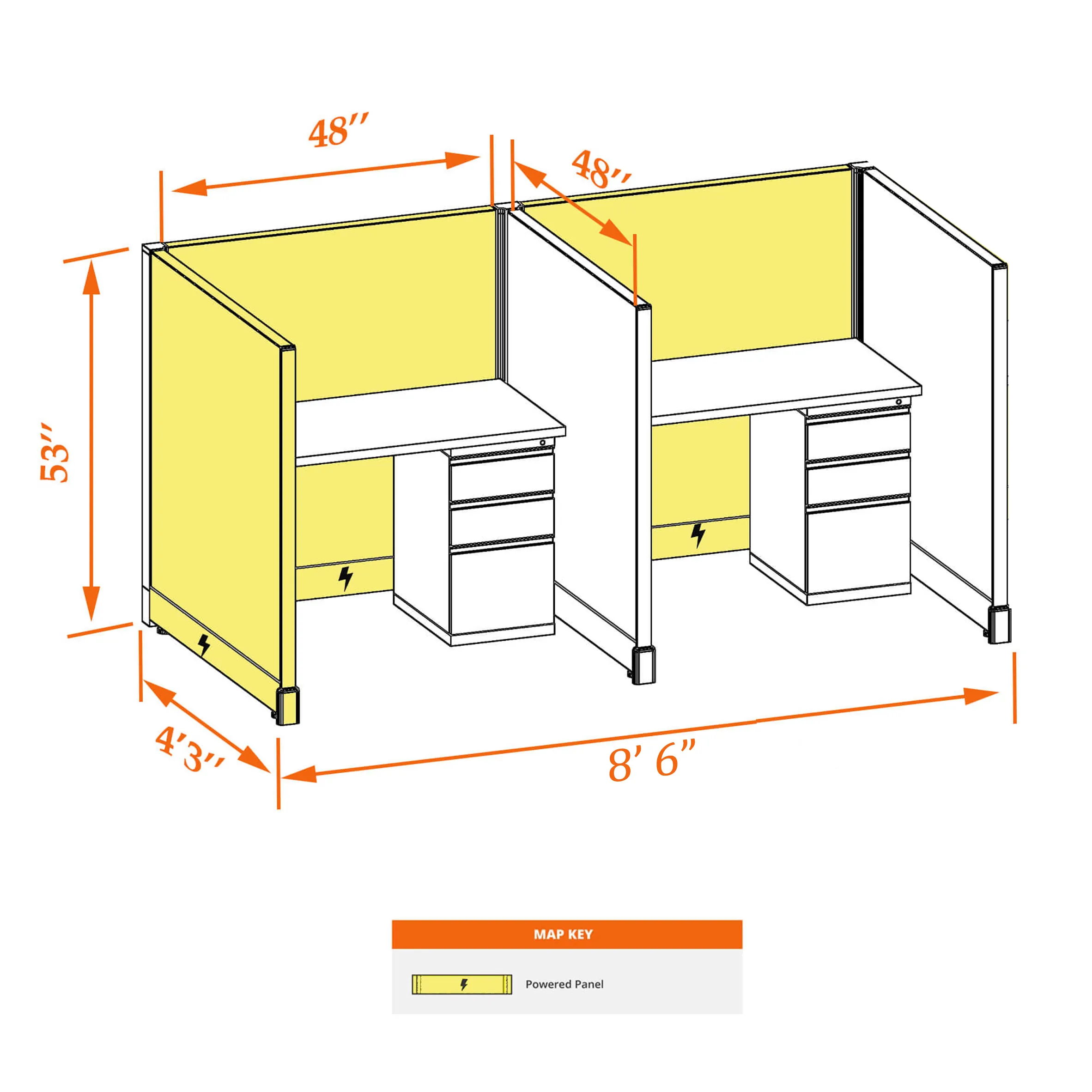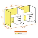 This particular configuration includes 2 cubicle with 53 inch panel height. For workspace area you can choose 2’x4’, 2’x3’, 3’x4’ or 4’x4’ depending on available space. These cubicles are powered, so you can plug your electronic devices directly into the panel power sockets.