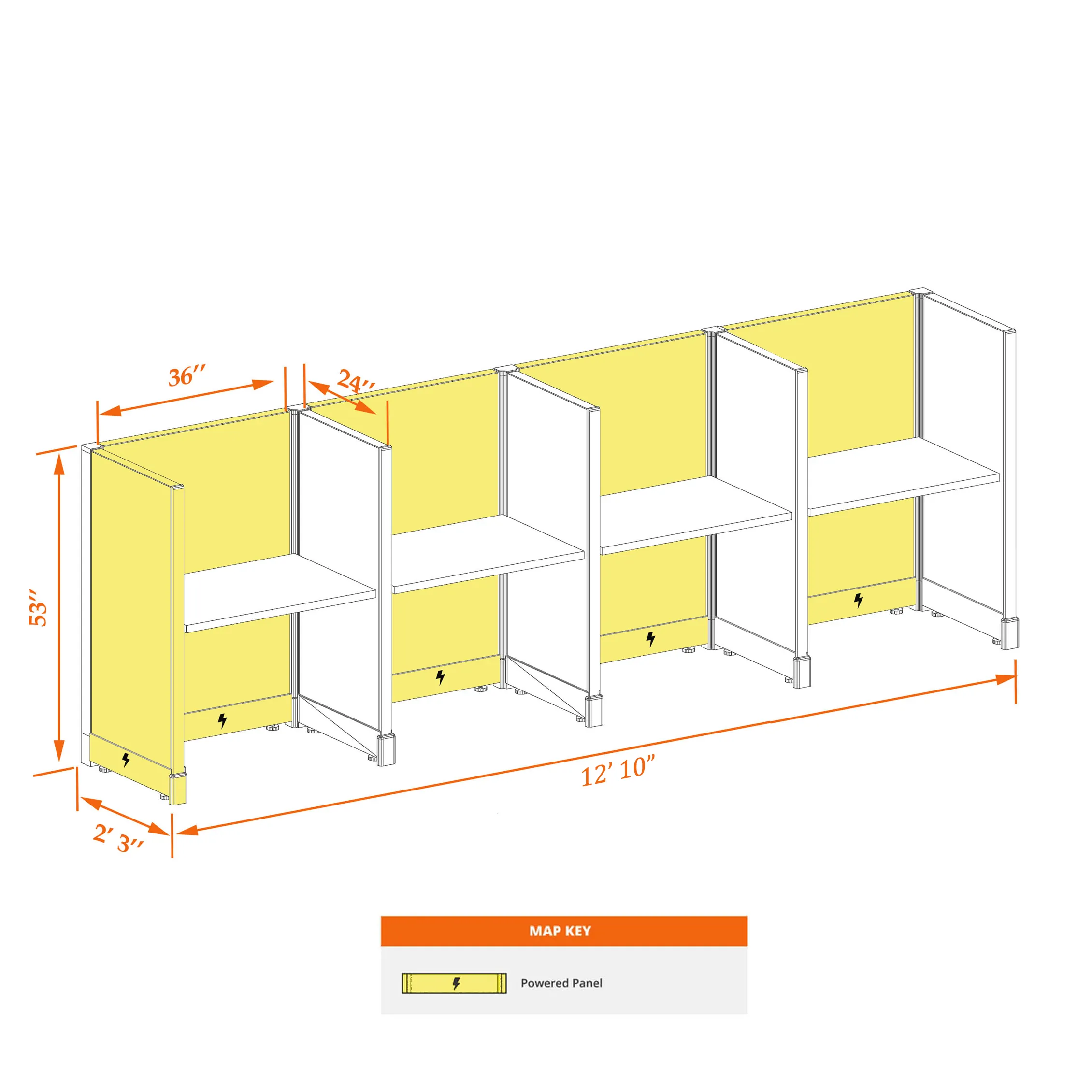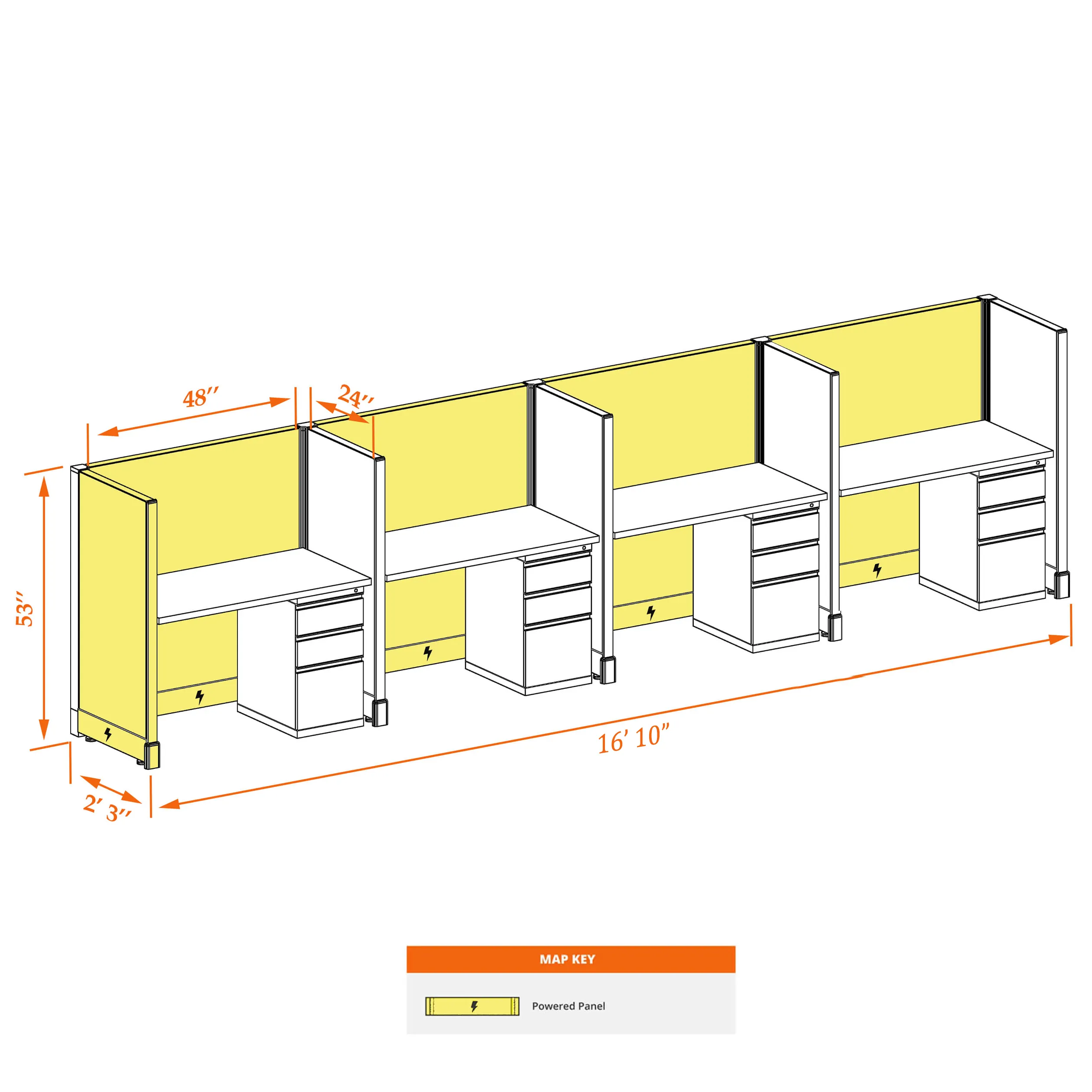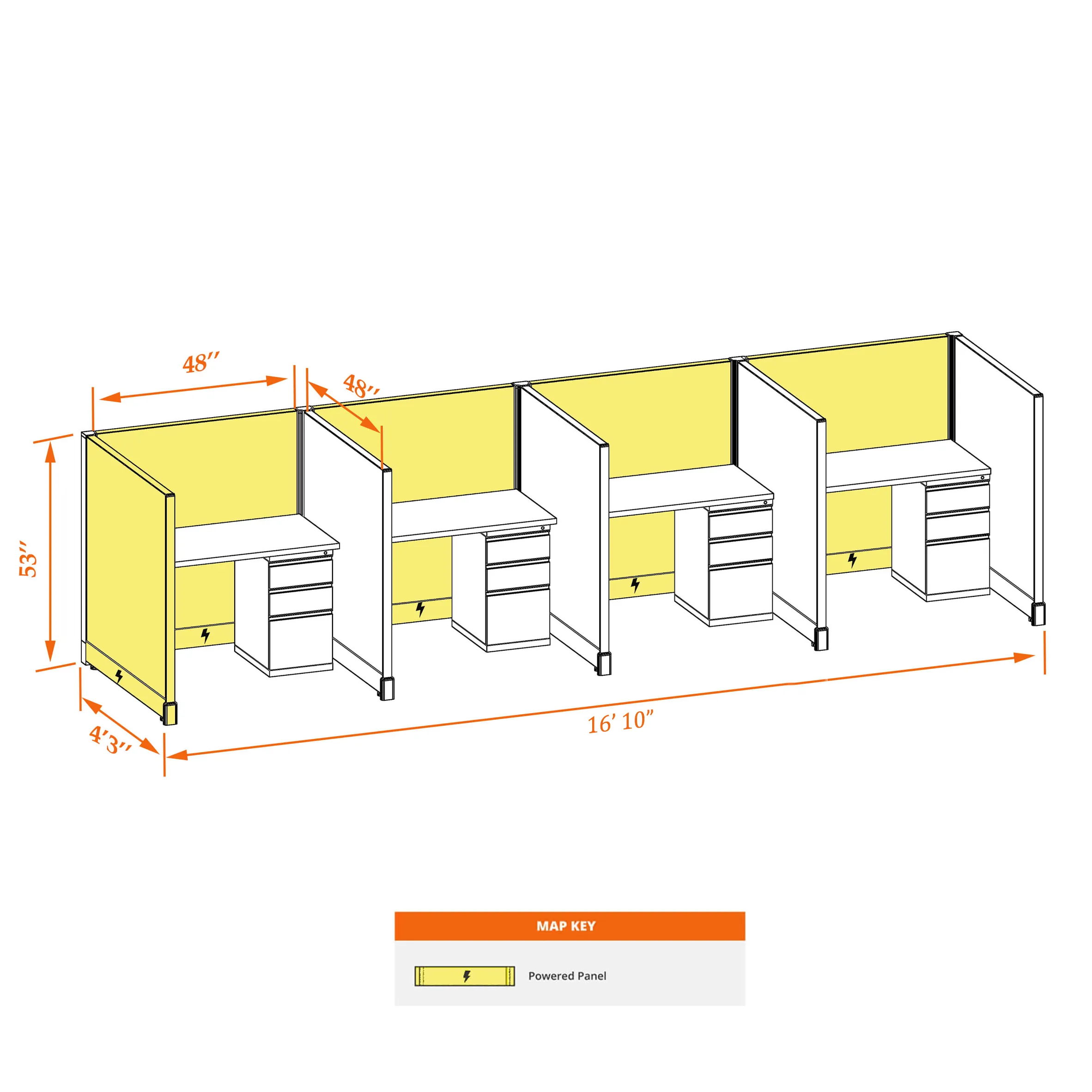 This particular configuration includes 4 cubicle with 53 inch panel height. For workspace area you can choose 2’x4’, 2’x3’, 3’x4’ or 4’x4’ depending on available space. These cubicles are powered, so you can plug your electronic devices directly into the panel power sockets.