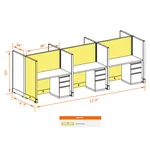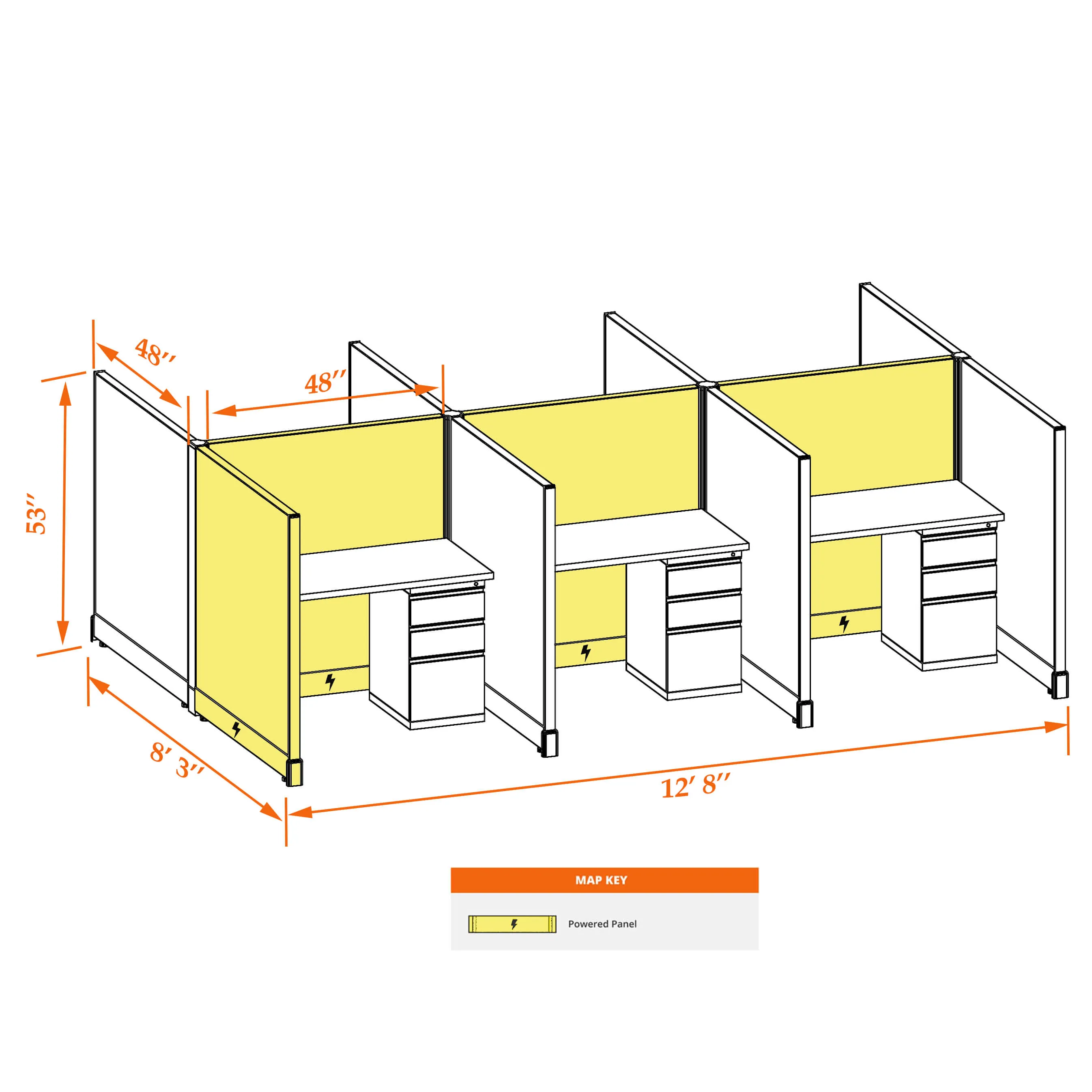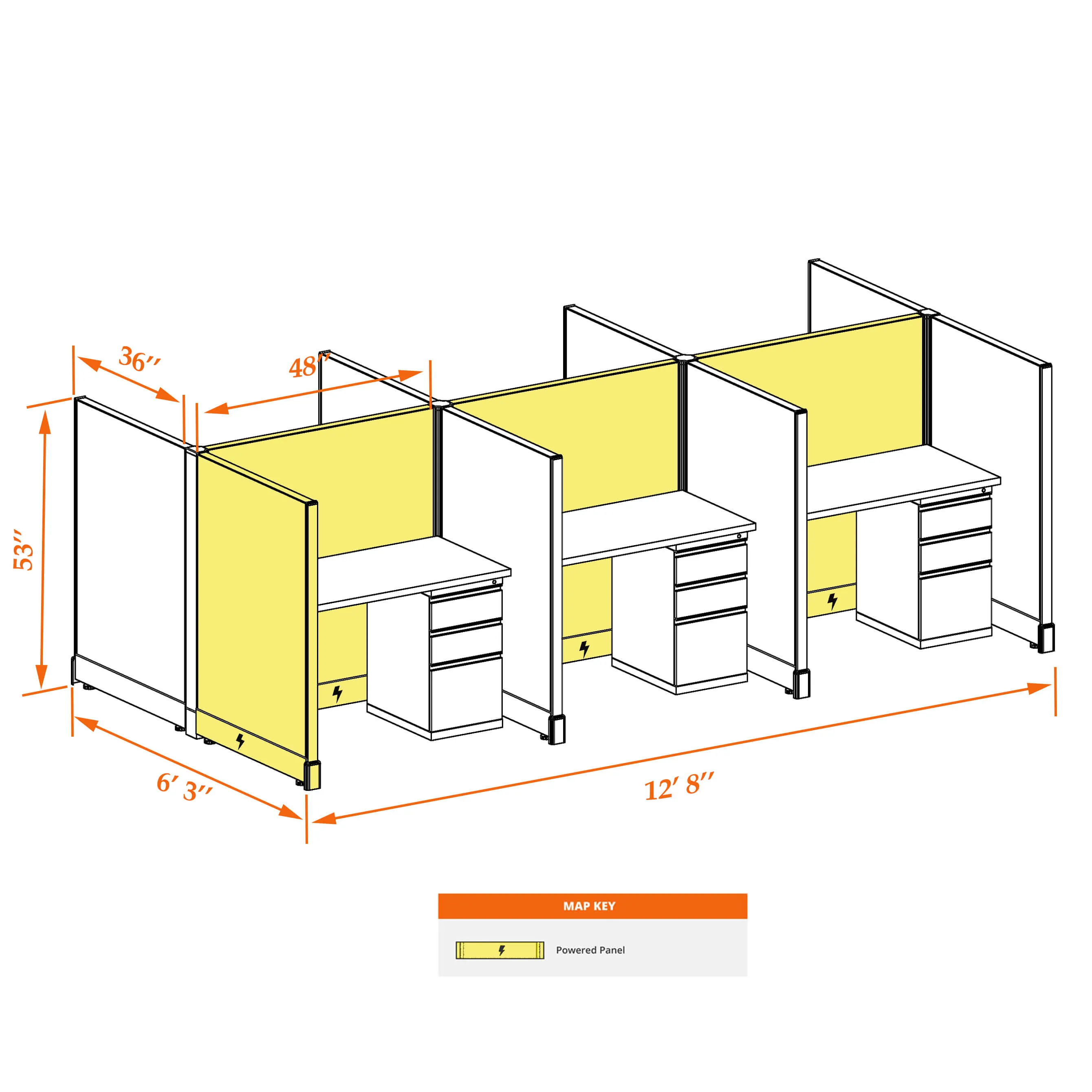 This particular configuration includes 6 cubicle with 53 inch panel height. For workspace area you can choose 2’x4’, 2’x3’, 3’x4’ or 4’x4’ depending on available space. These cubicles are powered, so you can plug your electronic devices directly into the panel power sockets.