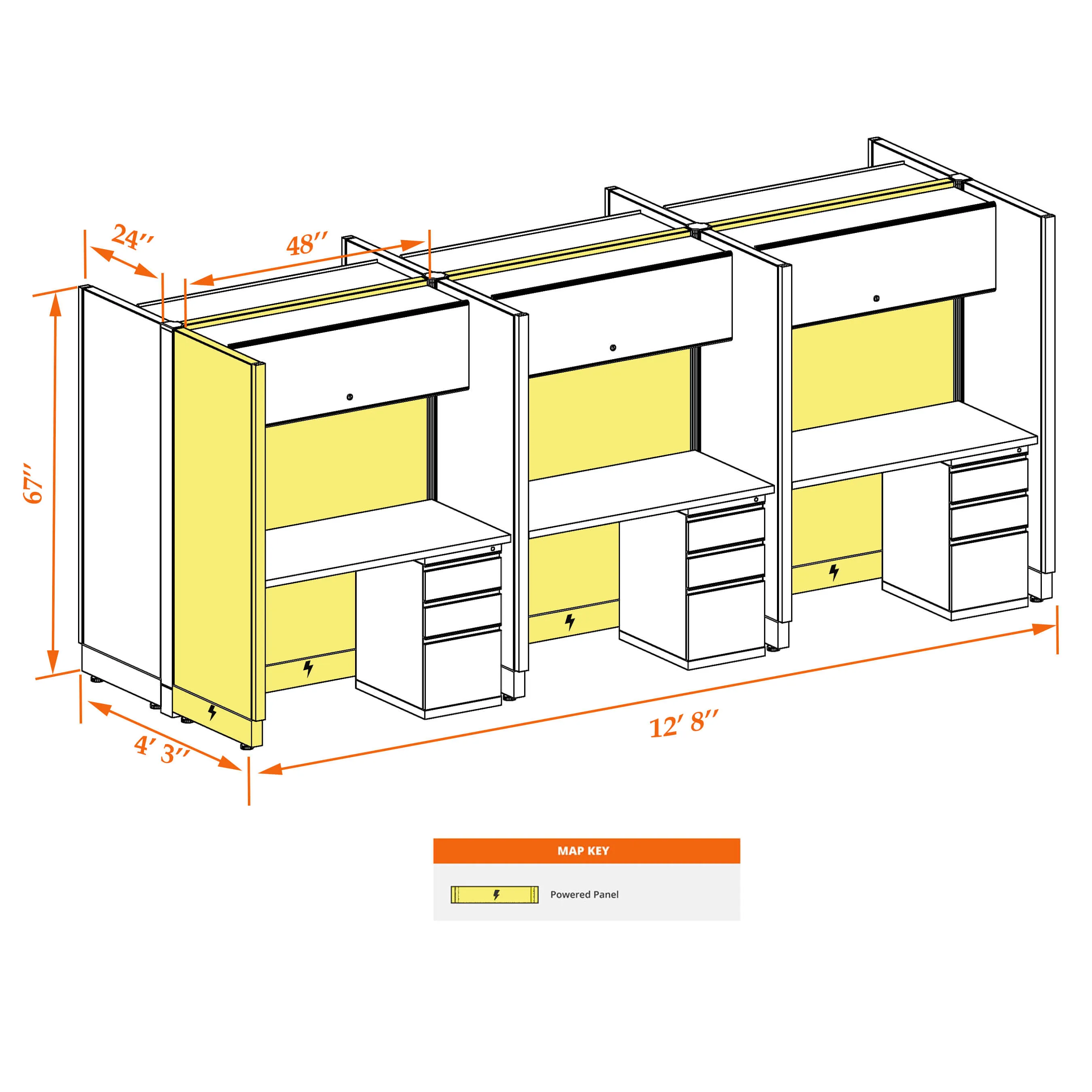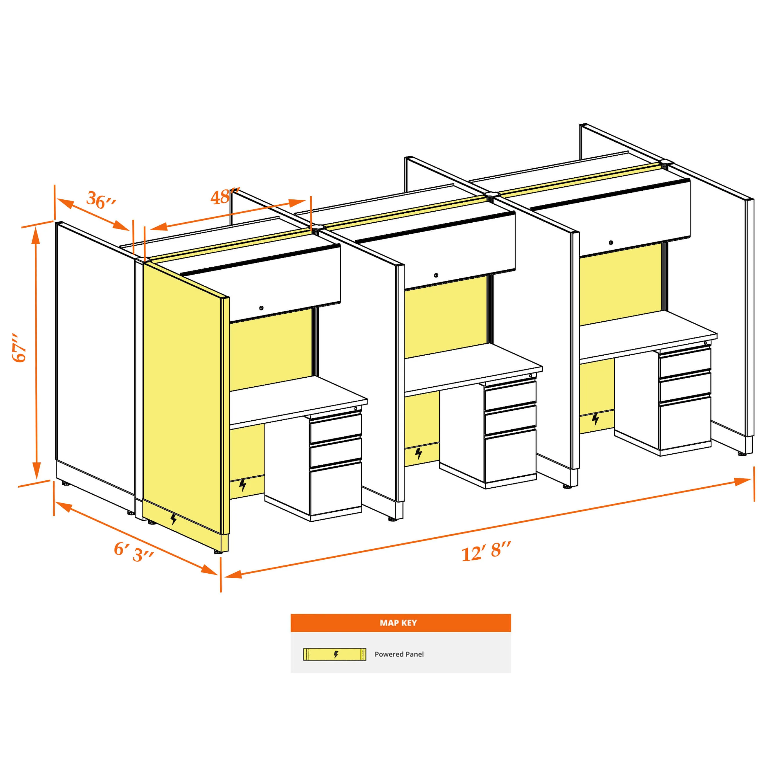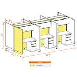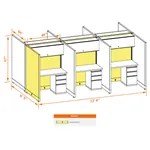 This particular configuration includes 6 cubicle with 67 inch panel height. For workspace area you can choose 4’W desks with 2, 3, or 4’D side panels, depending on the size of your office space. For very small offices that need to fit as many people as possible, we also offer 3’W desks with 2’D side panels. These cubicles are powered, so you can plug your electronic devices directly into the panel power sockets.