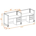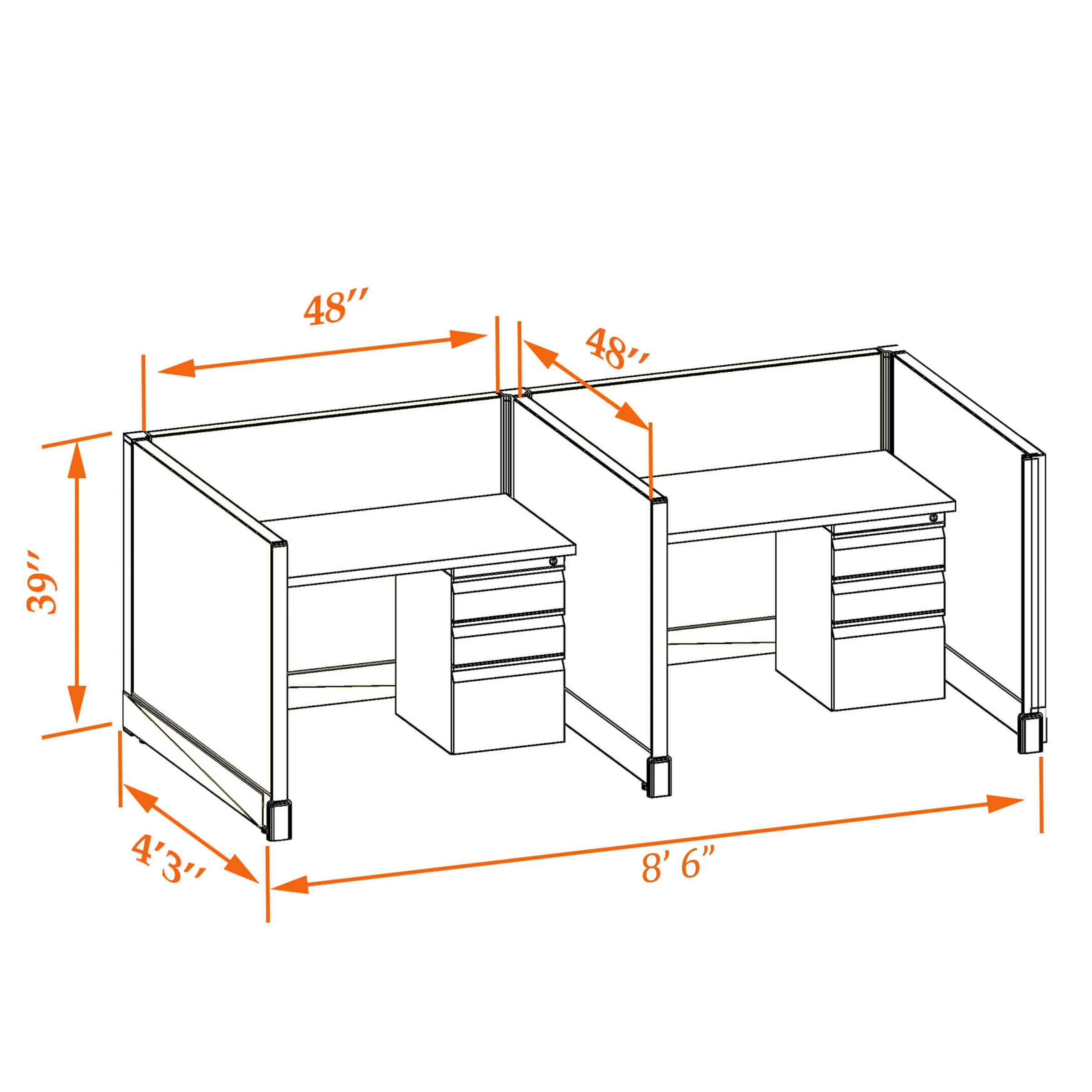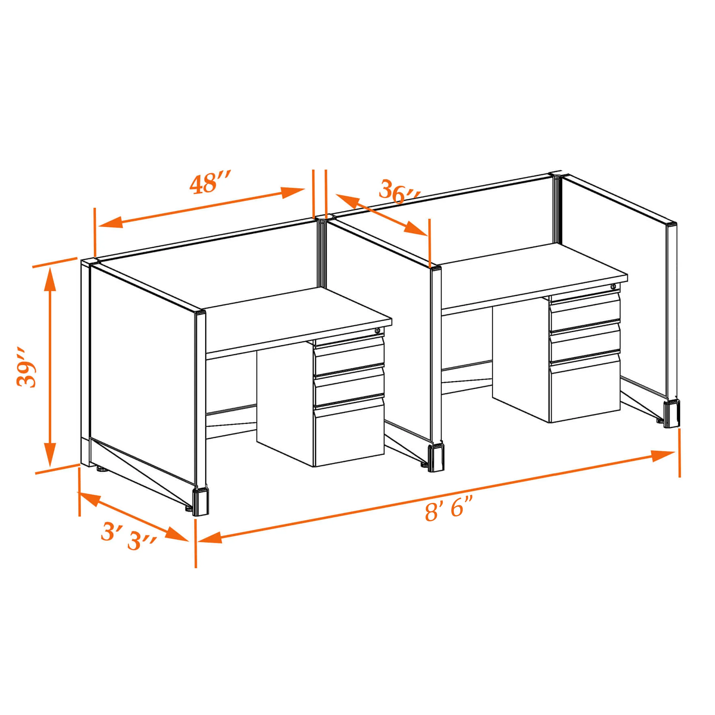 This particular configuration includes 2 cubicle with 39 inch panel height. For workspace area you can choose 2’x4’, 2’x3’, 3’x4’ or 4’x4’ depending on the size of your office space.