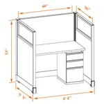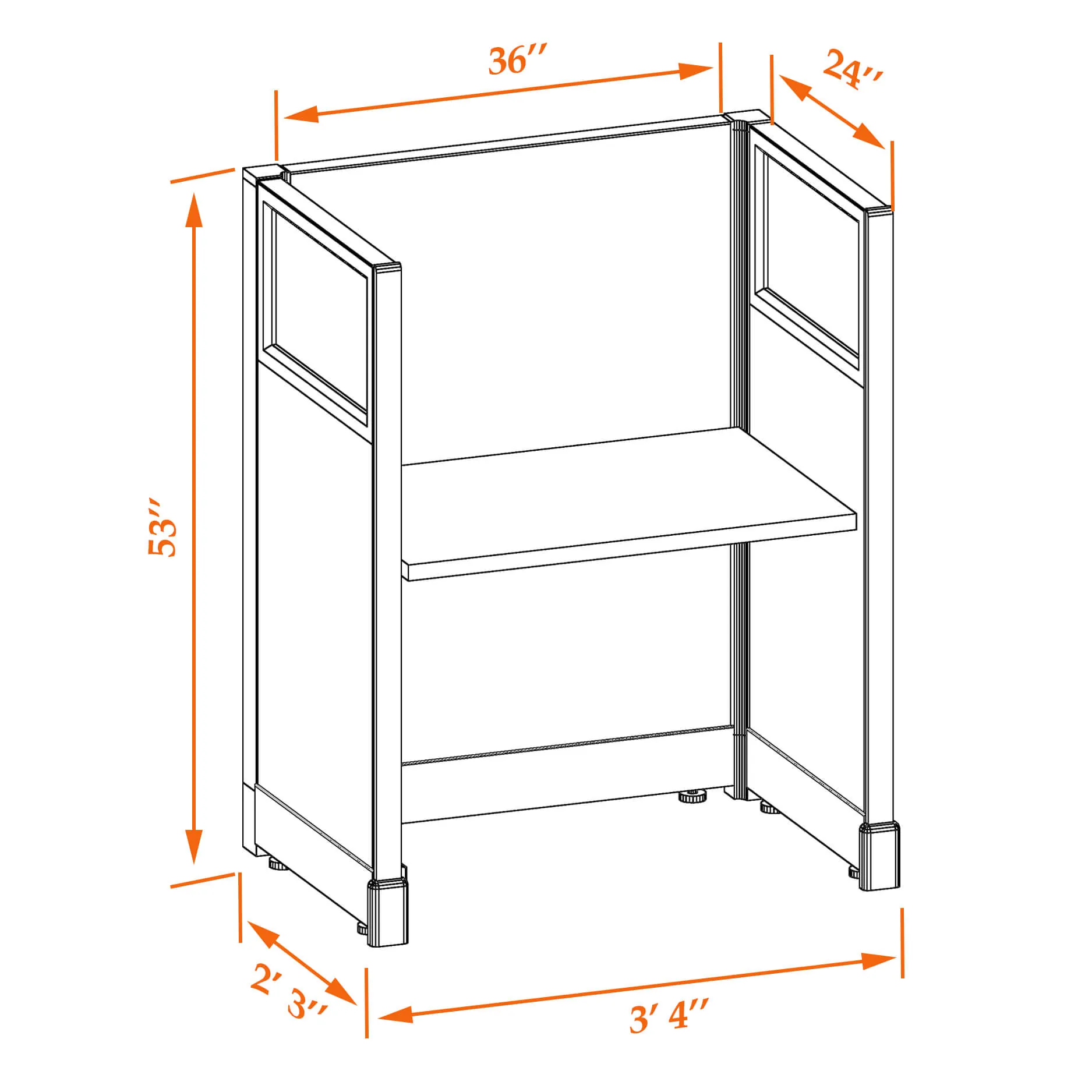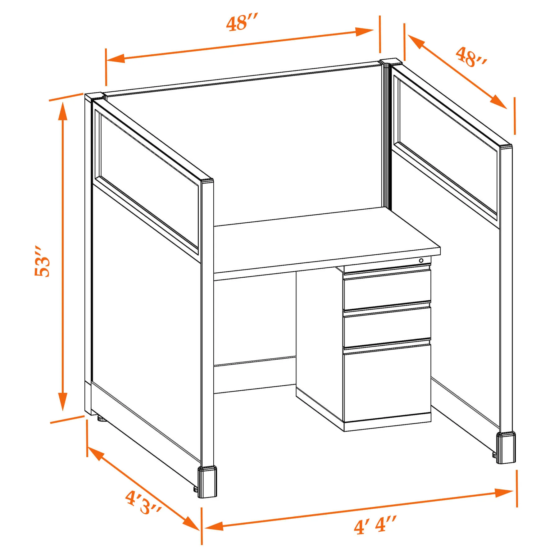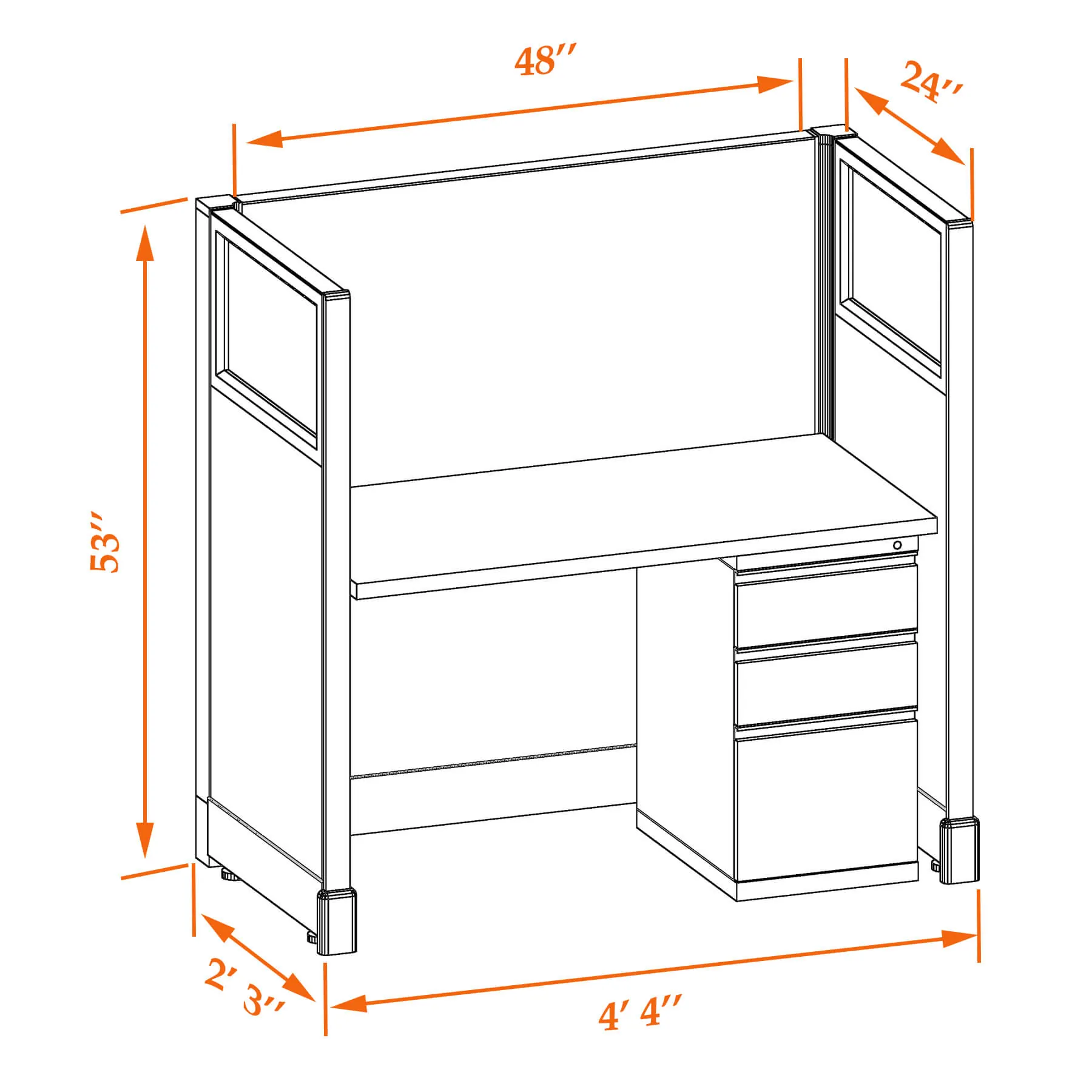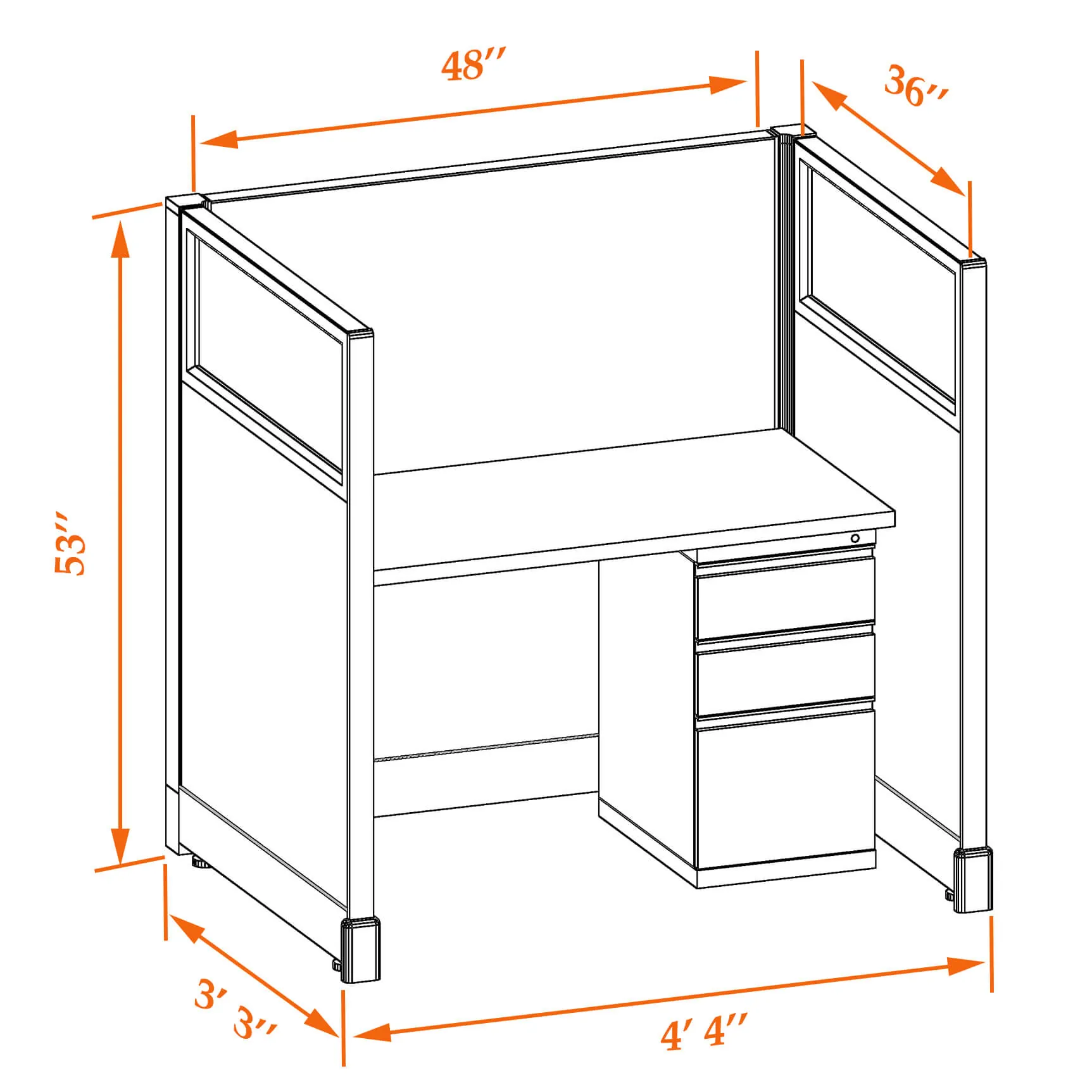 This particular configuration includes 1 cubicle with 53 inch panel height. For workspace area you can choose 2’x4’, 2’x3’, 3’x4’ or 4’x4’ depending on the size of your office space.