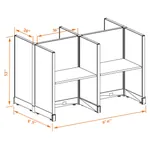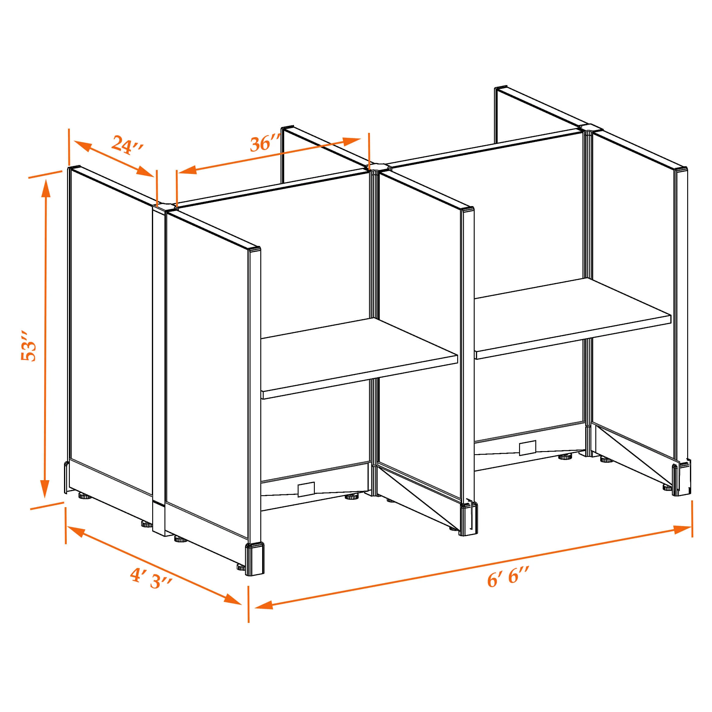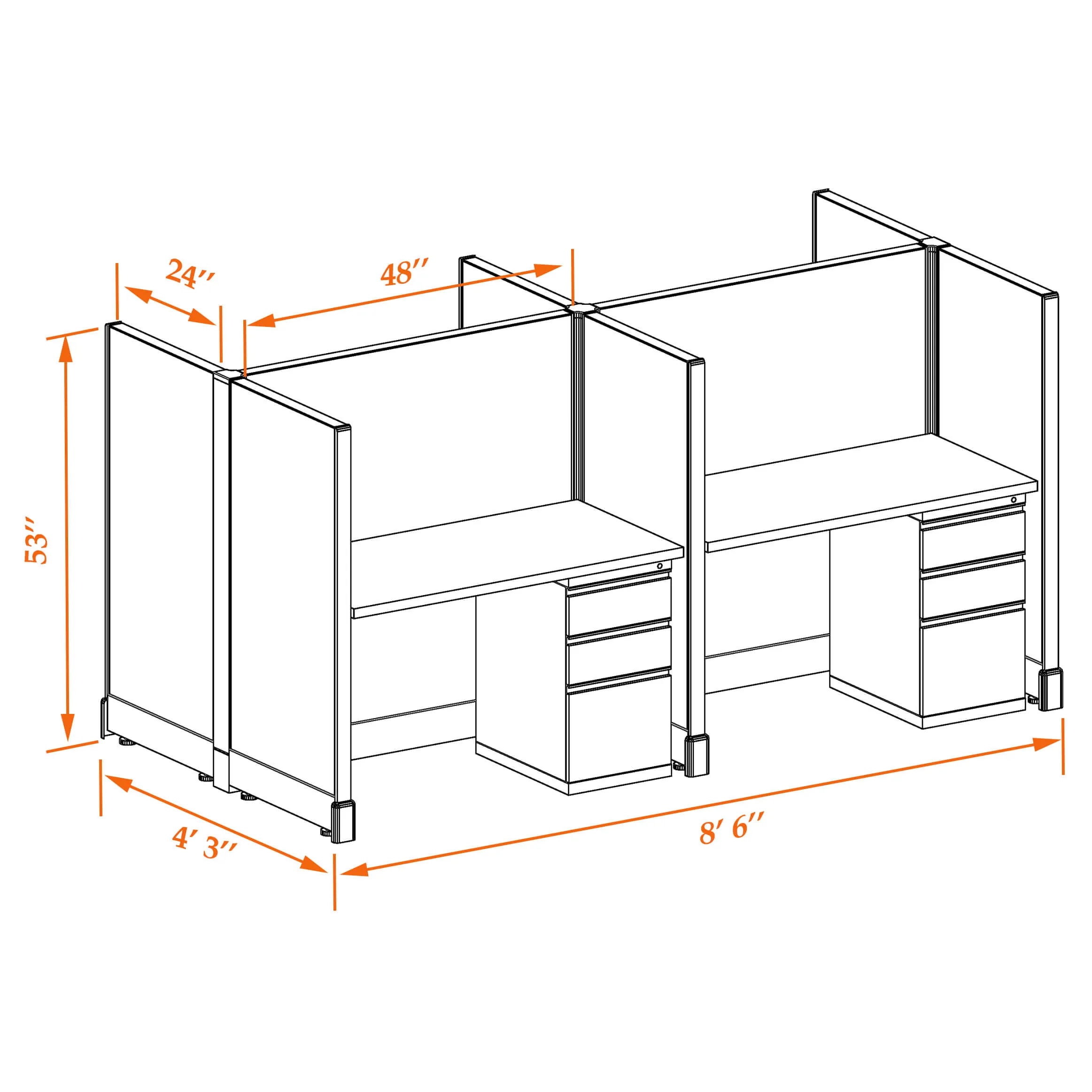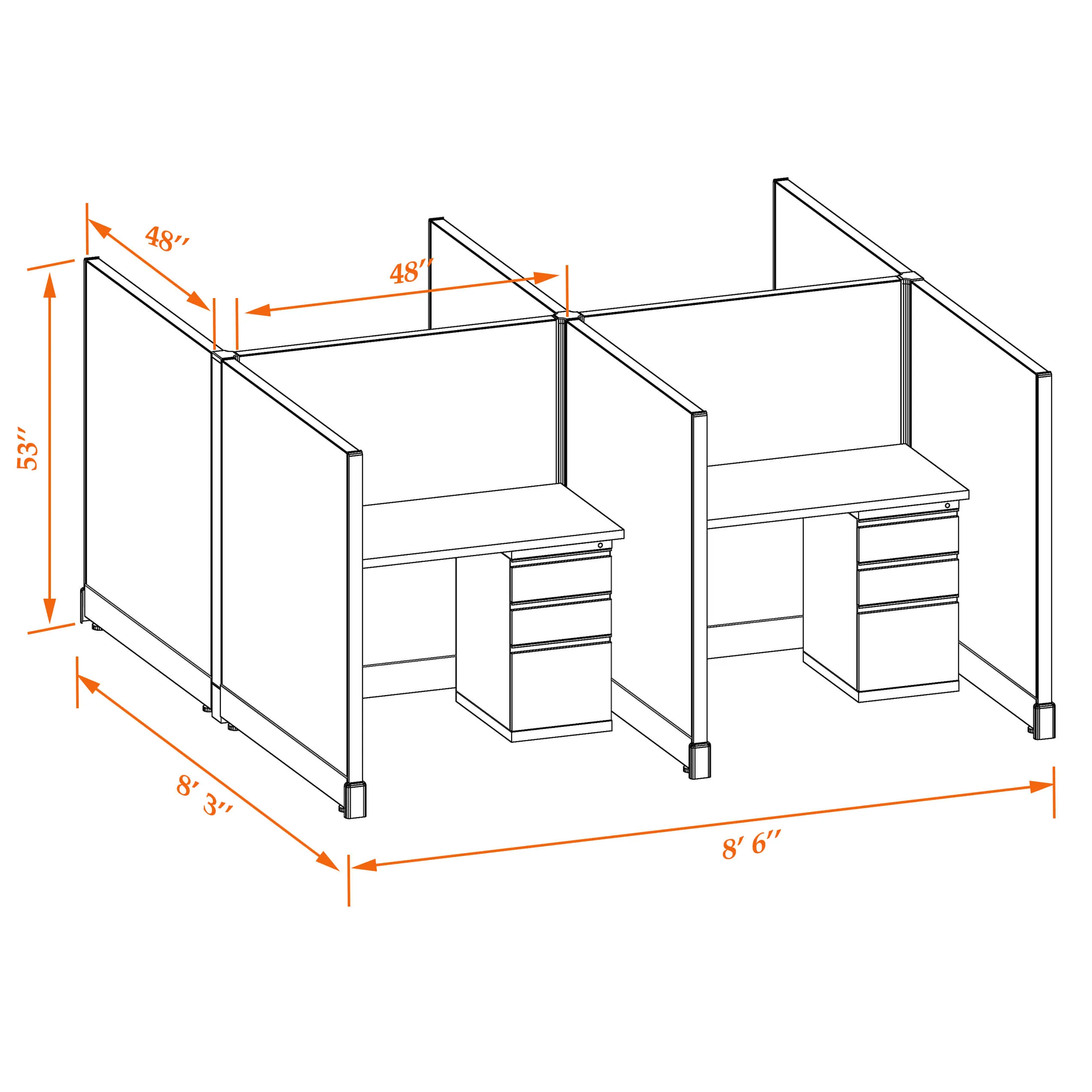This particular configuration includes 4 cubicles with 53 inch panel height. For workspace area you can choose 4’W desks with 2, 3, or 4’D side panels, depending on the size of your office space. For very small offices that need to fit as many people as possible, we also offer 3’W desks with 2’D side panels.