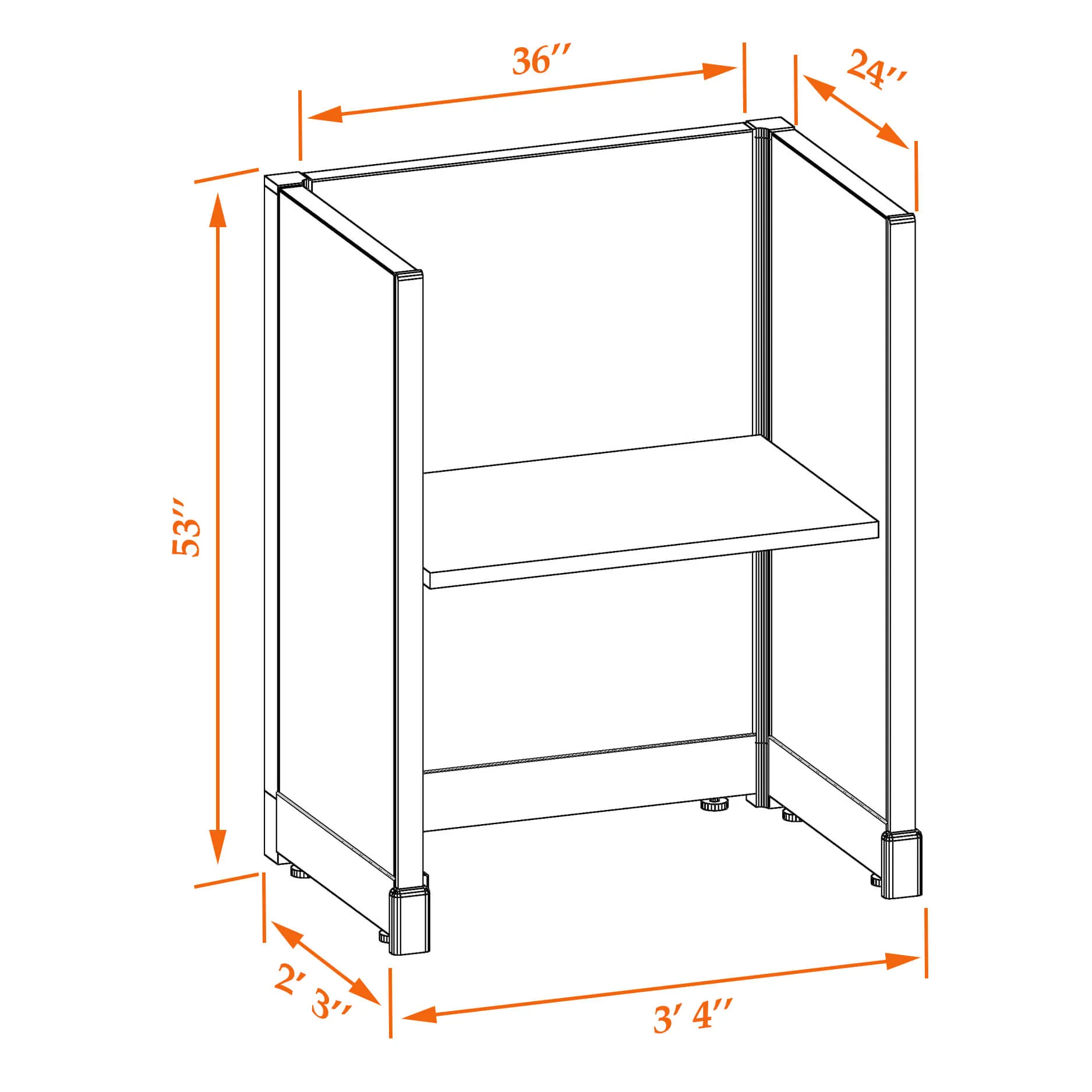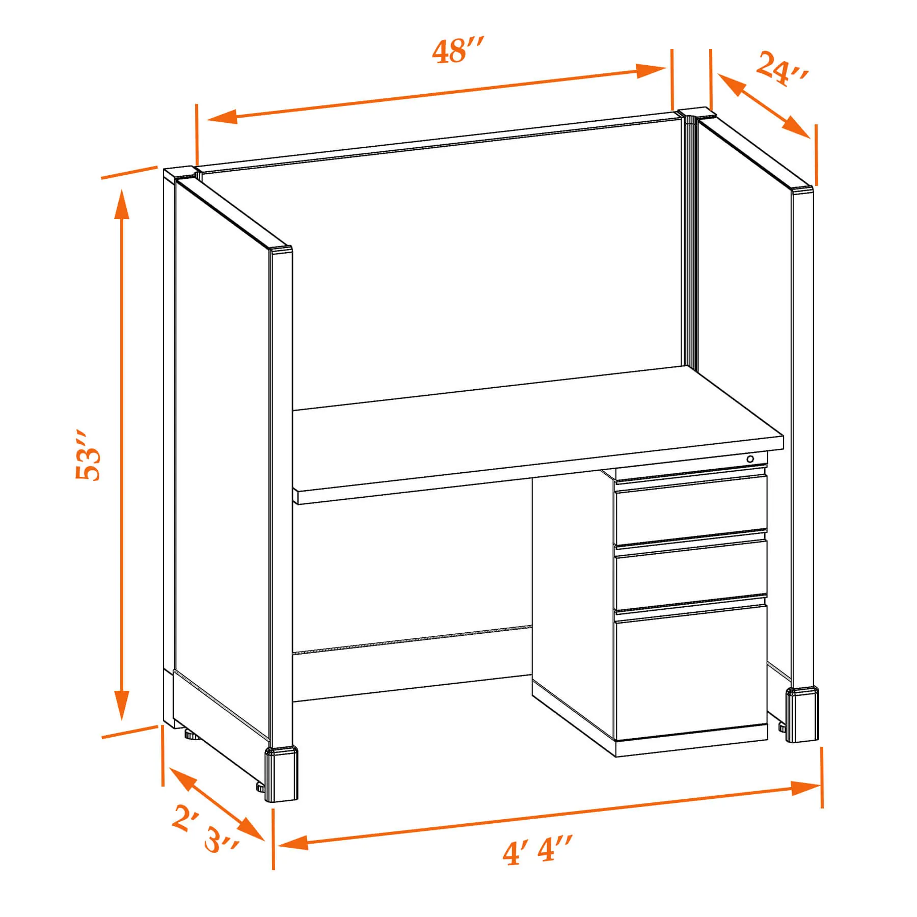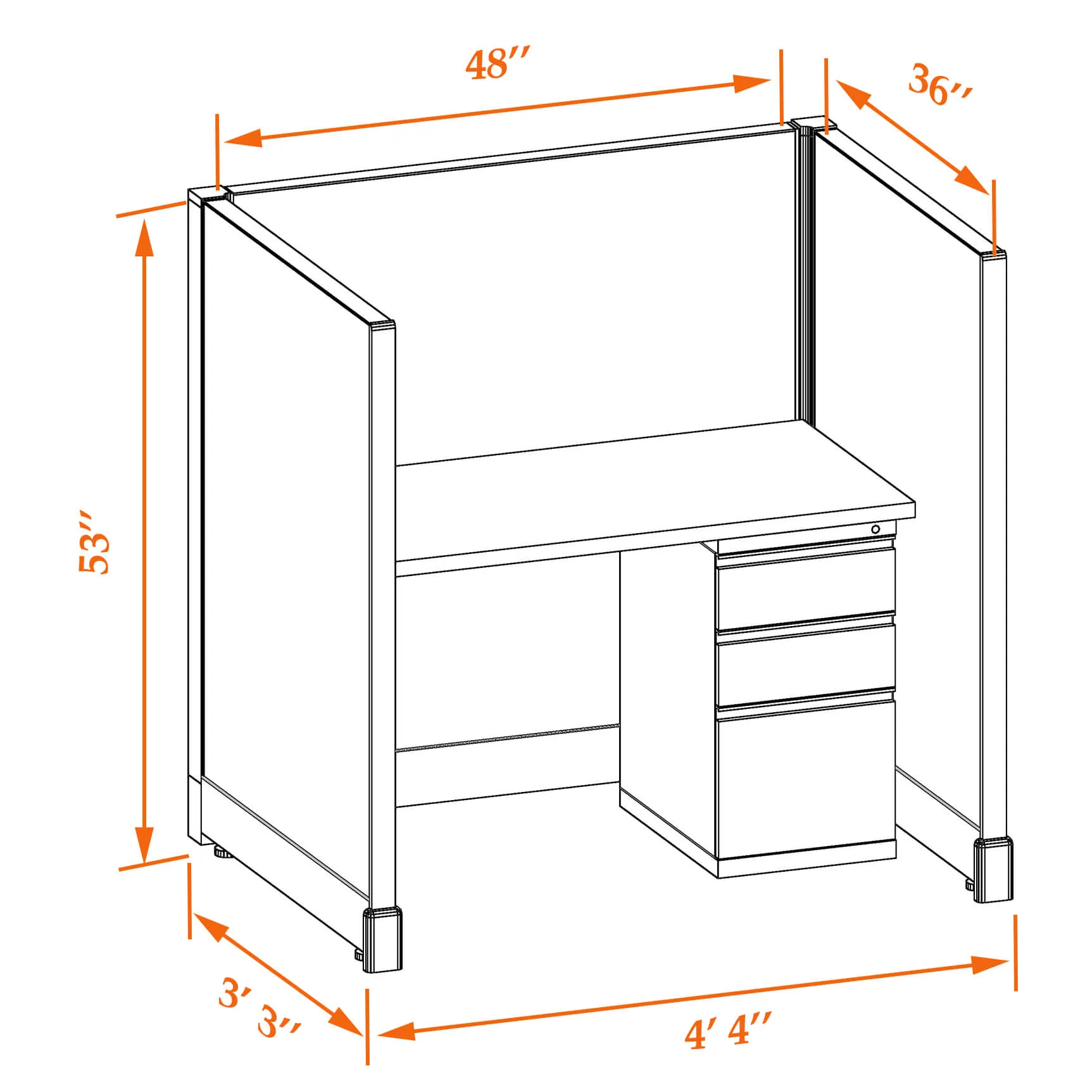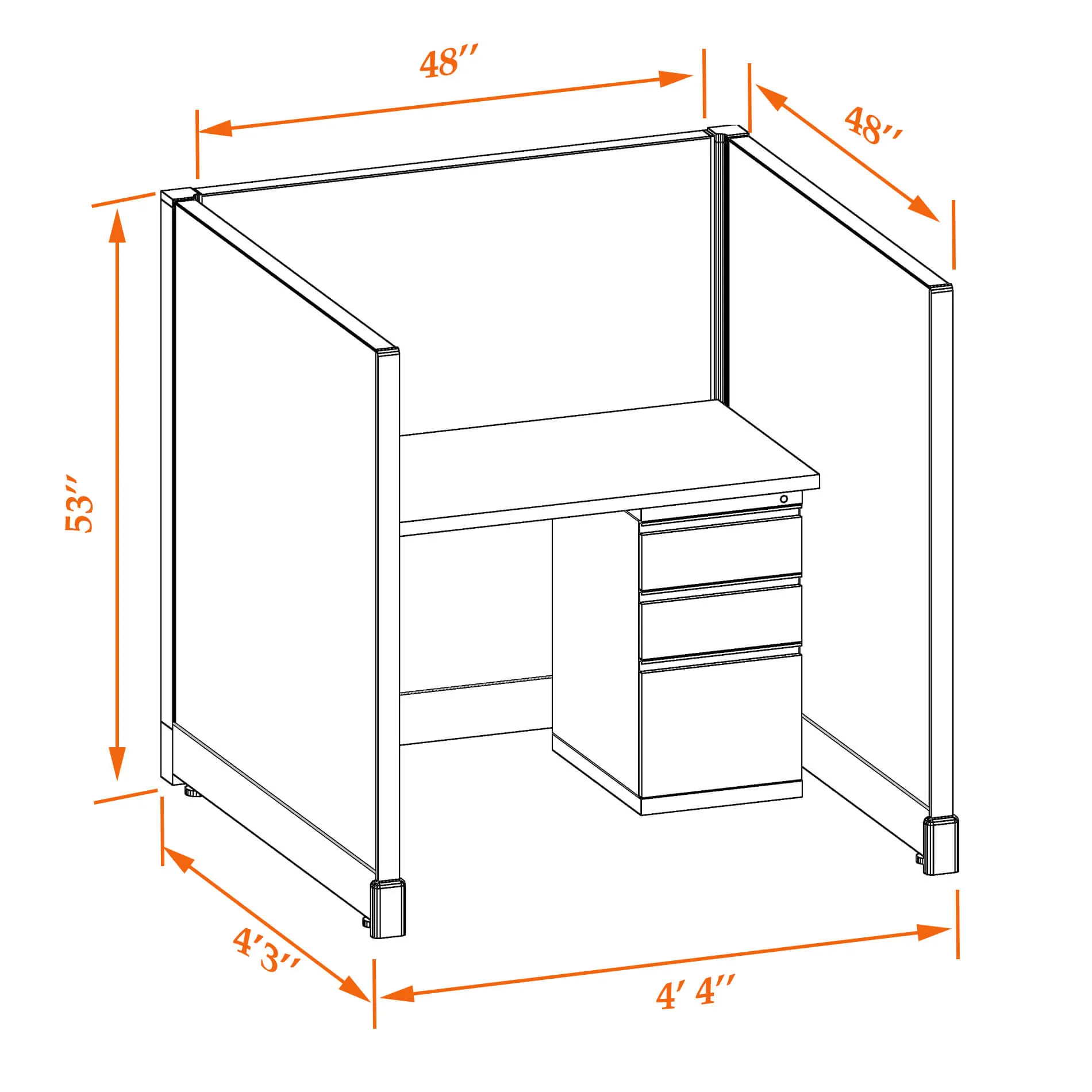 This particular configuration includes 1 cubicle with 53 inch panel height. For workspace area you can choose 2’x4’, 2’x3’, 3’x4’ or 4’x4’ depending on the size of your office space.