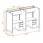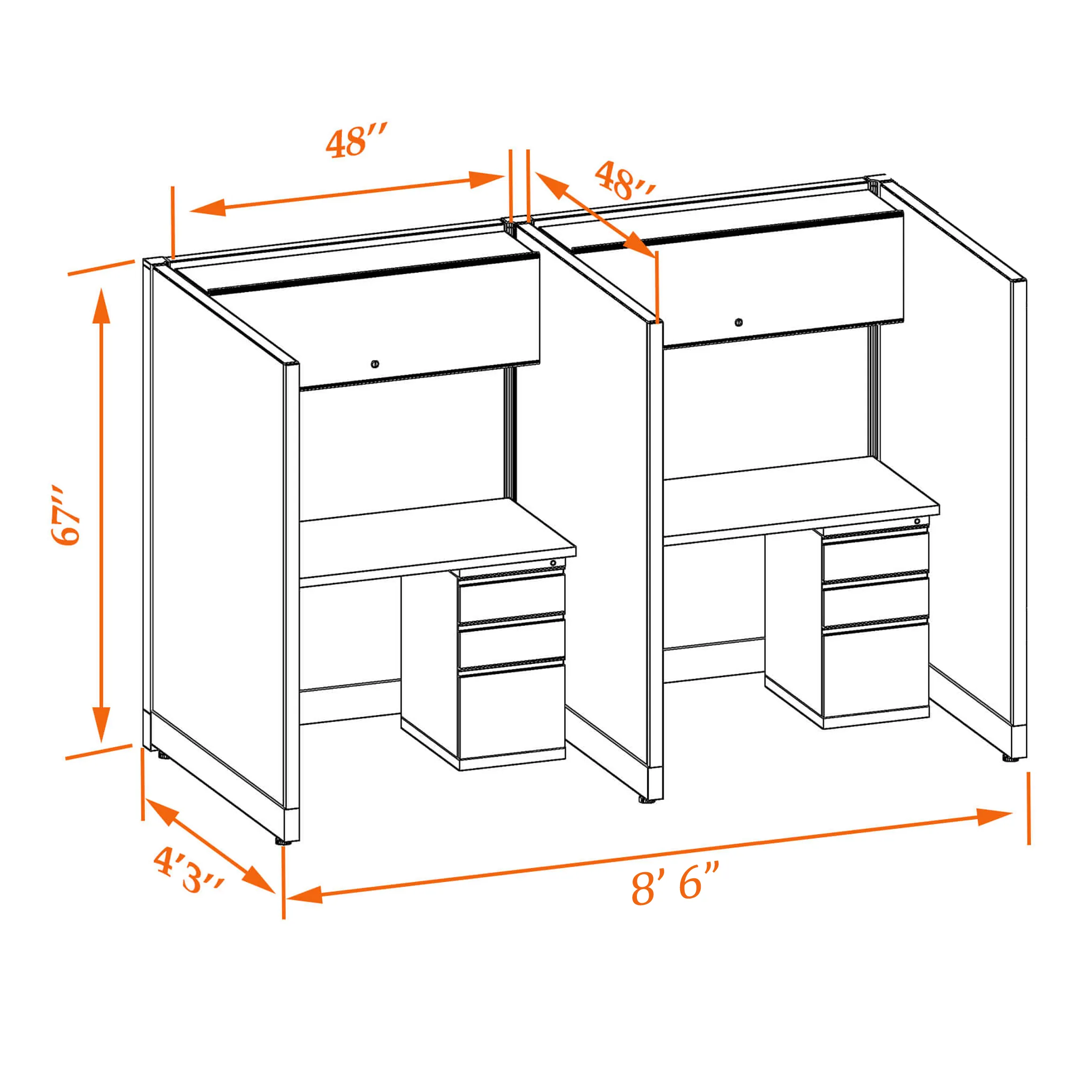 This particular configuration includes 2 cubicle with 67 inch panel height. For workspace area you can choose 4’W desks with 2, 3, or 4’D side panels, depending on the size of your office space. For very small offices that need to fit as many people as possible, we also offer 3’W desks with 2’D side panels.